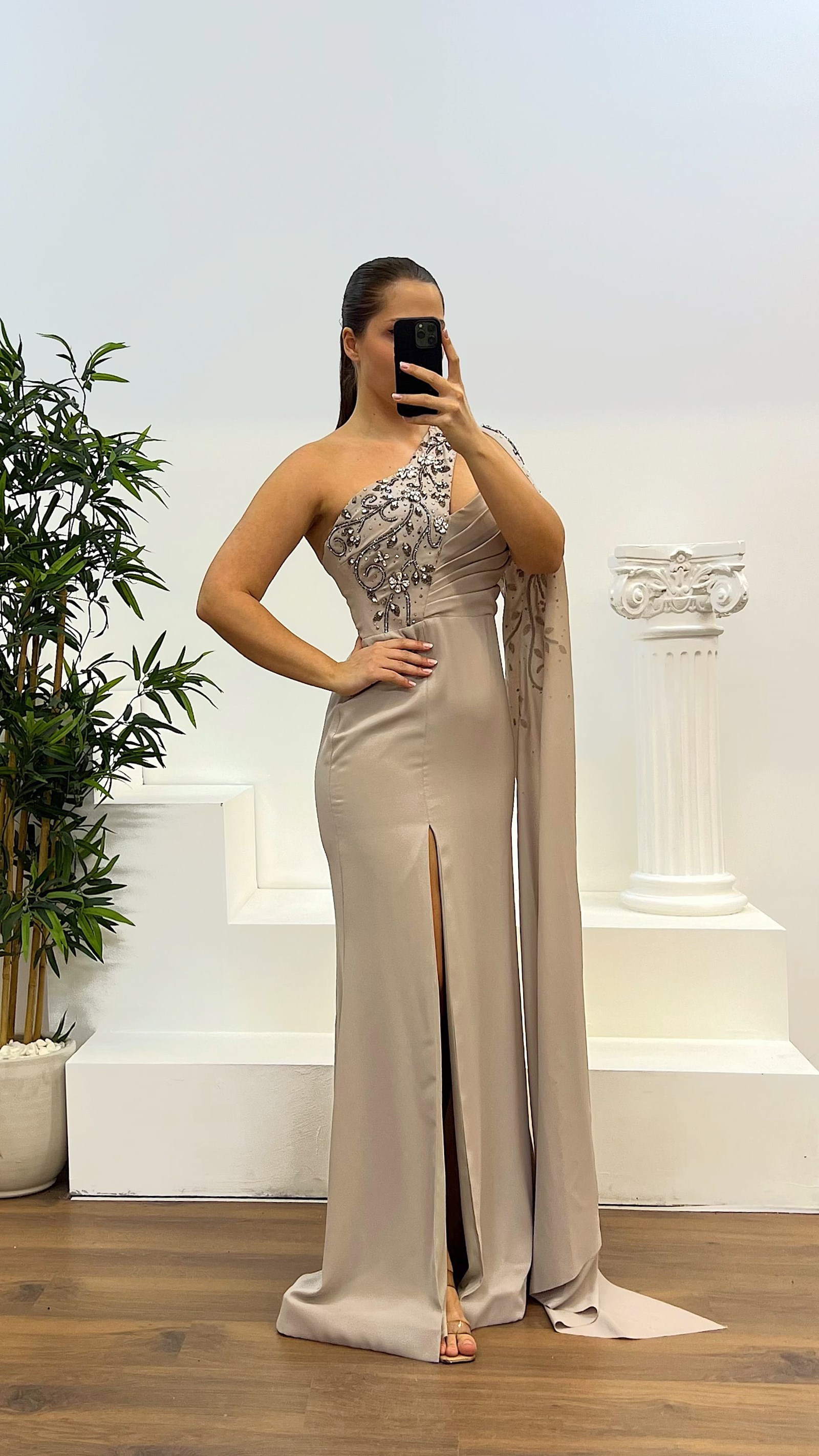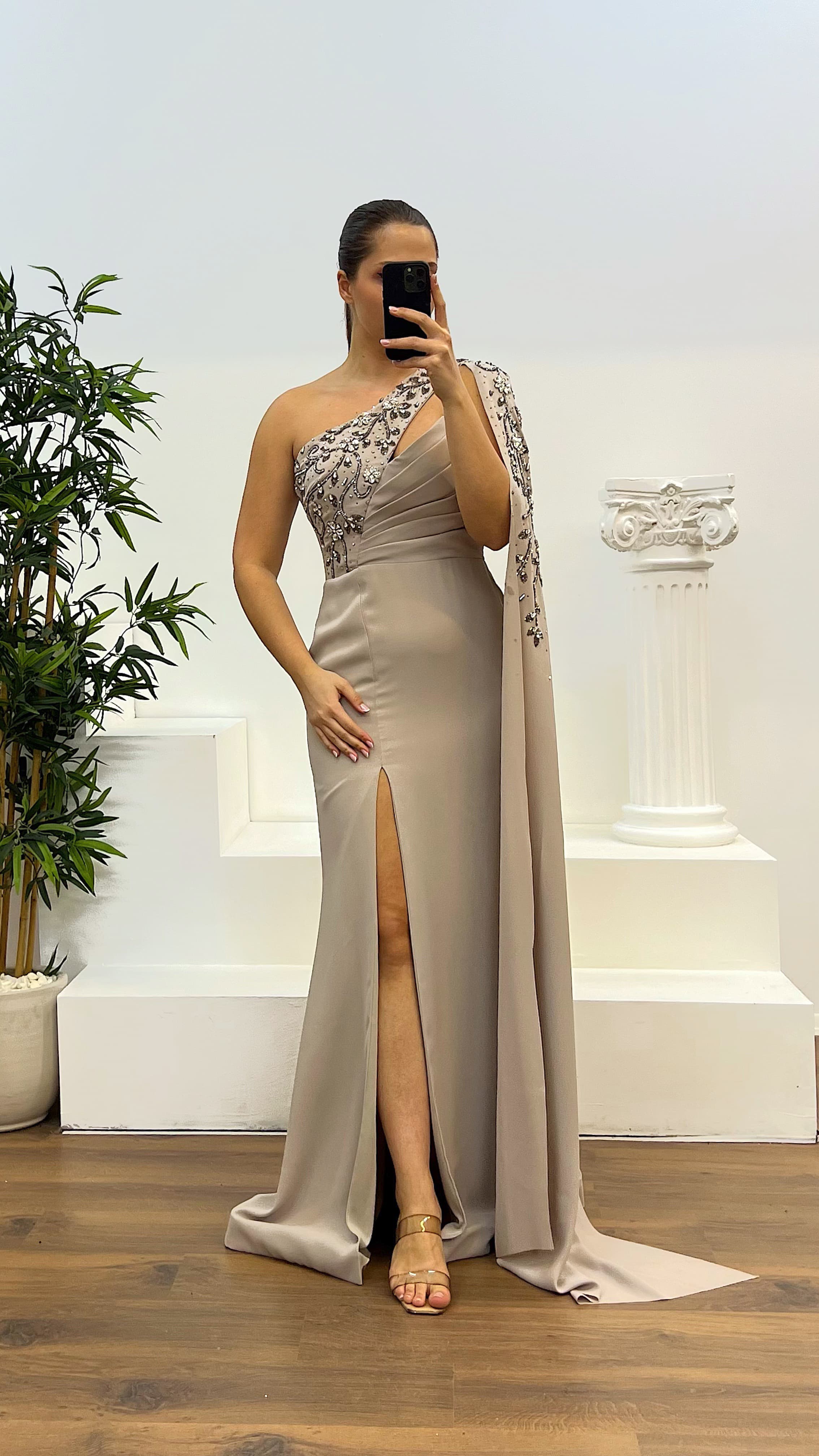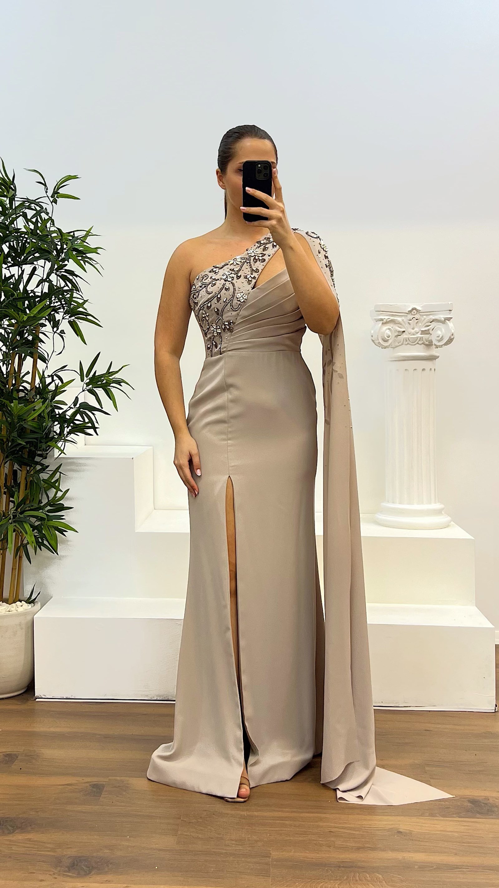 • Pudra Tek Kol İşleme Detay Büyük Beden Abiye Elbise
