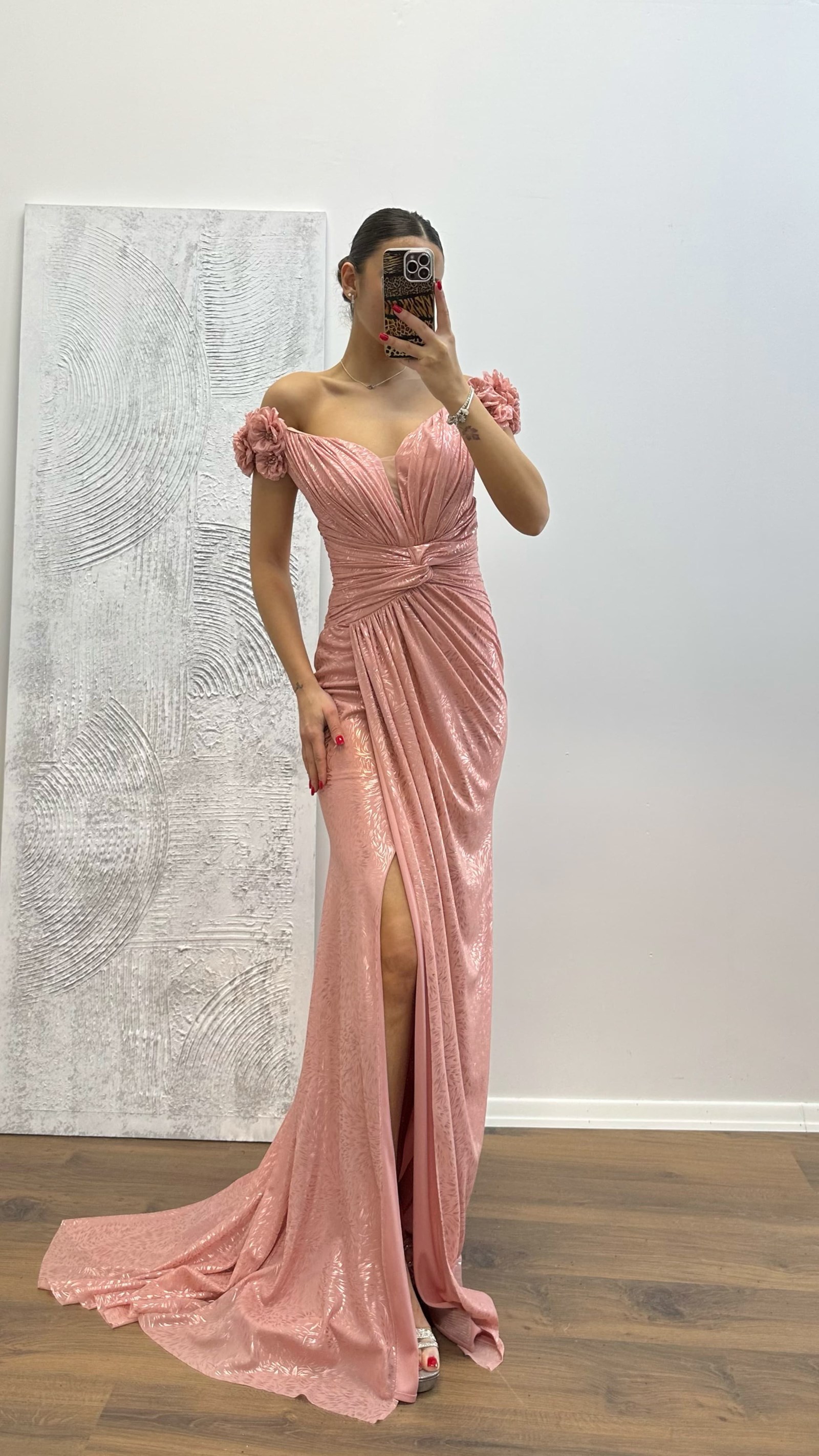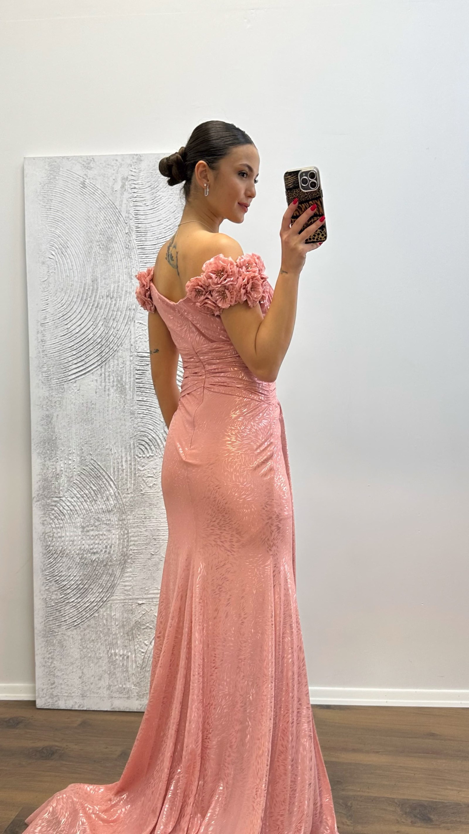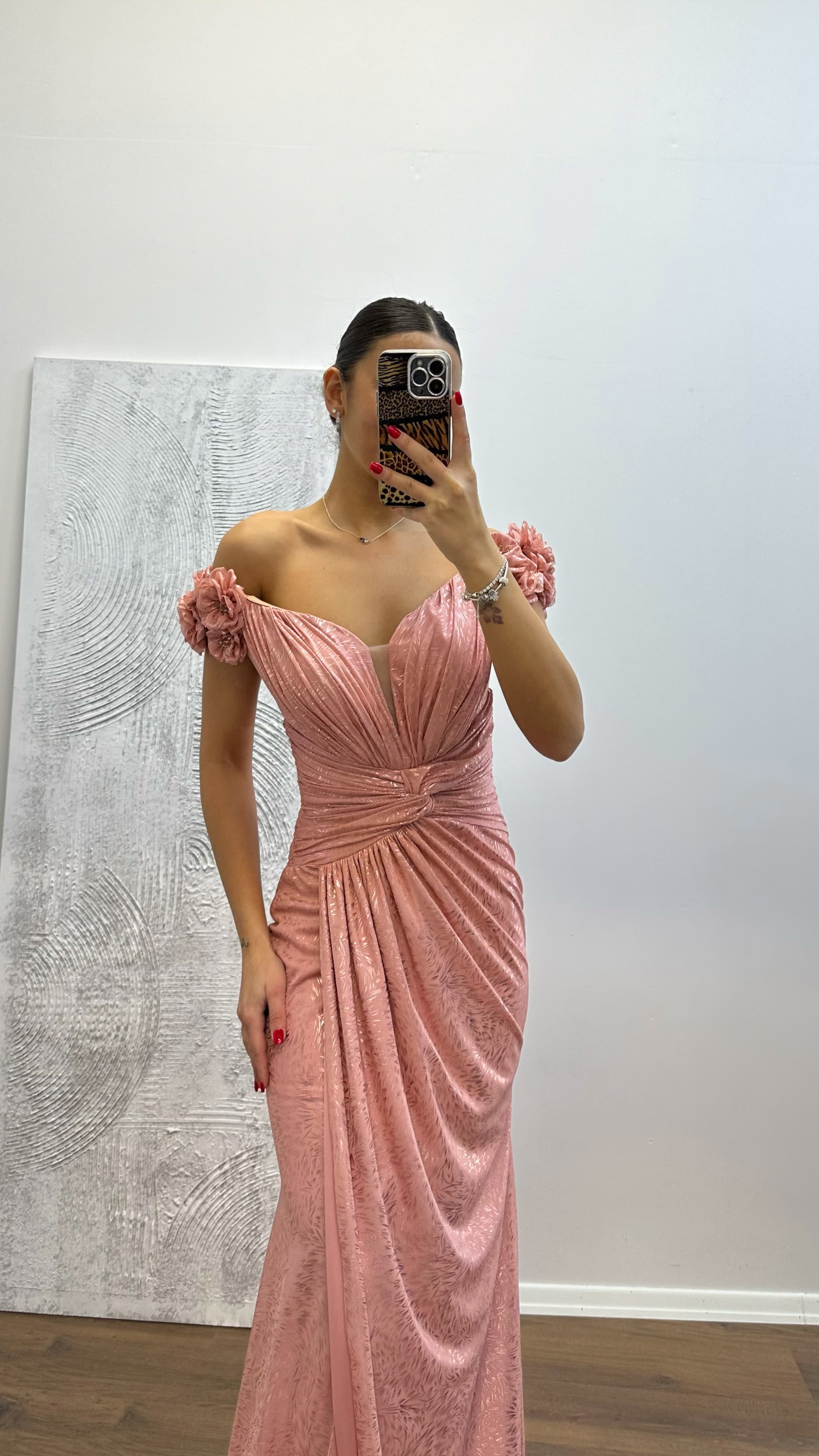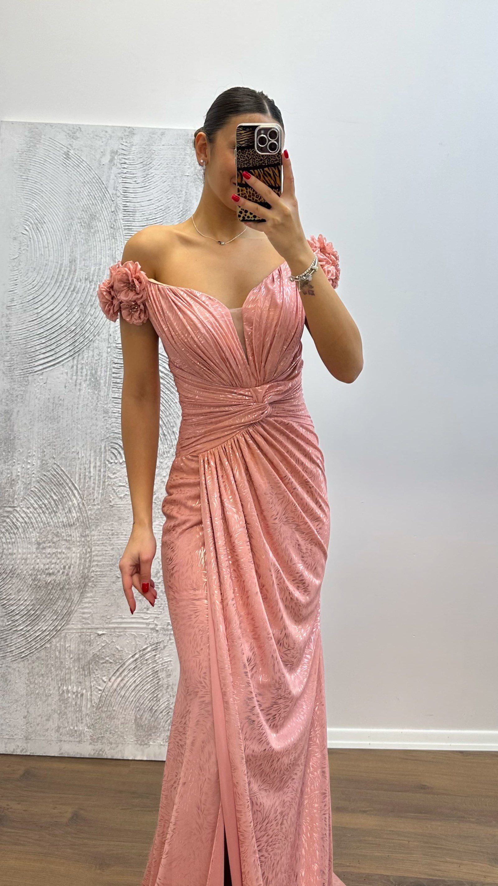 Omuz çiçek detay abiye elbise