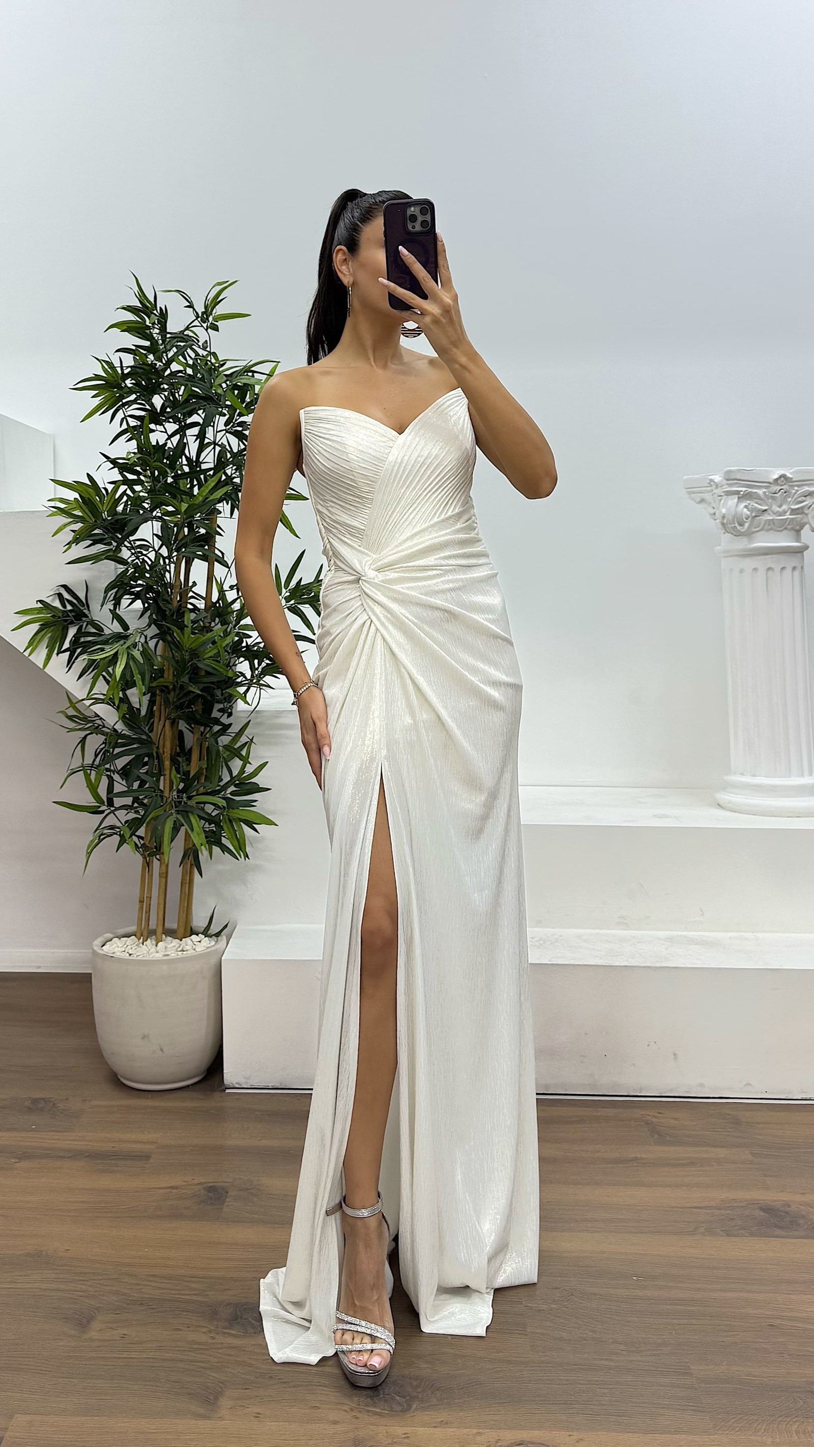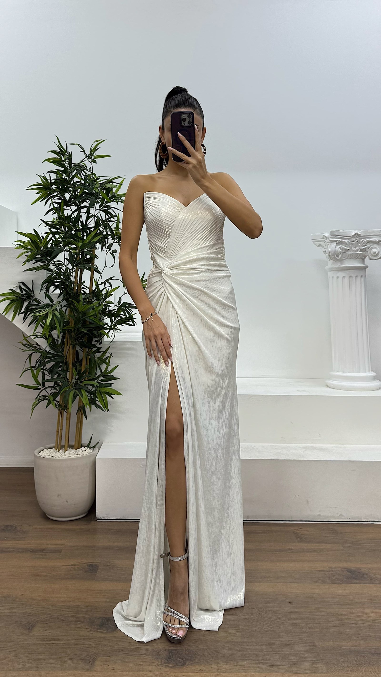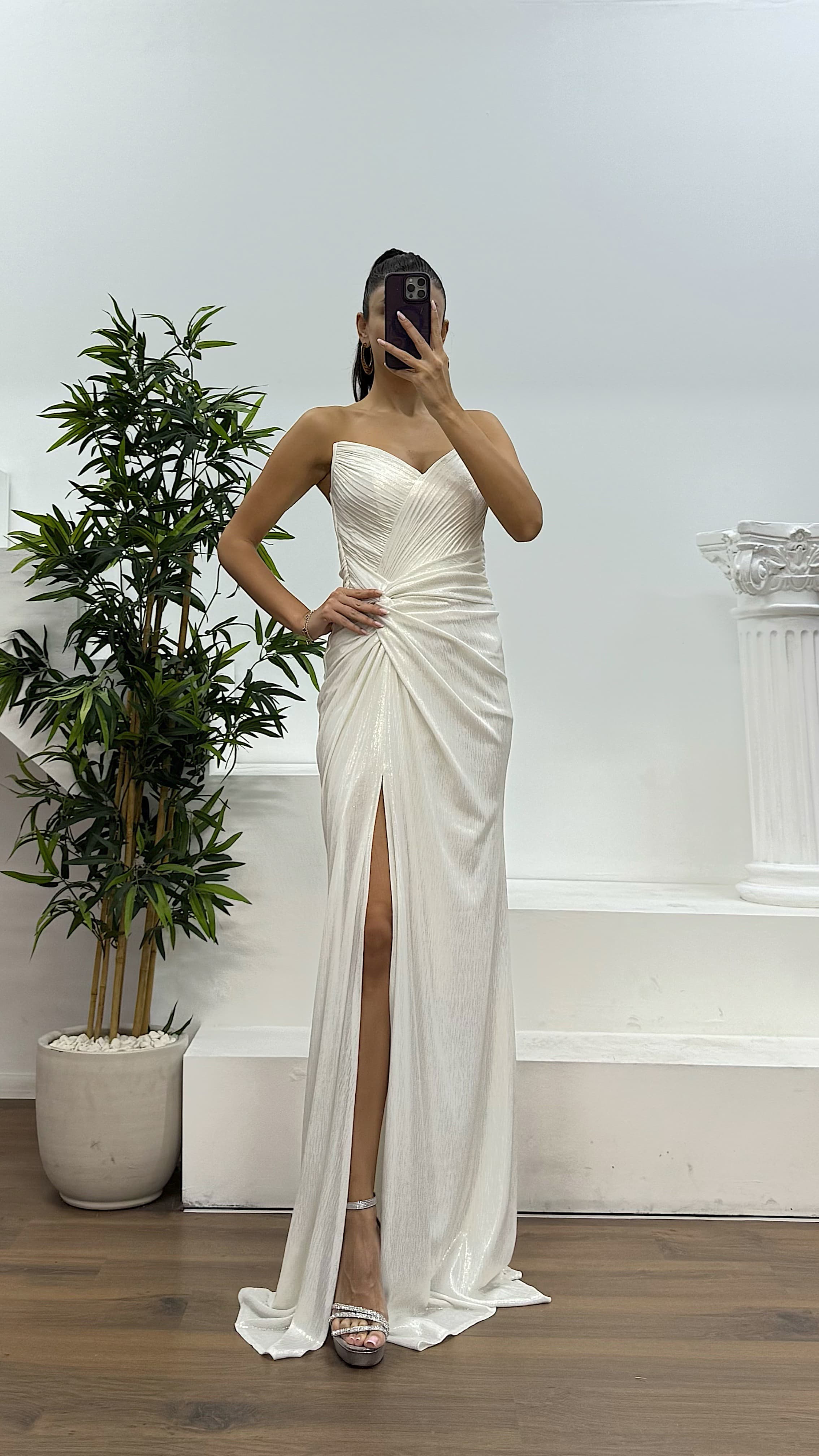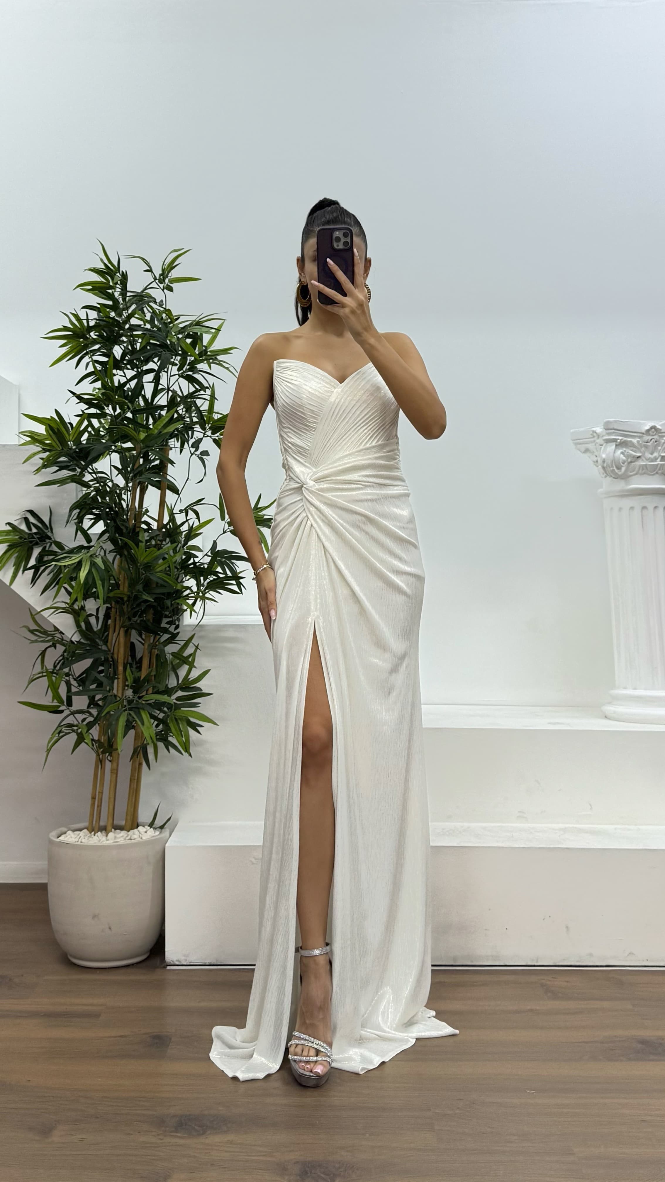 Ürün 36-42 bedene kadar uyumlu, göğüs pedli, astarlı, arka kapama fermuar, yırtmaçlı abiye olarak tasarlanmıştır.