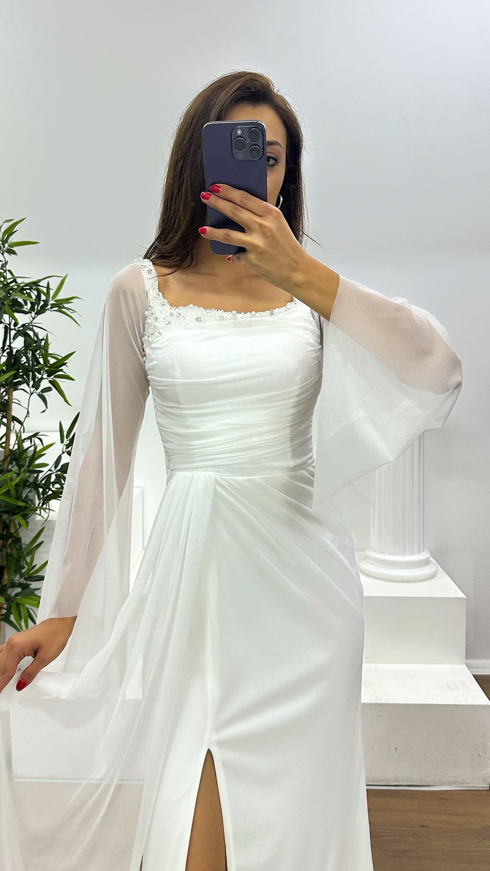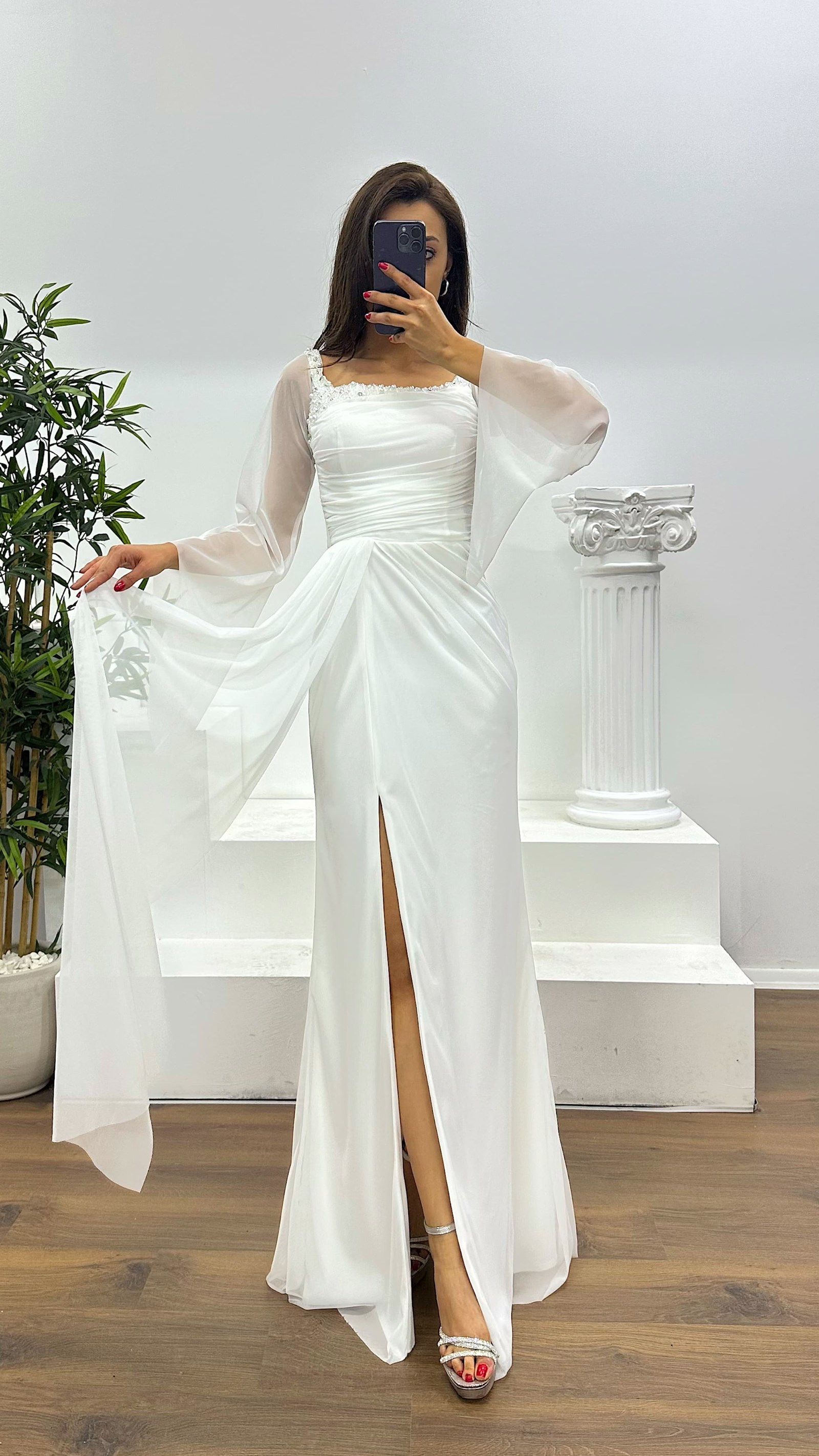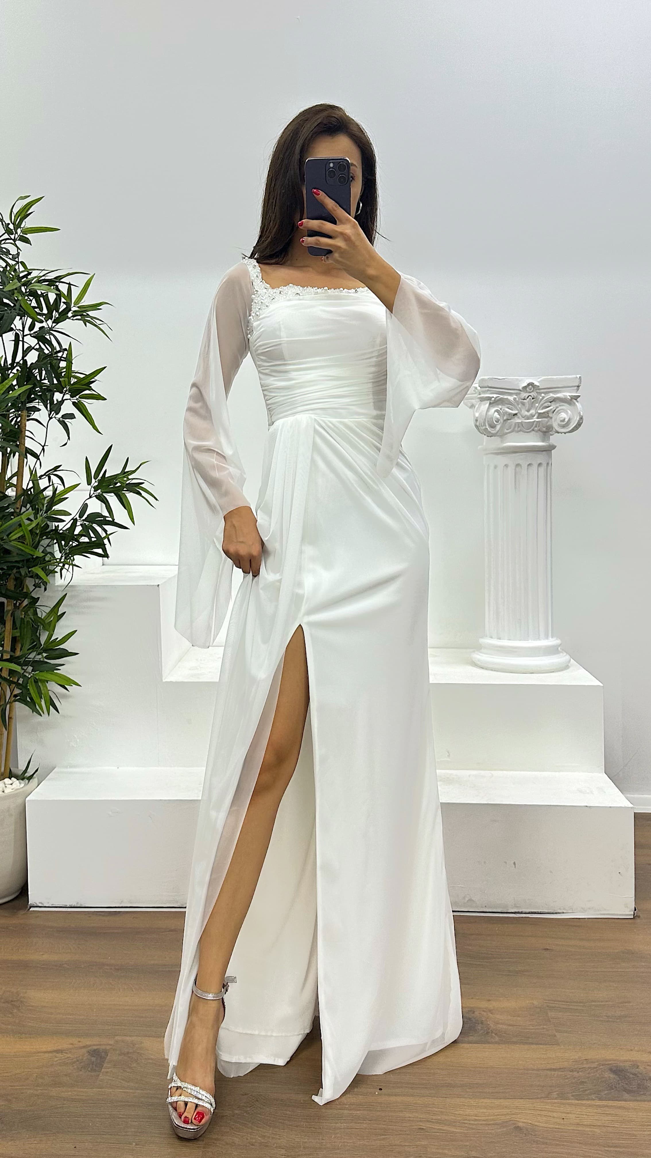 Ürün 36-42 bedene kadar uyumlu, göğüs pedli, astarlı, arka kapama fermuar, yırtmaçlı, işlemeli abiye olarak tasarlanmıştır.