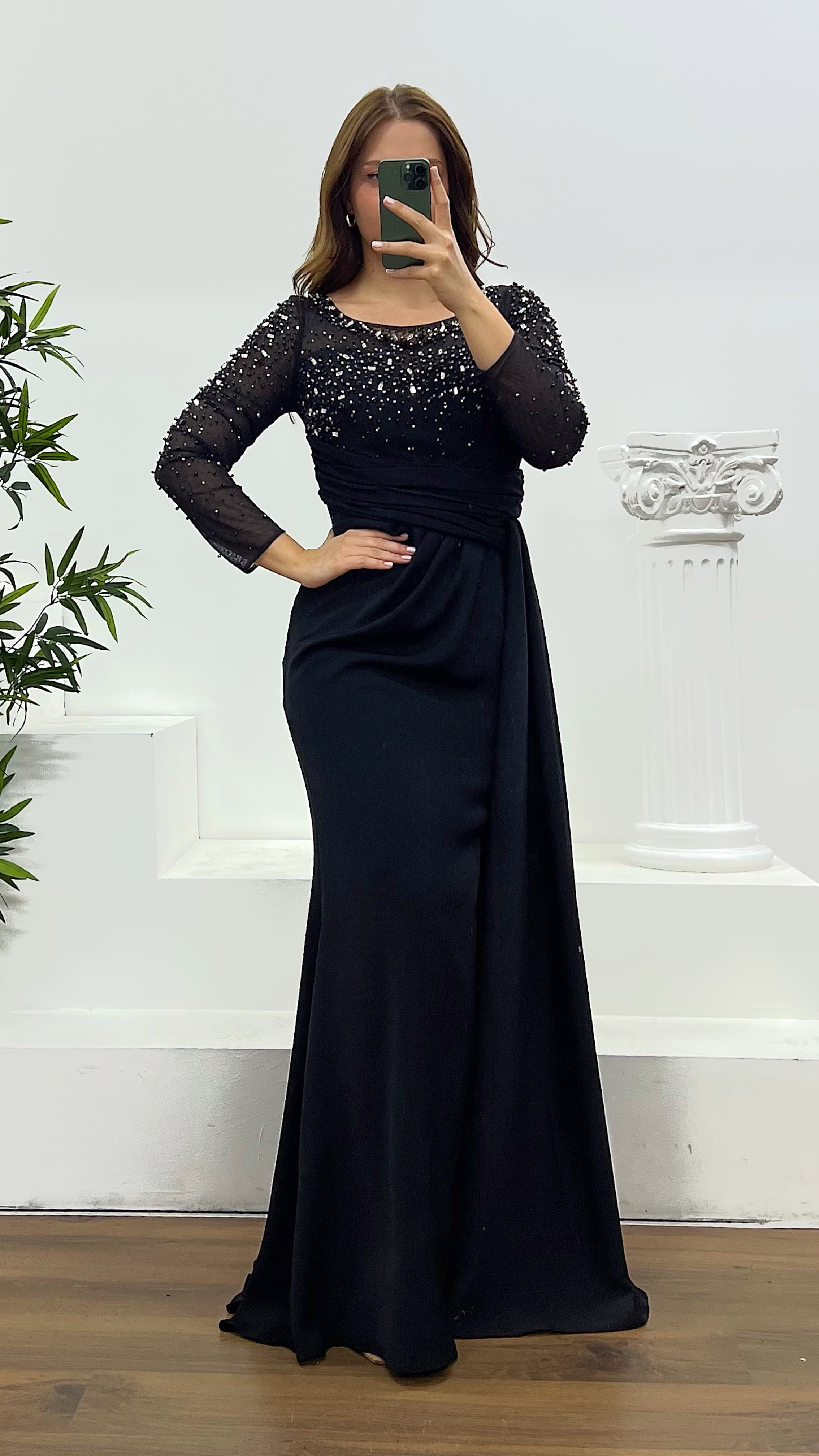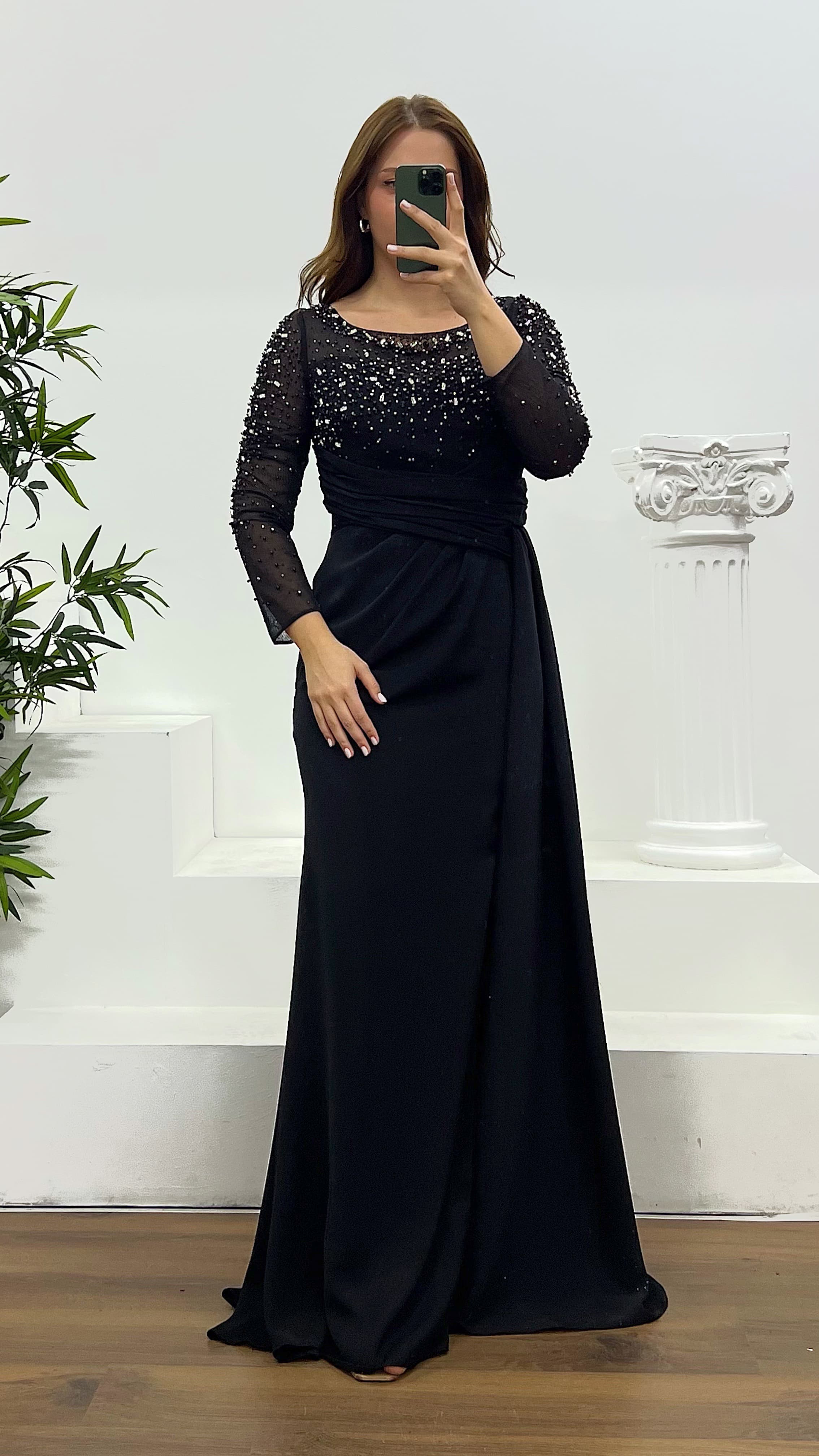 • Siyah Taş ve İnci Detay Büyük Beden Abiye Elbise