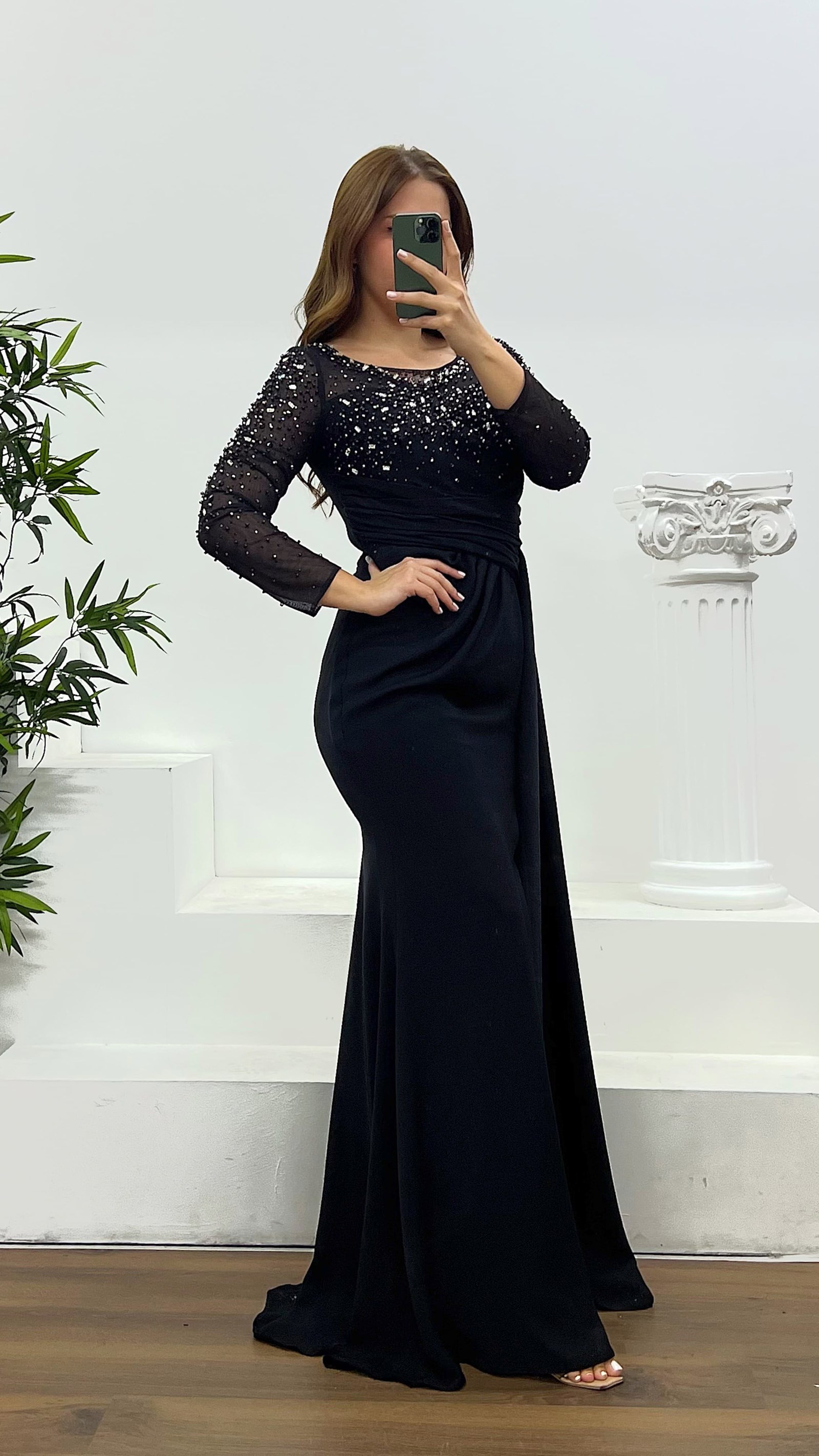 Taş ve inci detay abiye elbise