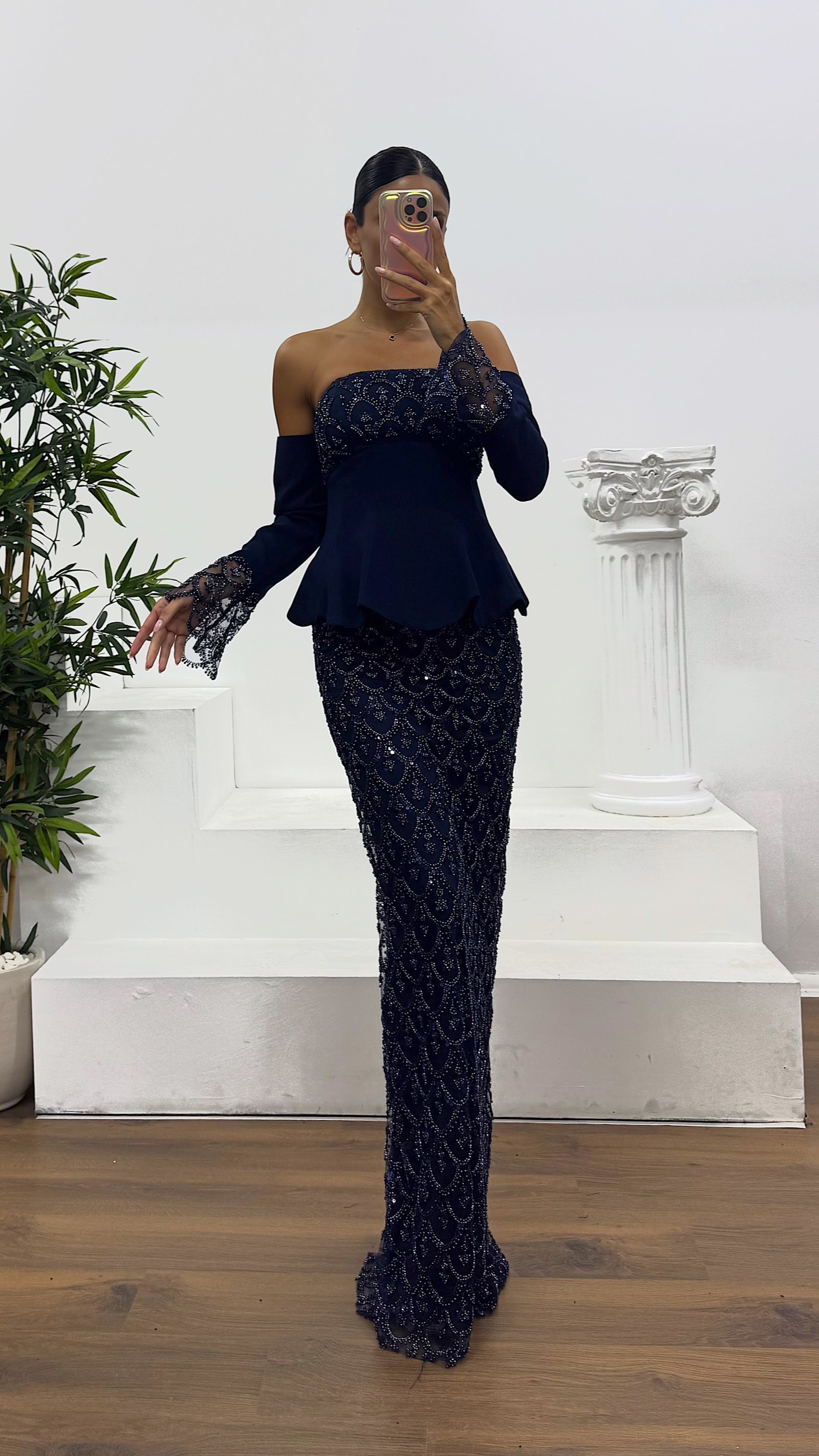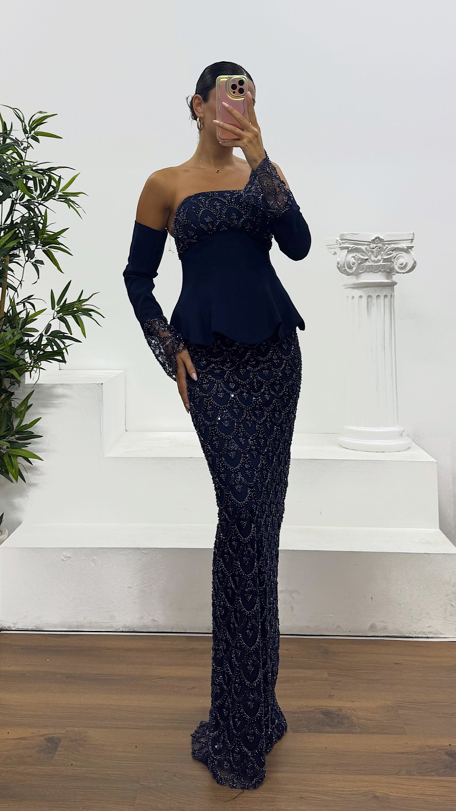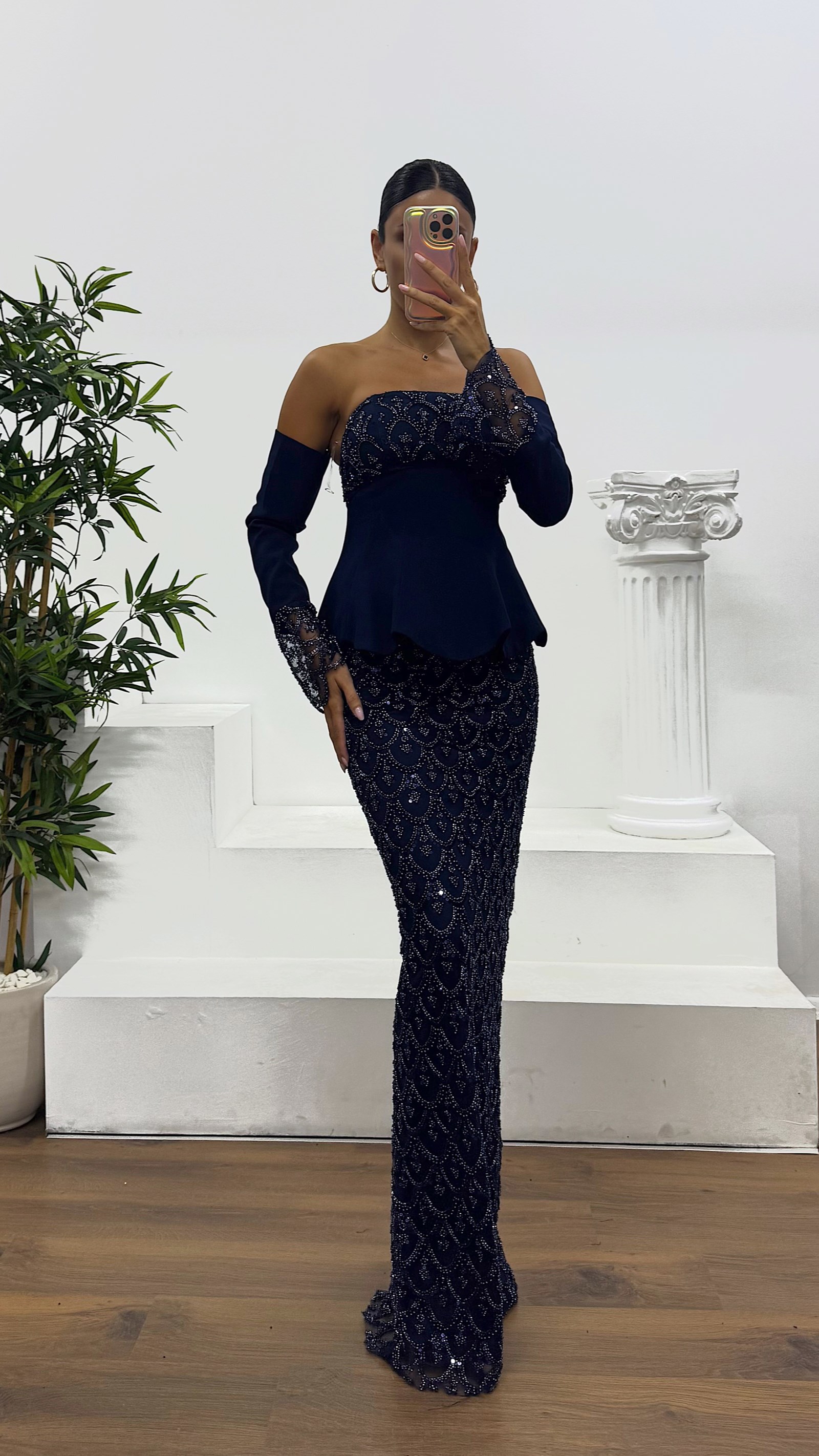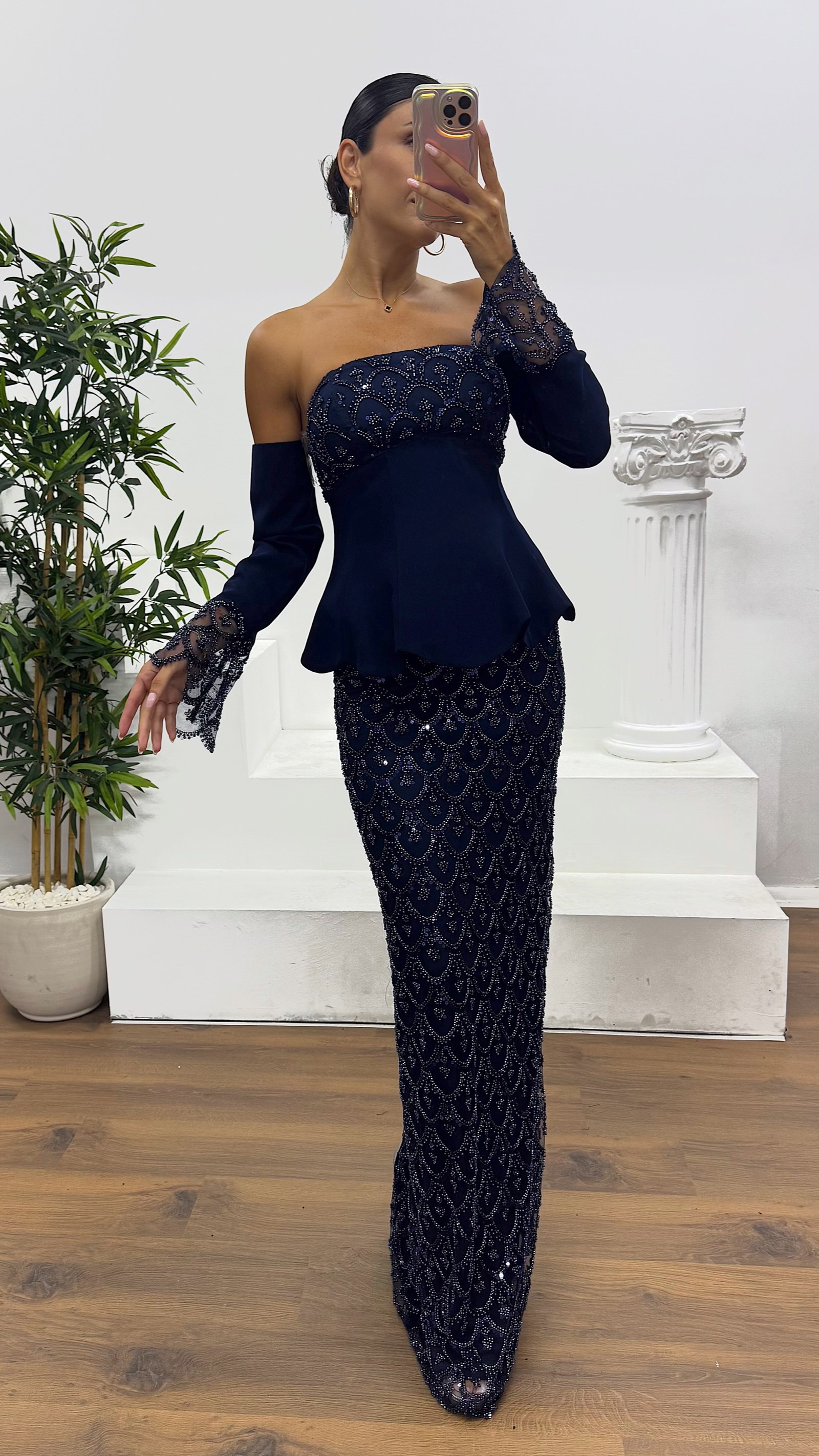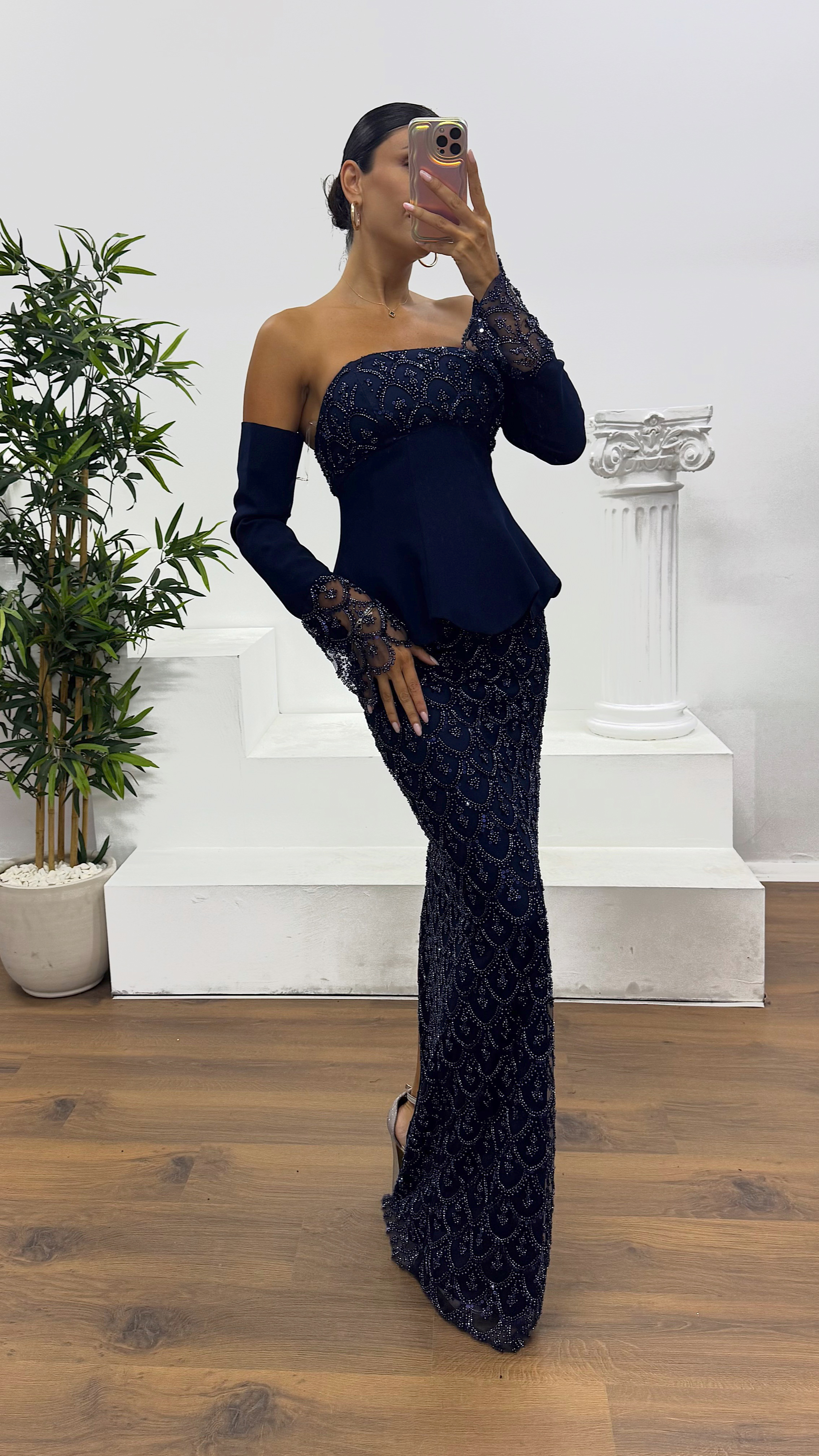 İşlemeli eldivenli abiye elbise