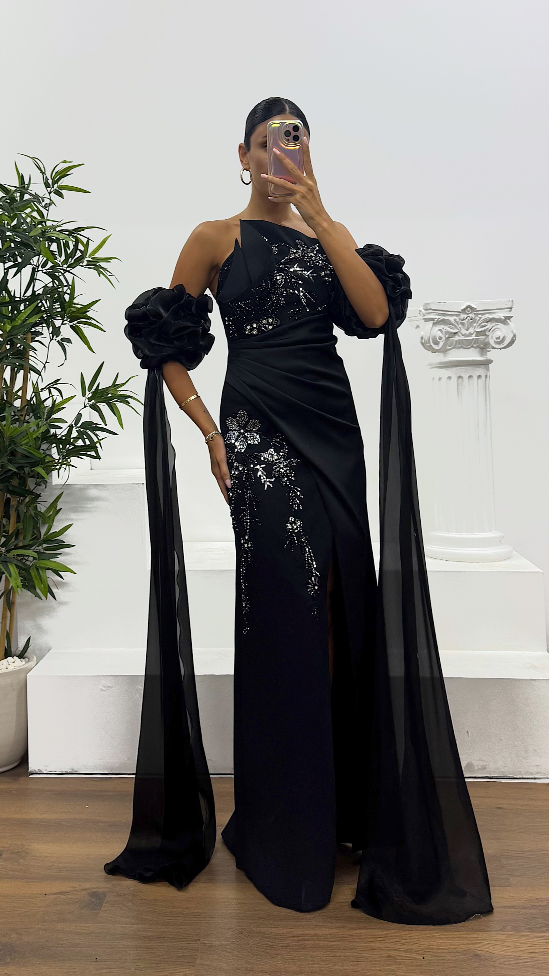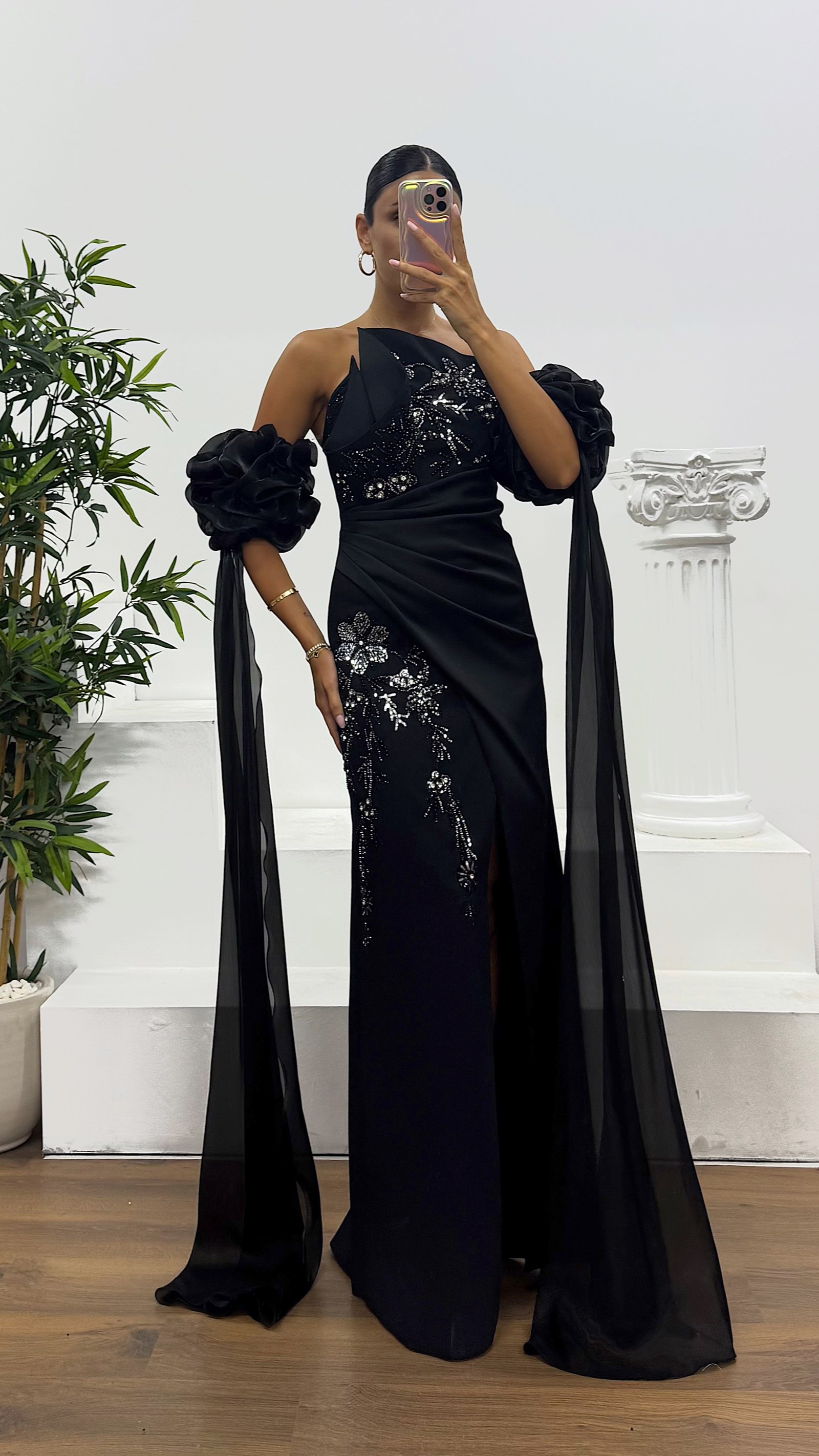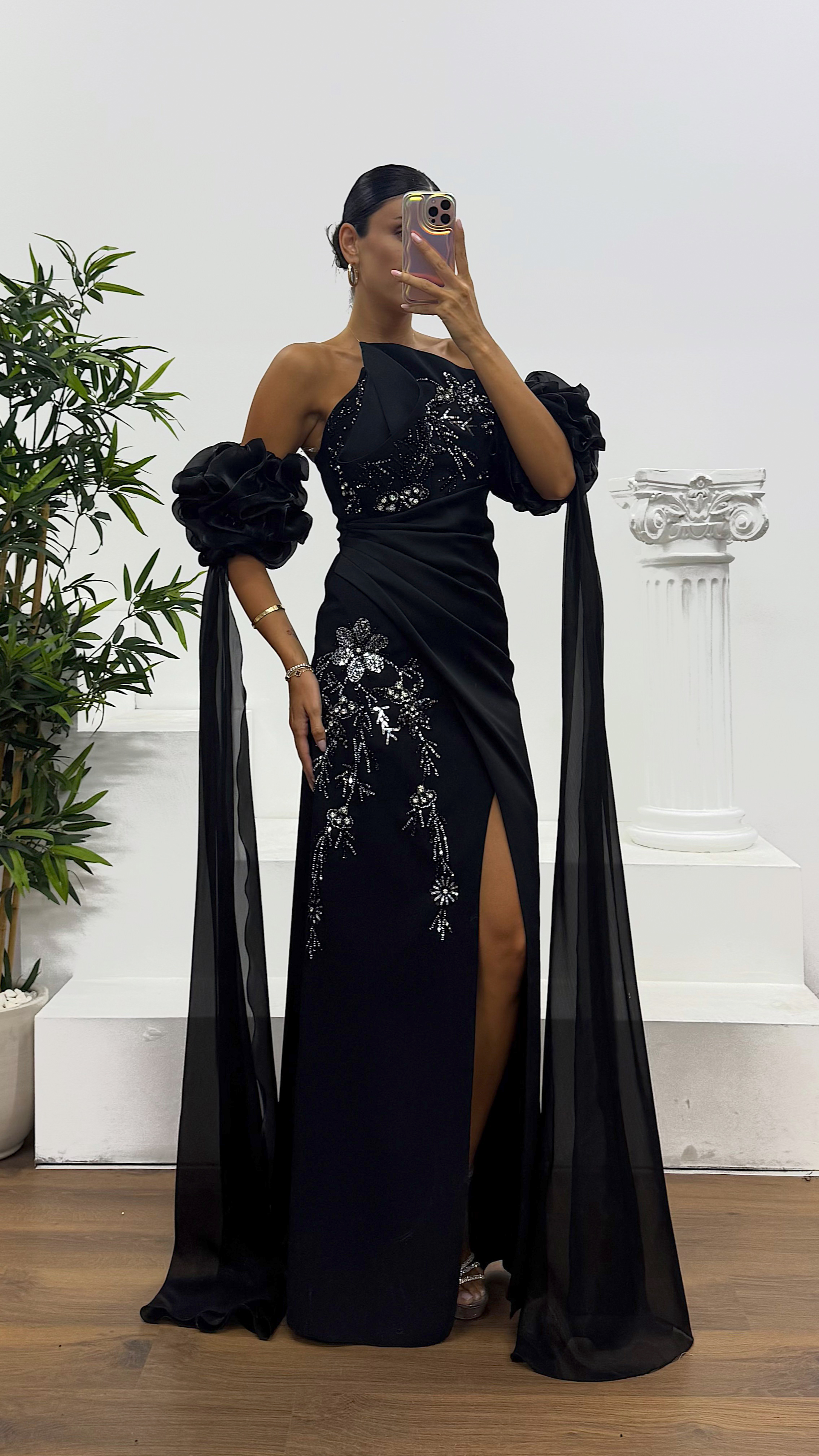 Ürün 36-44 bedene kadar uyumlu, göğüs pedli, astarlı, arka kapama fermuar, yırtmaçlı, işlemeli, kol detay abiye olarak tasarlanmıştır.