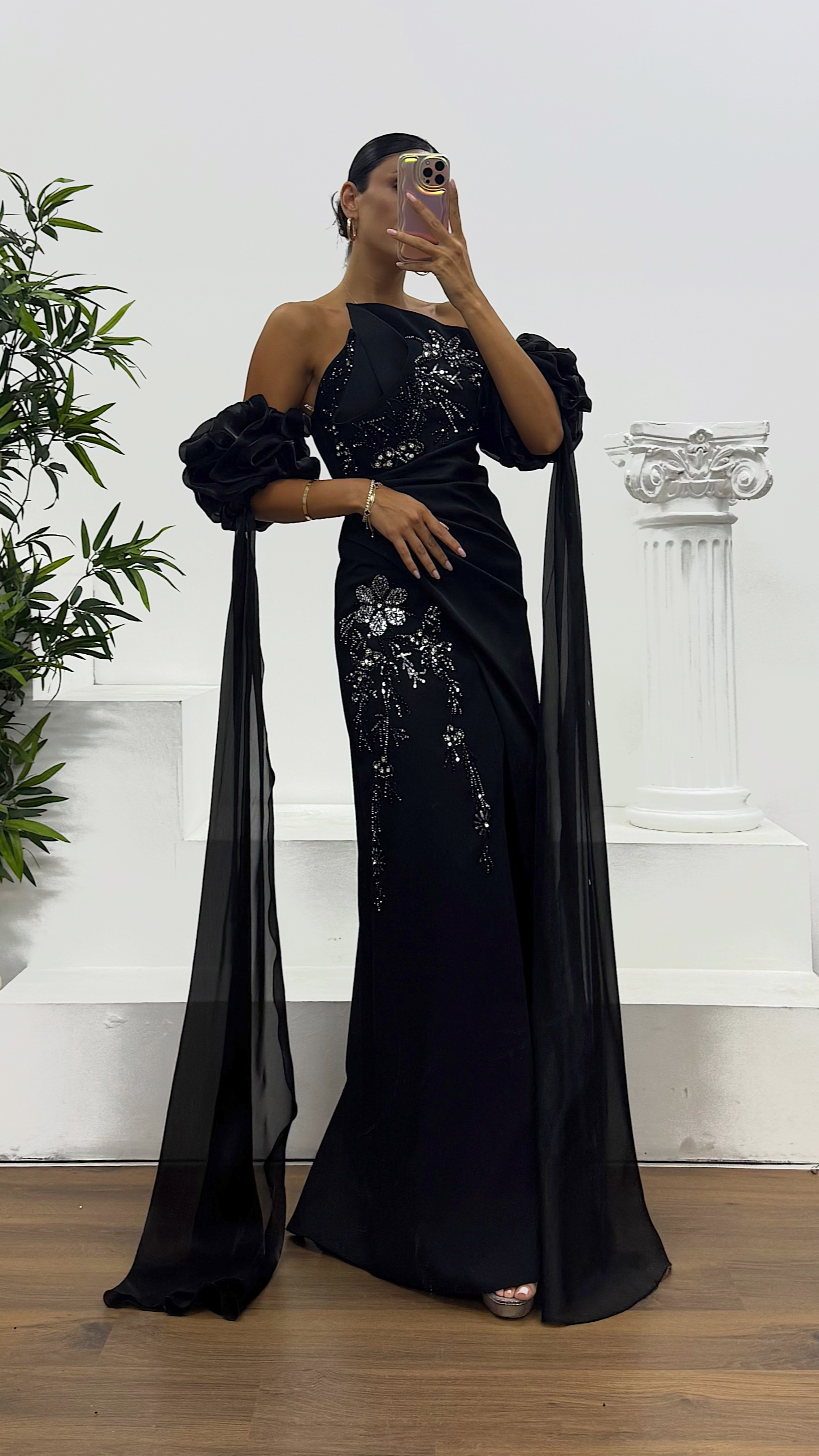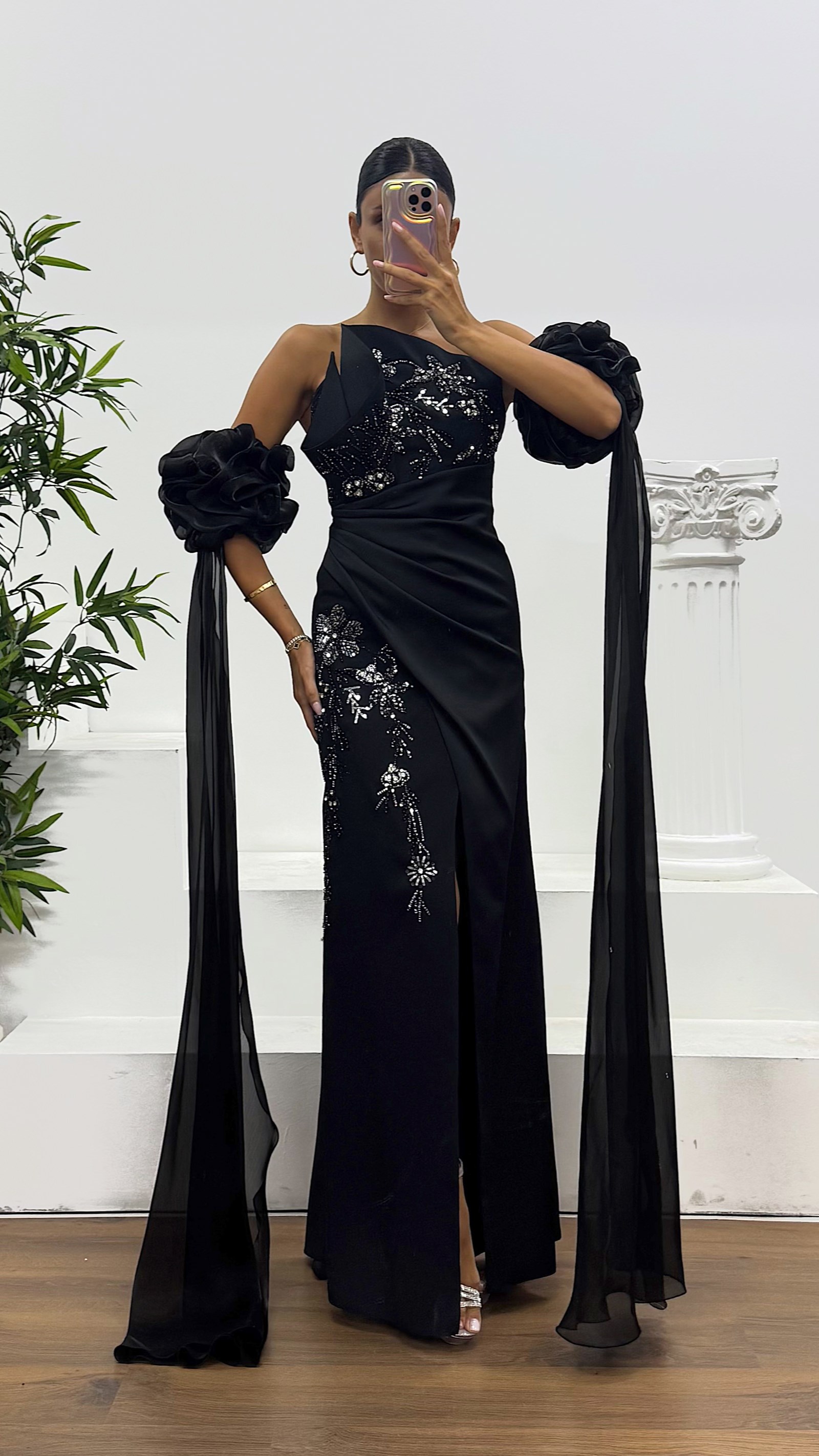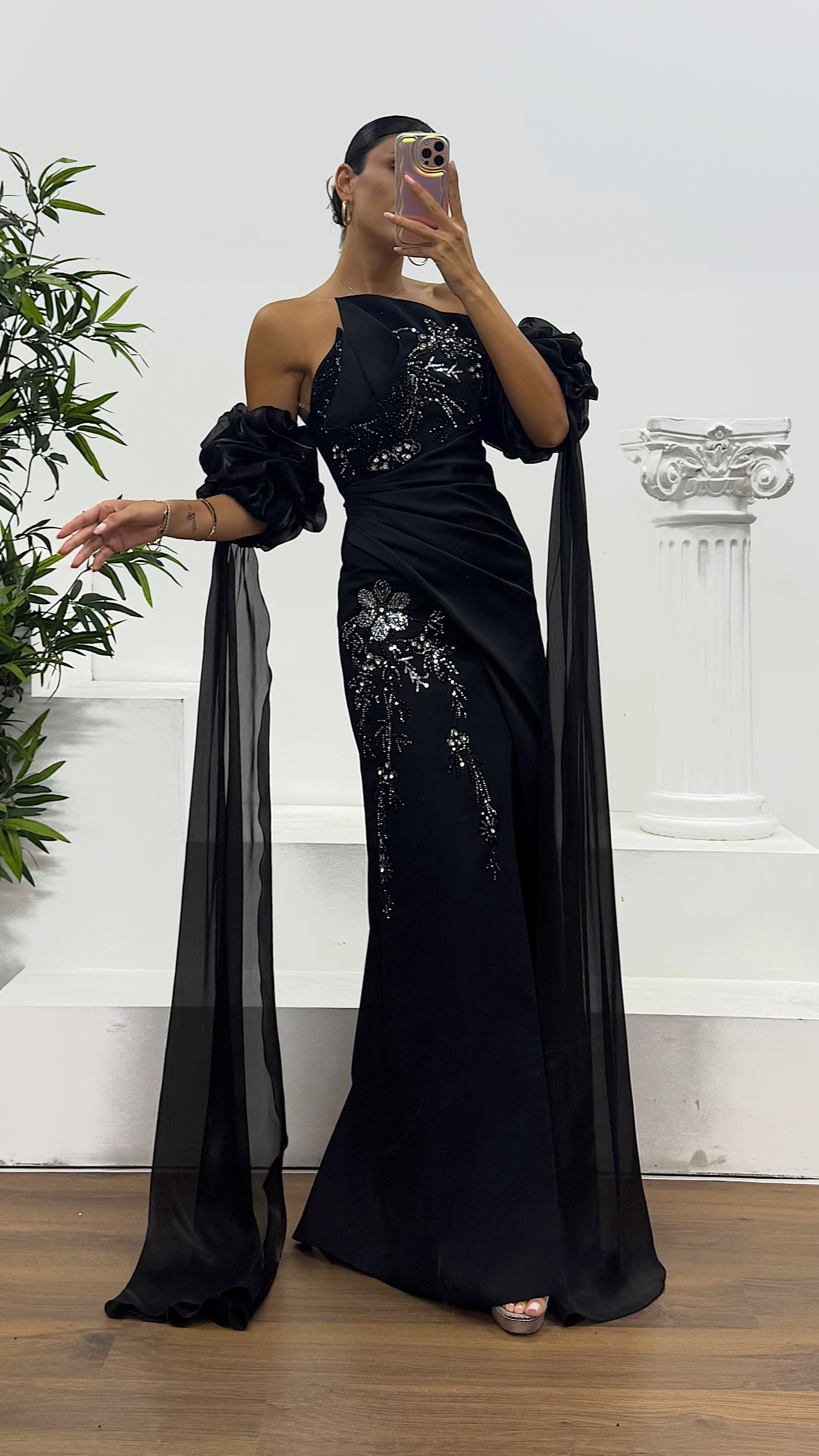 Ürün 36-44 bedene kadar uyumlu, göğüs pedli, astarlı, arka kapama fermuar, yırtmaçlı, işlemeli, kol detay abiye olarak tasarlanmıştır.