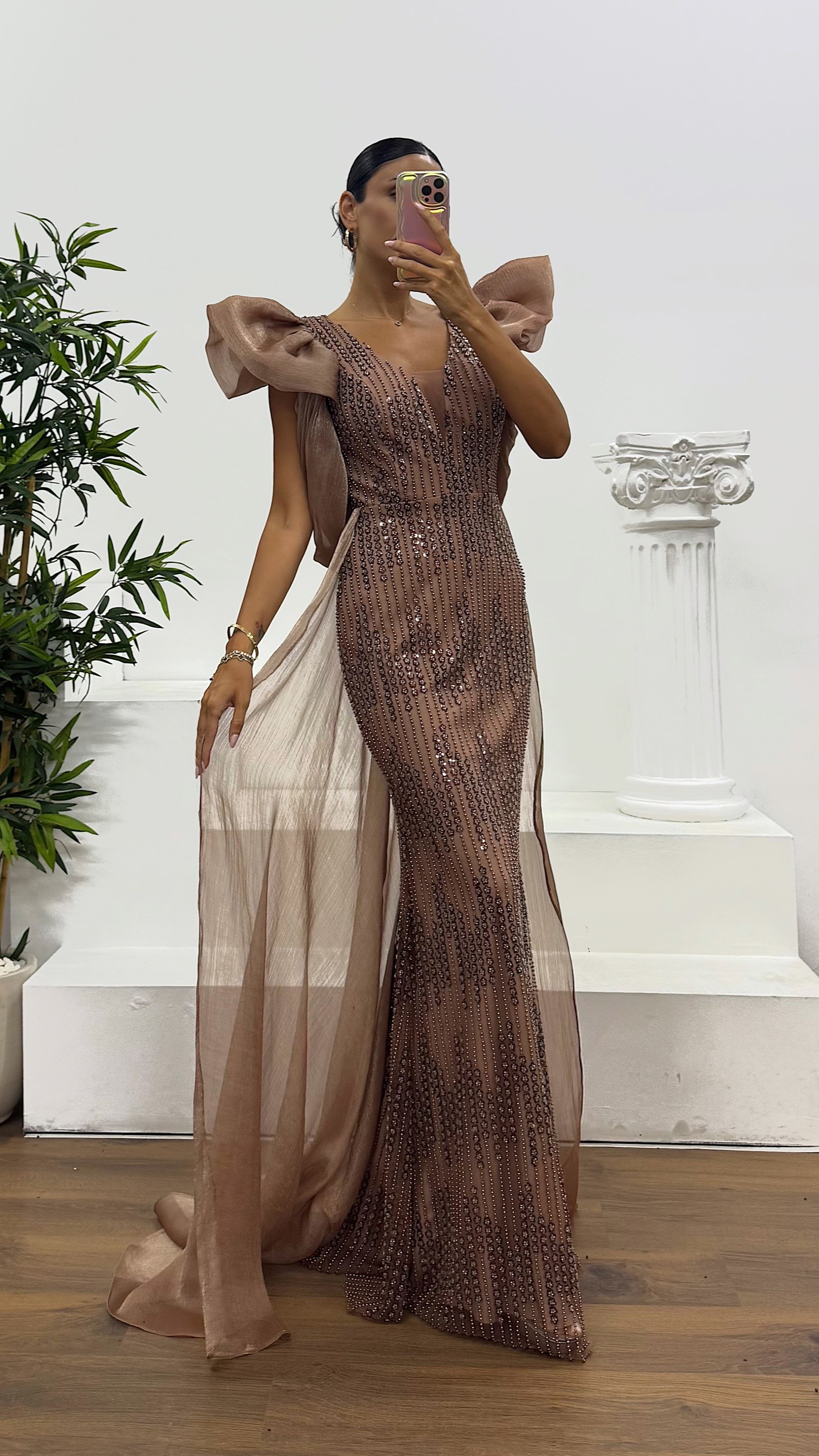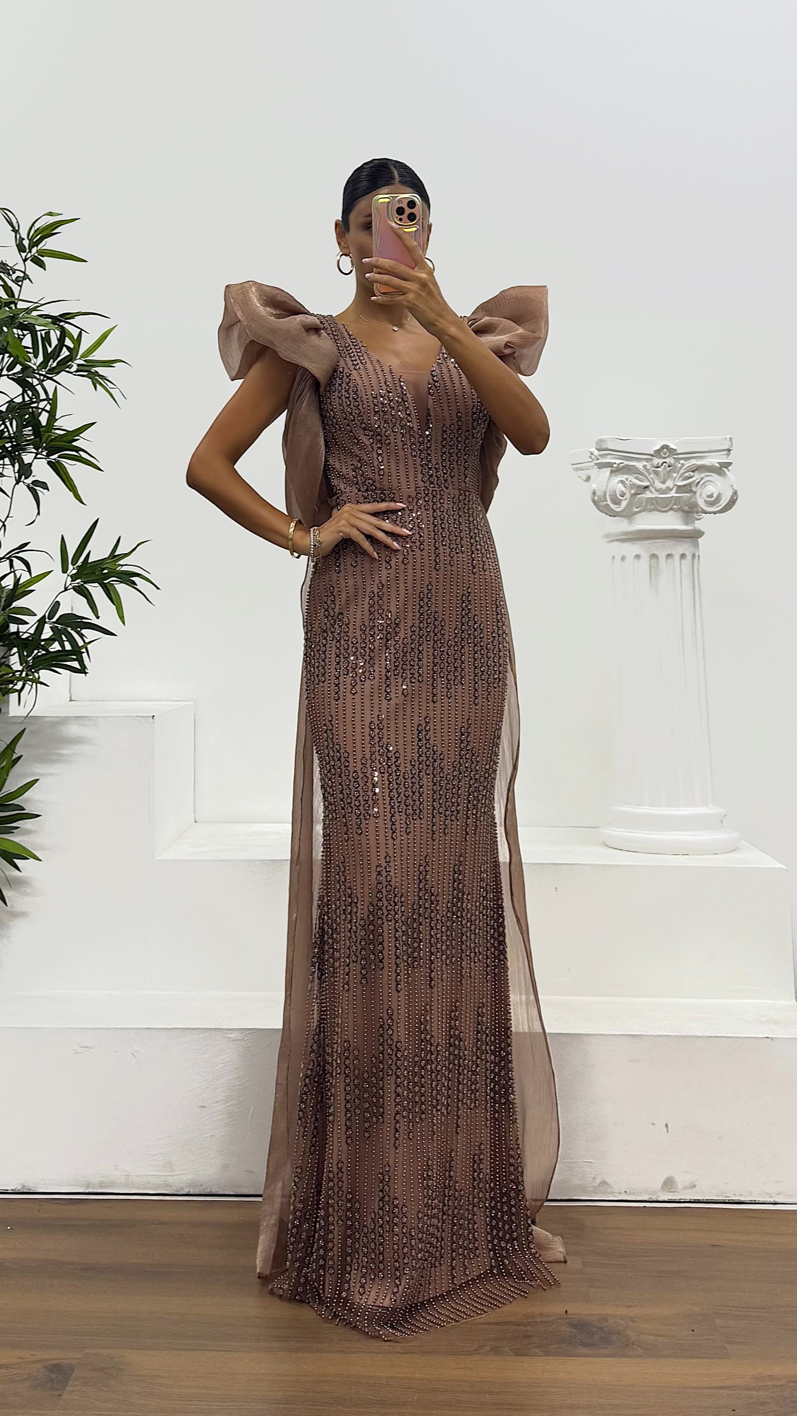 • Kahve V Yaka Kolları Tül Abiye Elbise