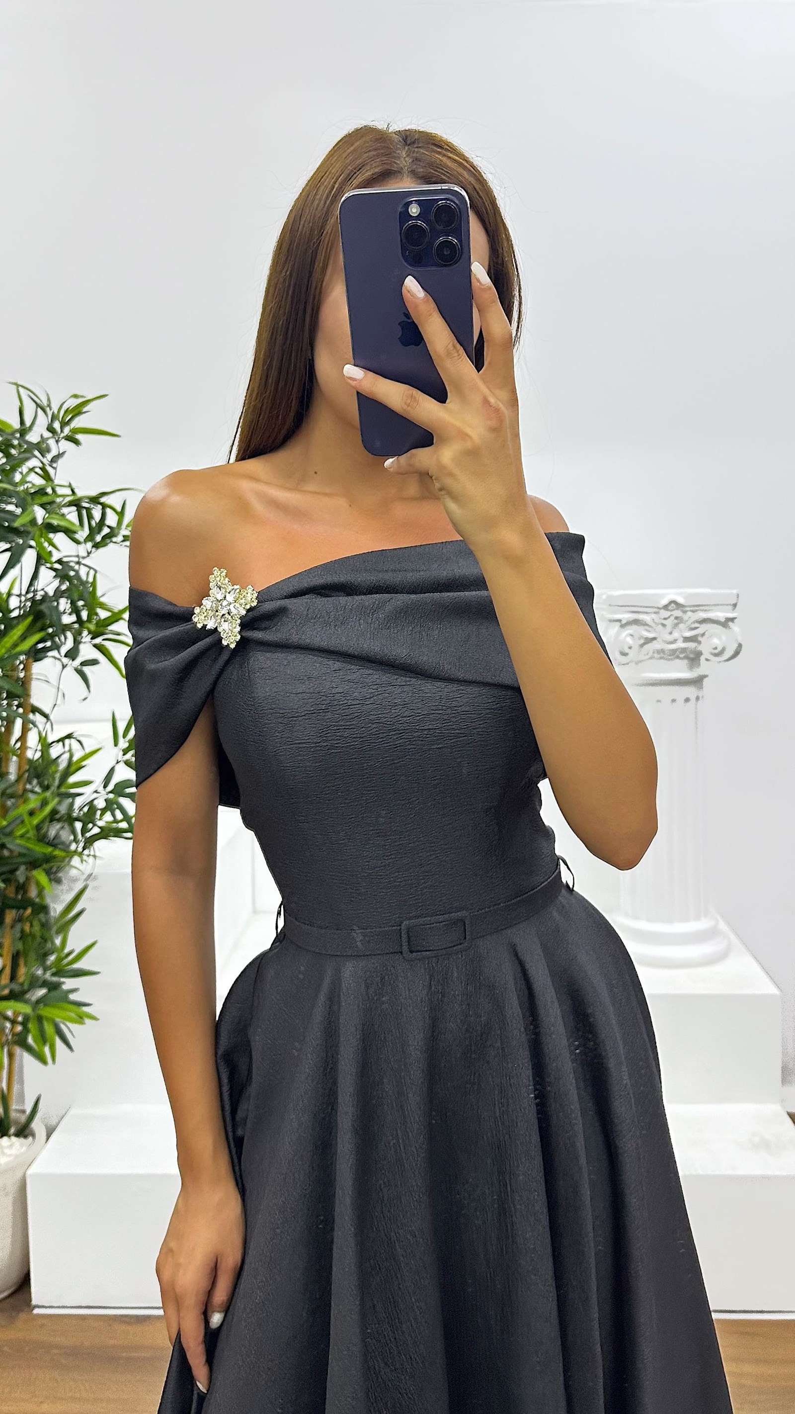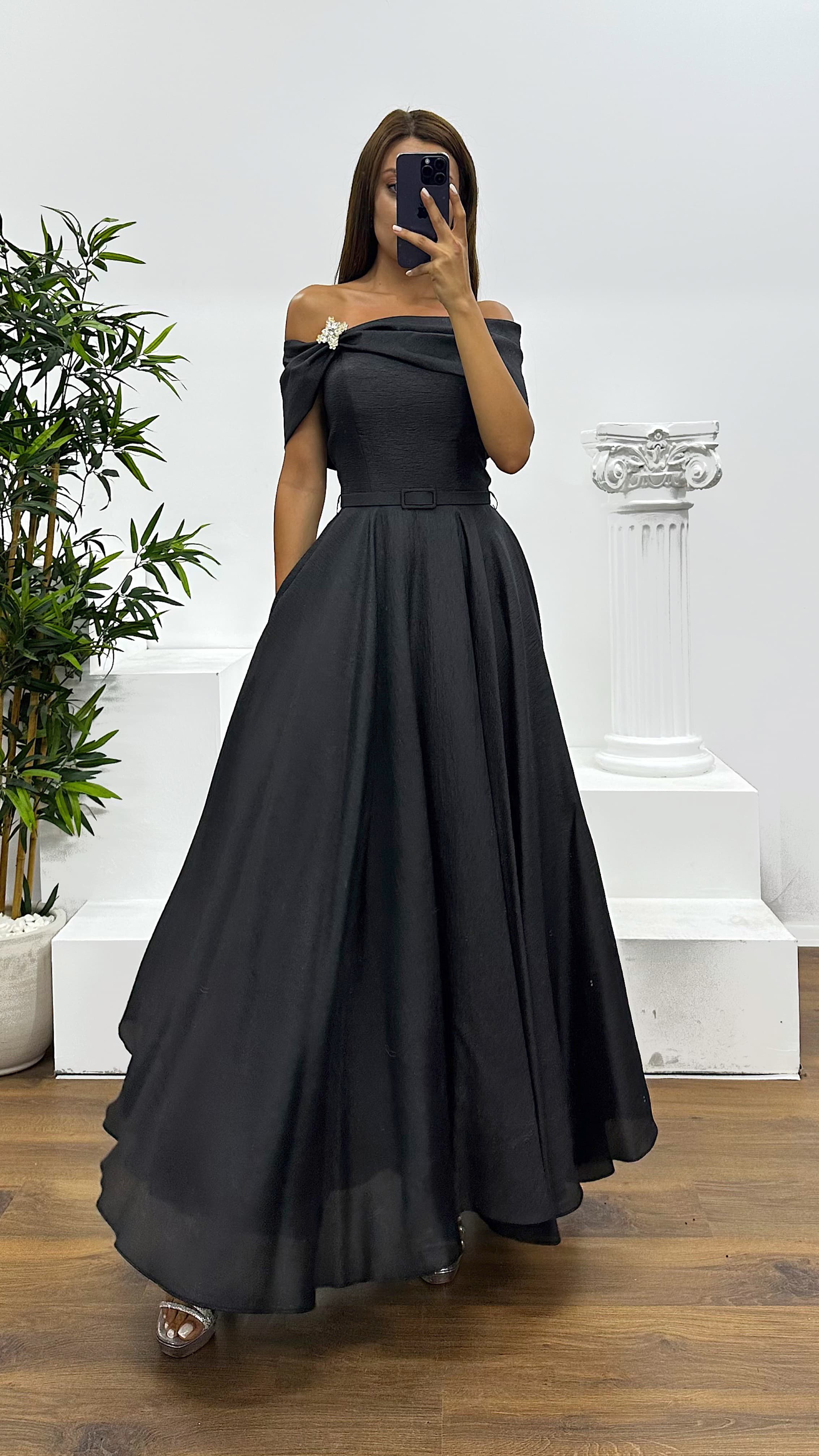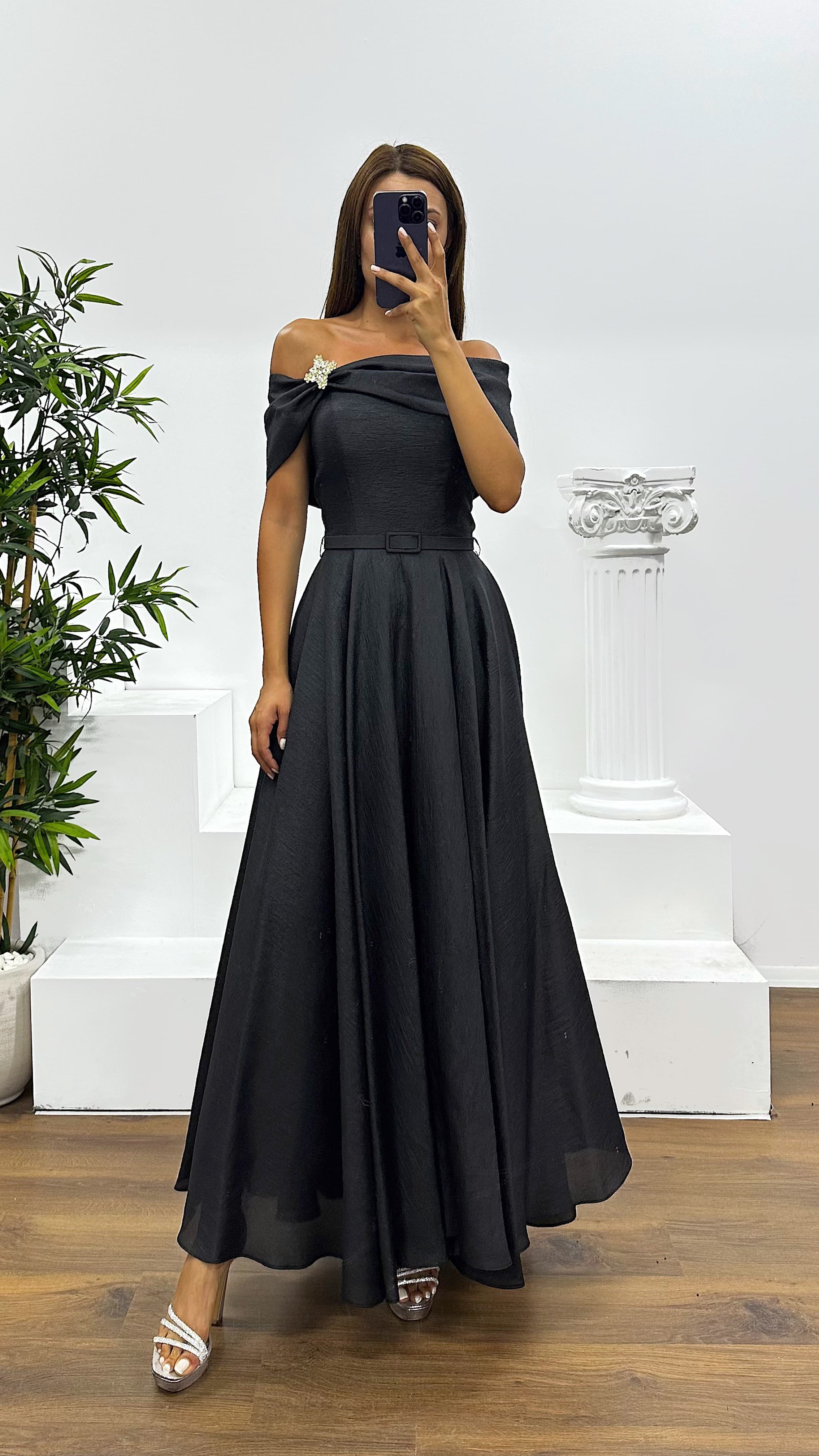 Siyah Kayık Yaka Midi Abiye Elbise