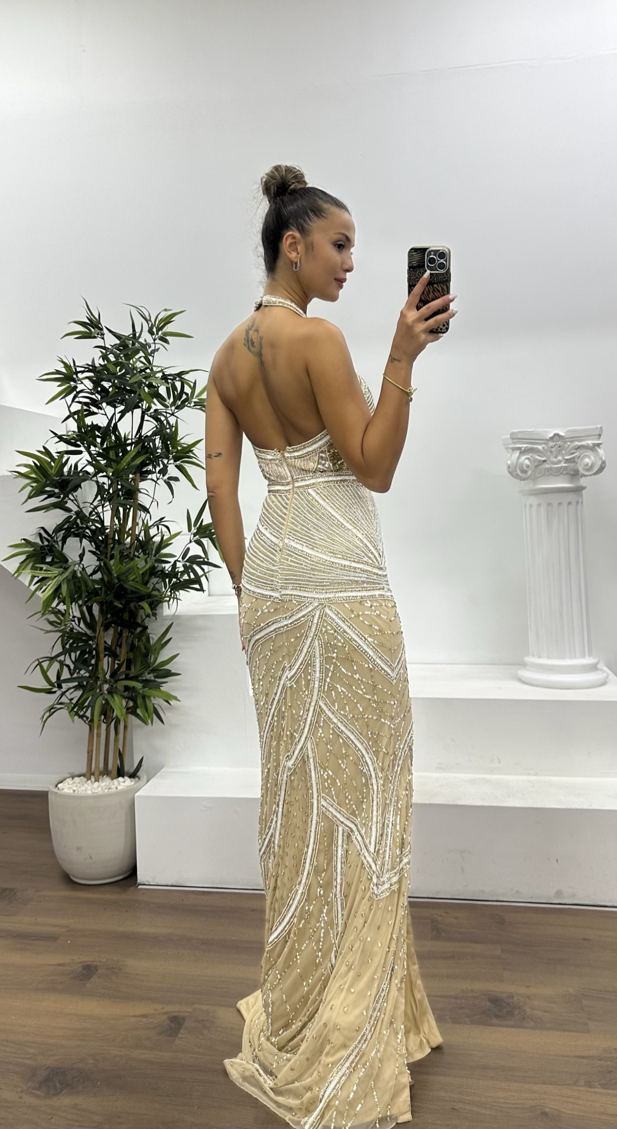 Boyundan bağlamalı işlemeli abiye elbise