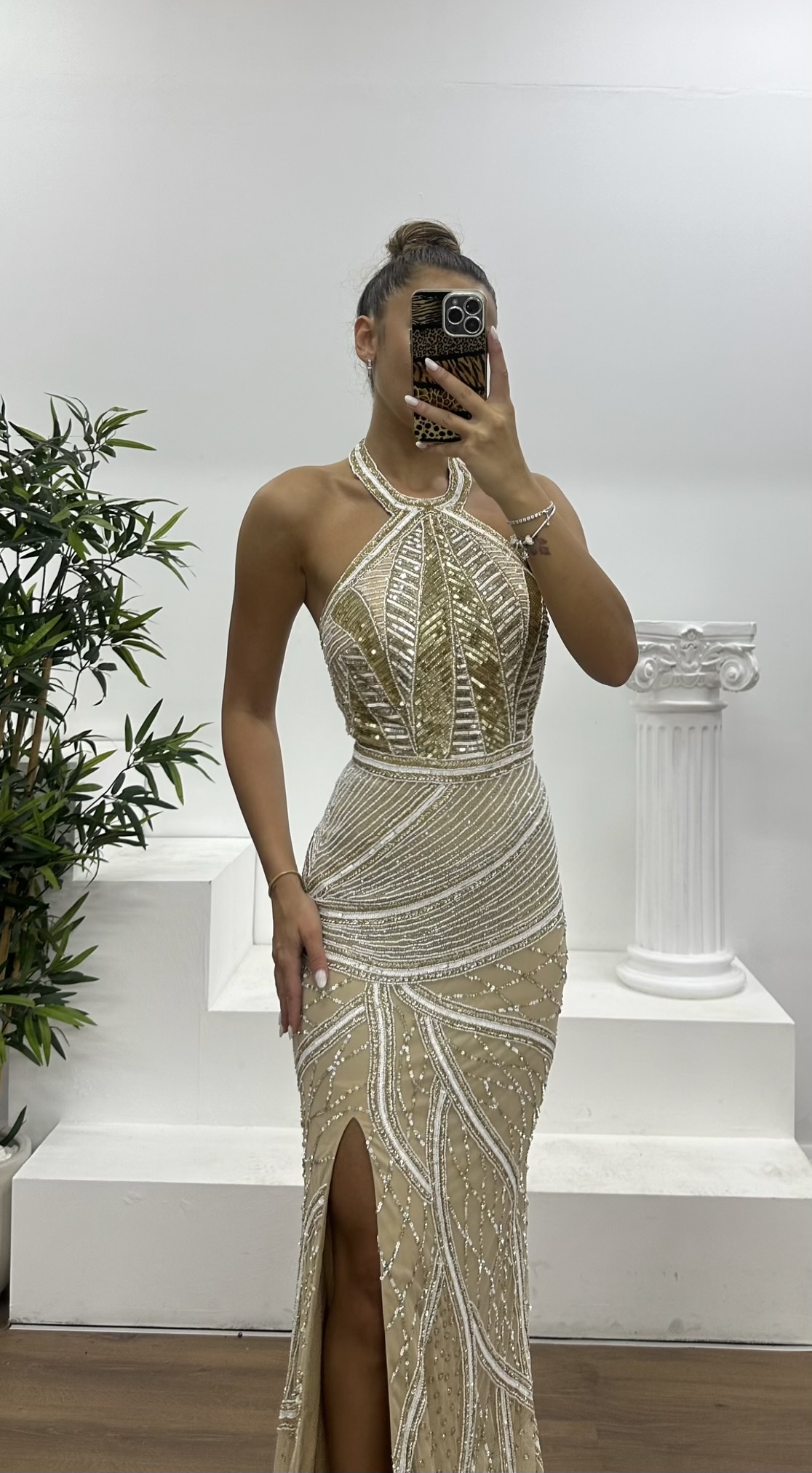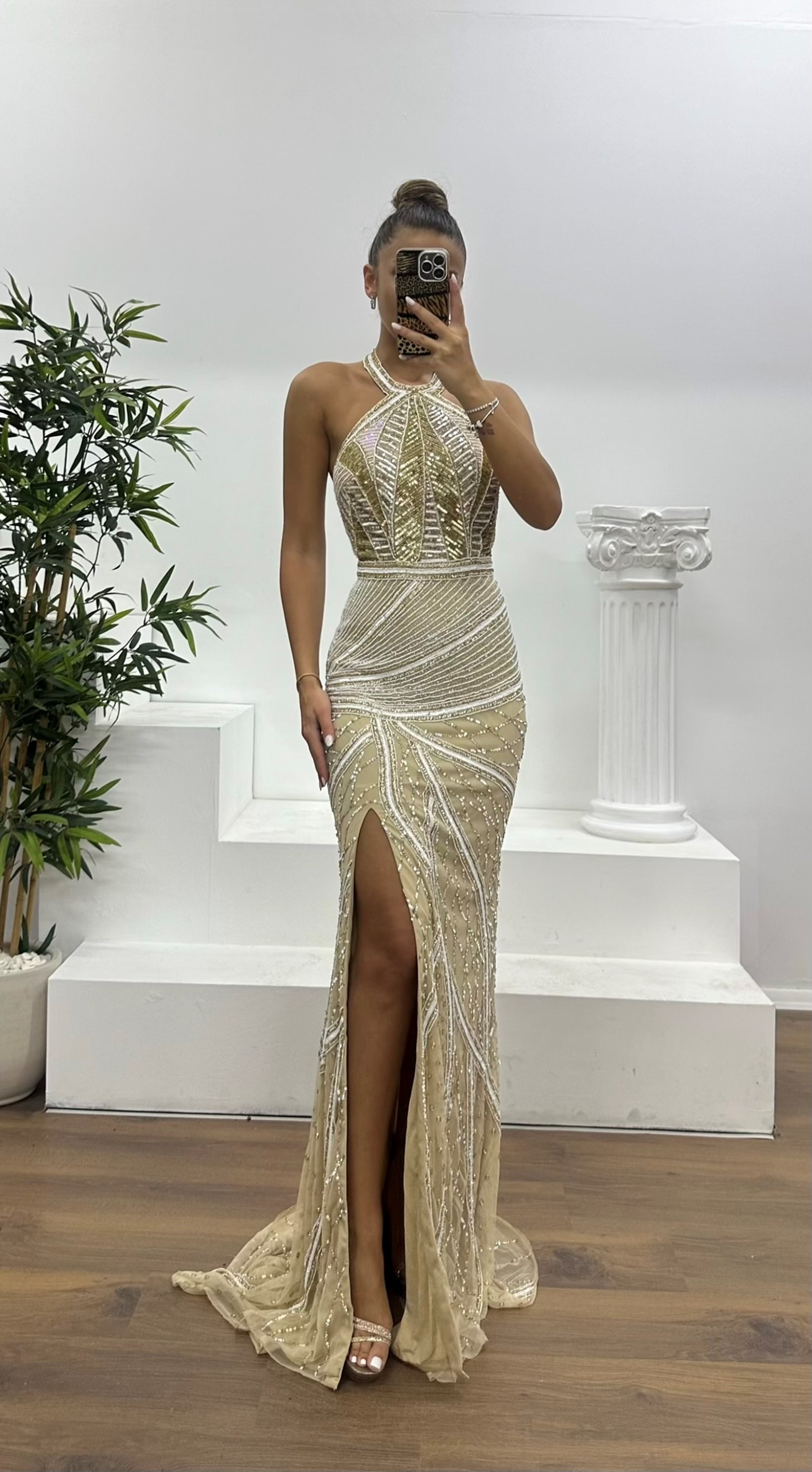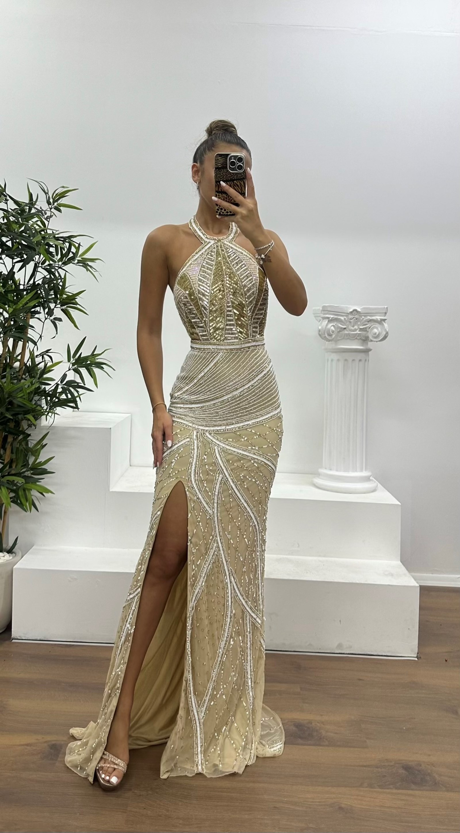 Ürün 36-40 bedene kadar uyumlu, göğüs pedli, astarlı, boyundan bağlamalı, fermuarlı, yırtmaçlı, işlemeli abiye olarak tasarlanmıştır.