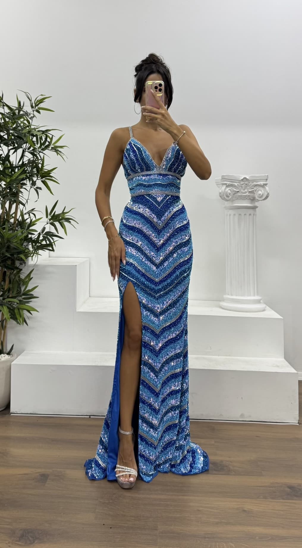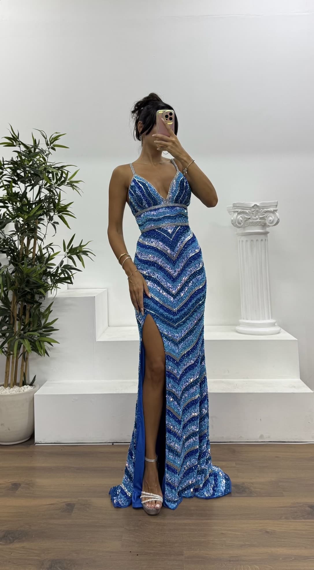 Ürün 36-40 bedene kadar uyumlu, göğüs pedli, astarlı, sırt çapraz ip ve fermuar kapamalı, yırtmaçlı, işlemeli abiye olarak tasarlanmıştır.