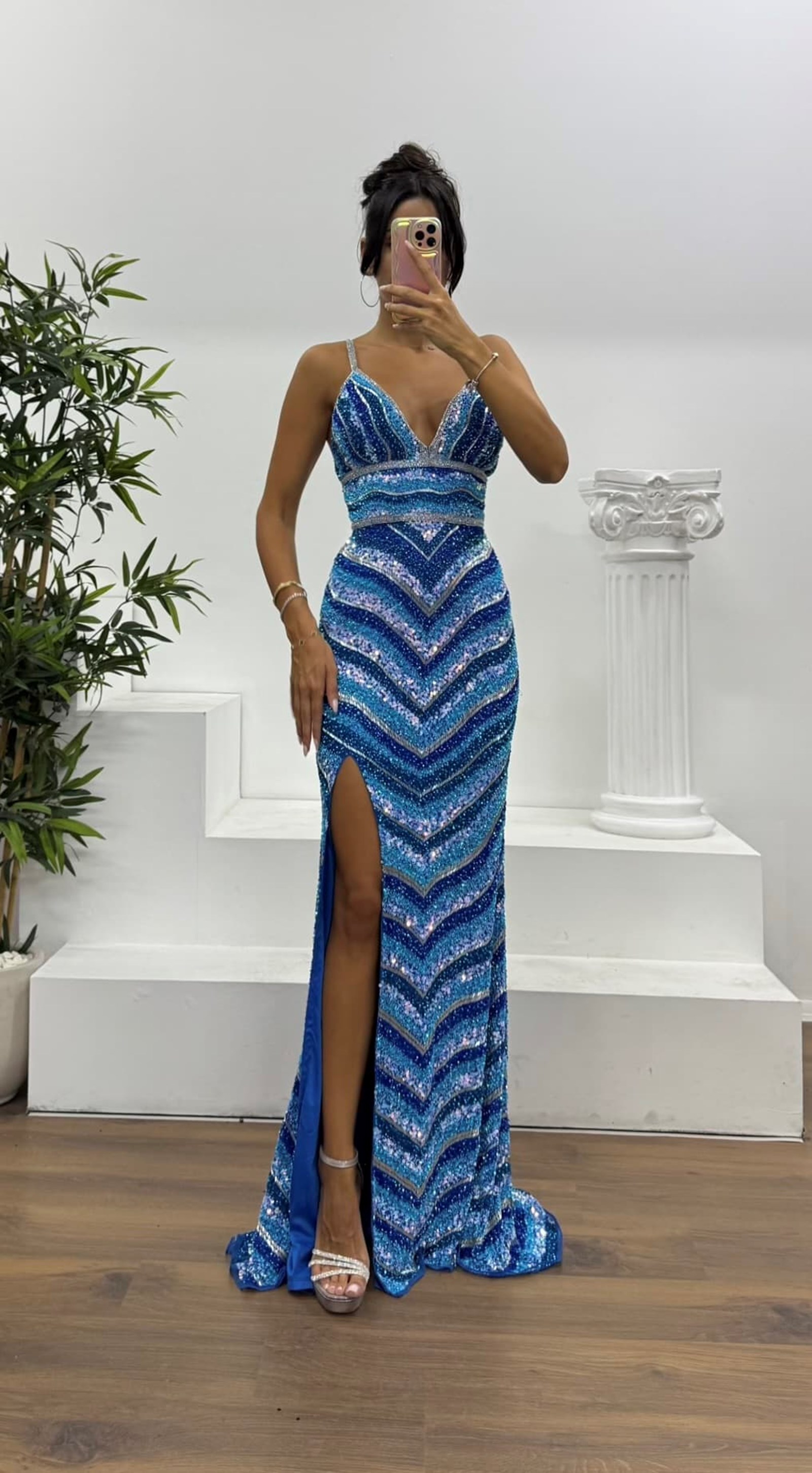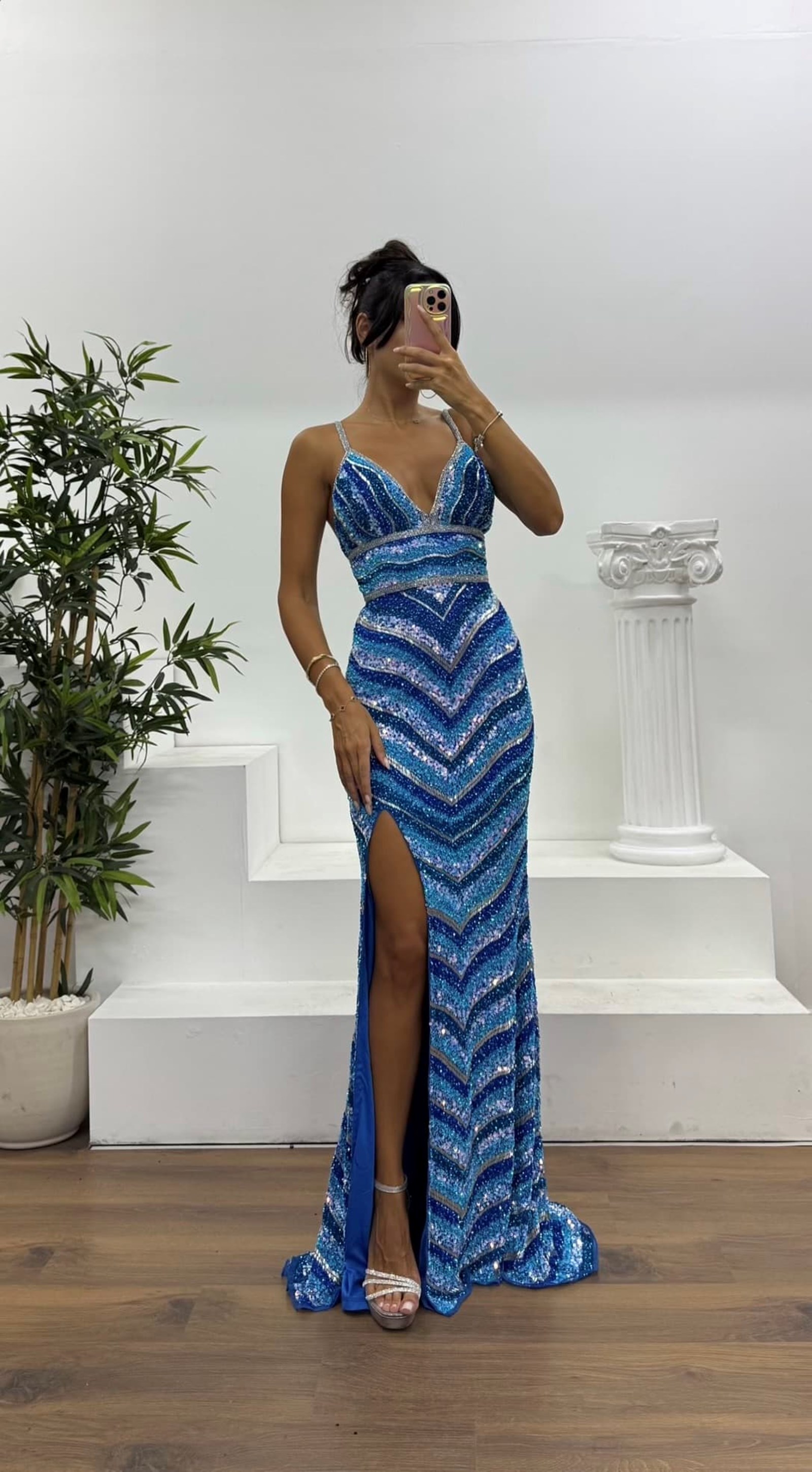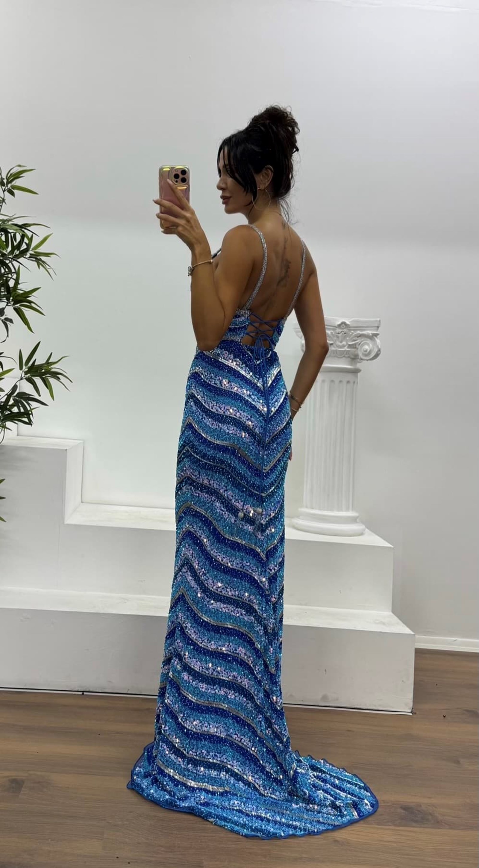 • Mavi İp Askılı Özel El İşlemesi Abiye Elbise