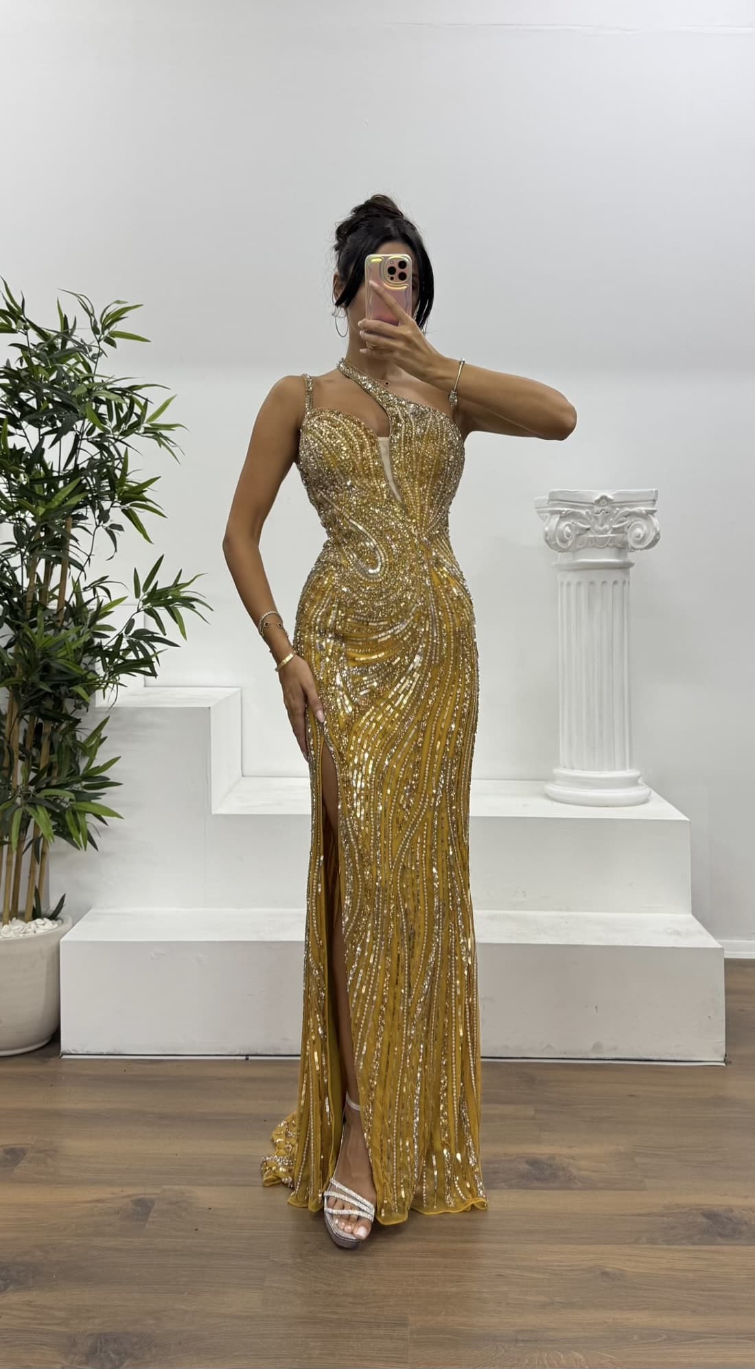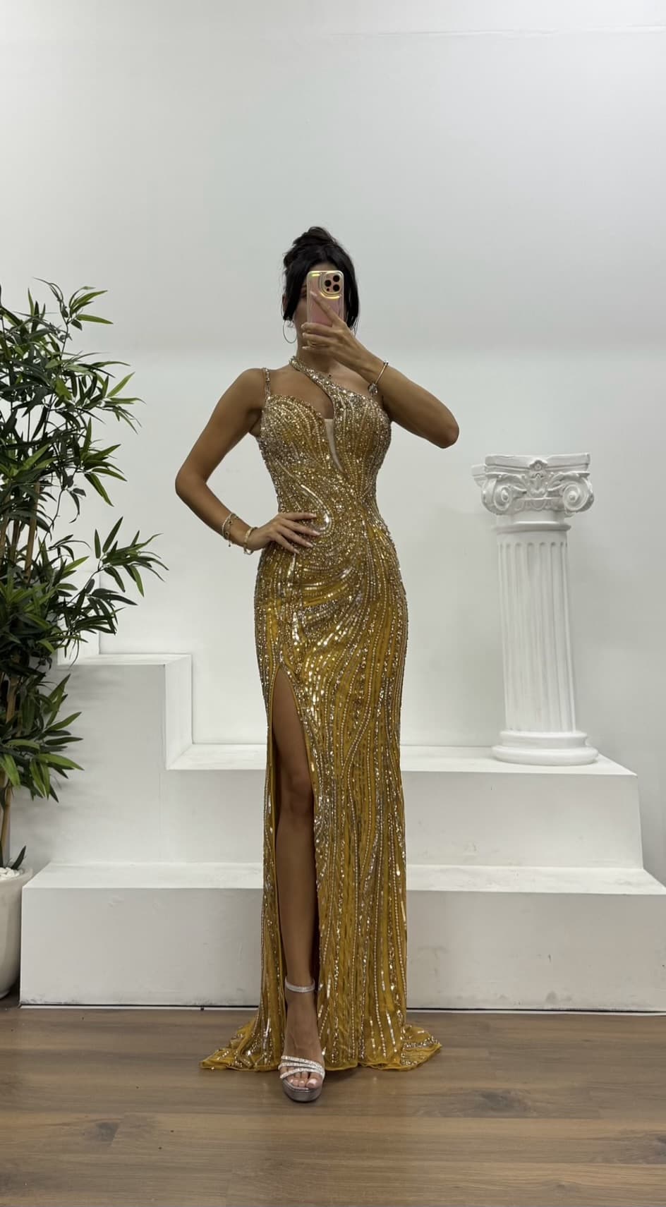 Ürün 36-40 bedene kadar uyumlu, göğüs pedli, astarlı, arka kapama fermuar, yırtmaçlı, işlemeli abiye olarak tasarlanmıştır.