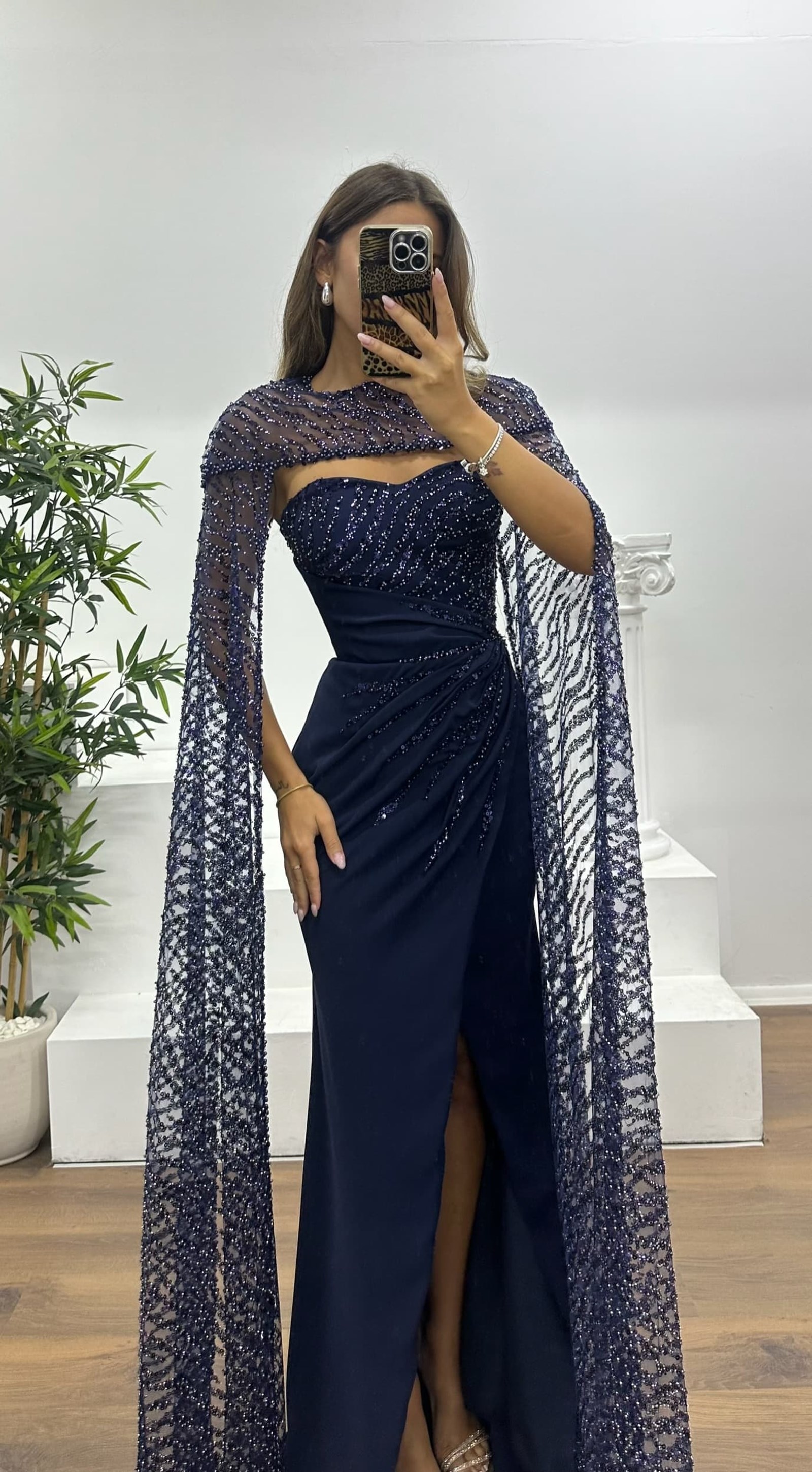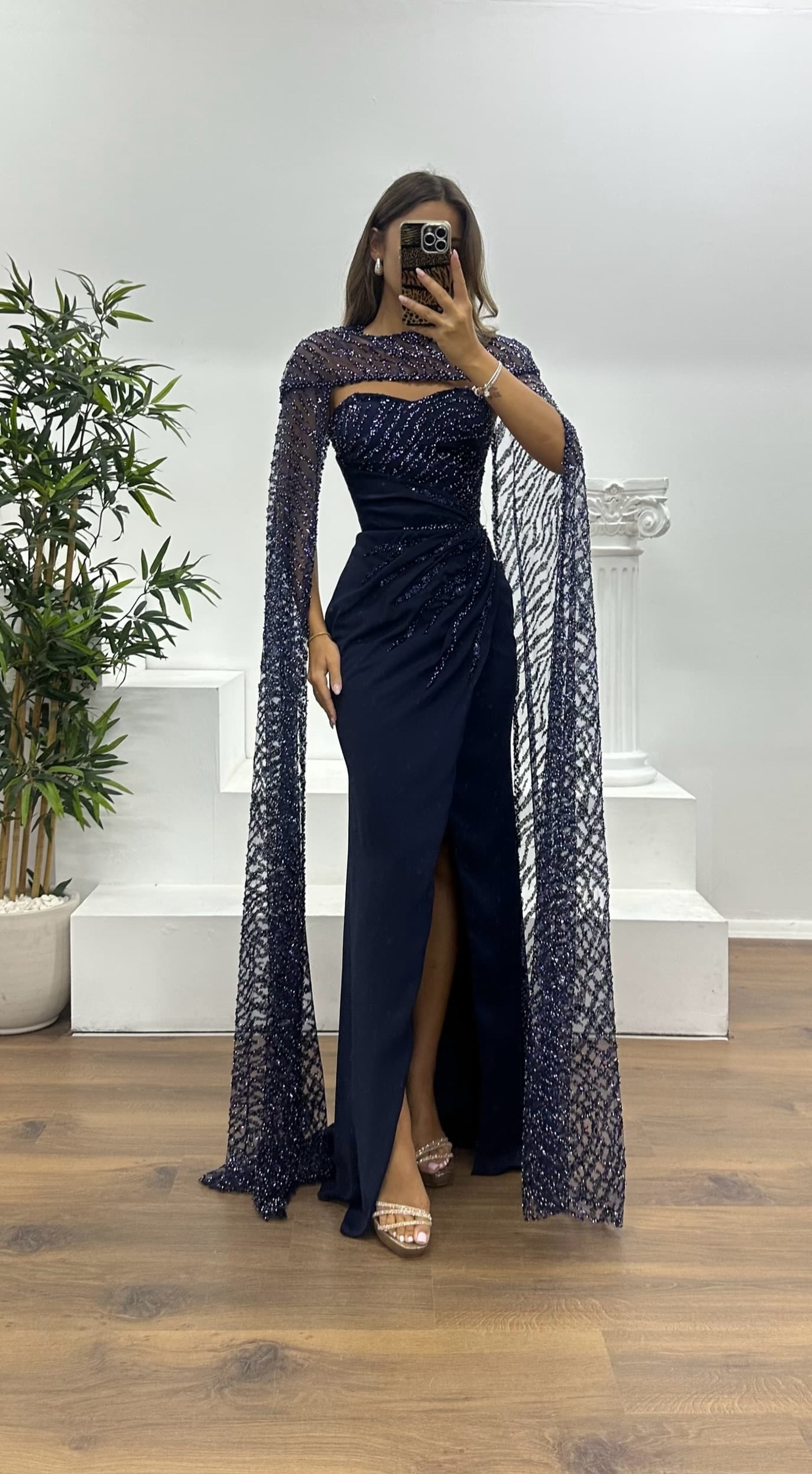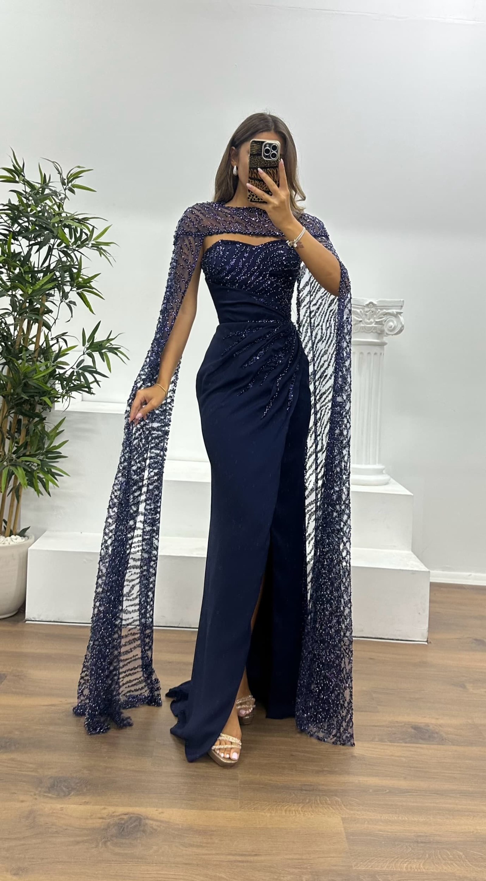 Ürün 36-42 bedene kadar uyumlu, göğüs pedli, astarlı, arka kapama fermuar, yırtmaçlı, işlemeli, pelerinli abiye olarak tasarlanmıştır.