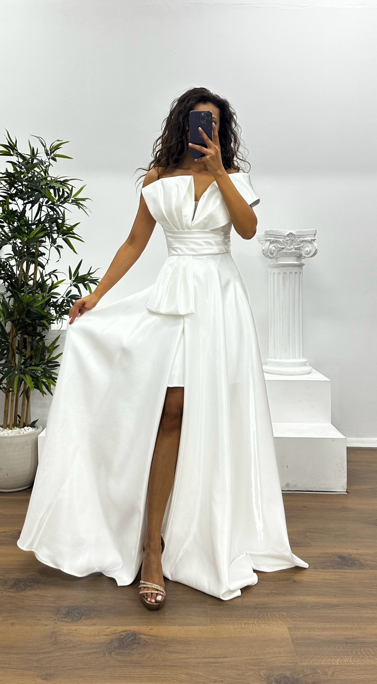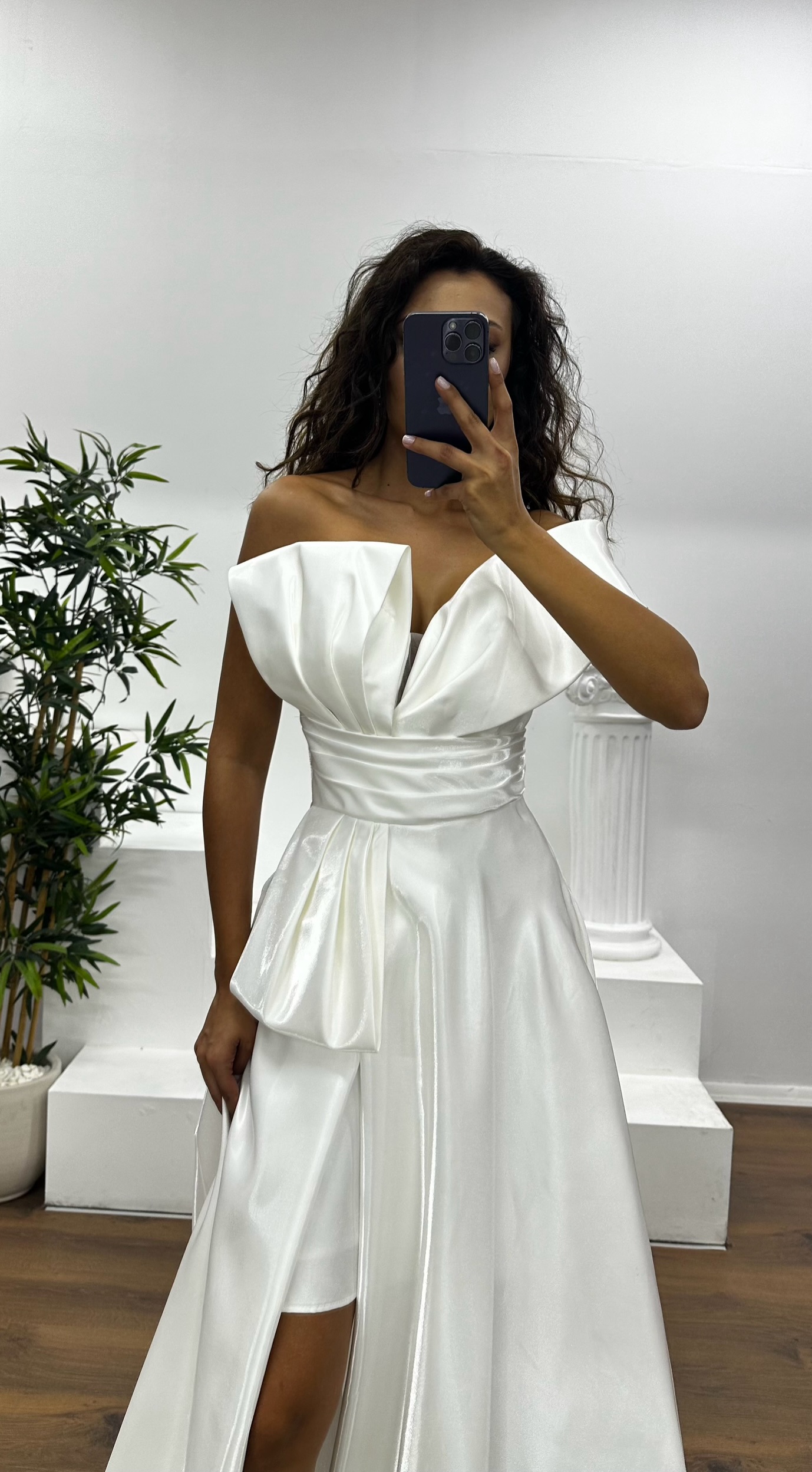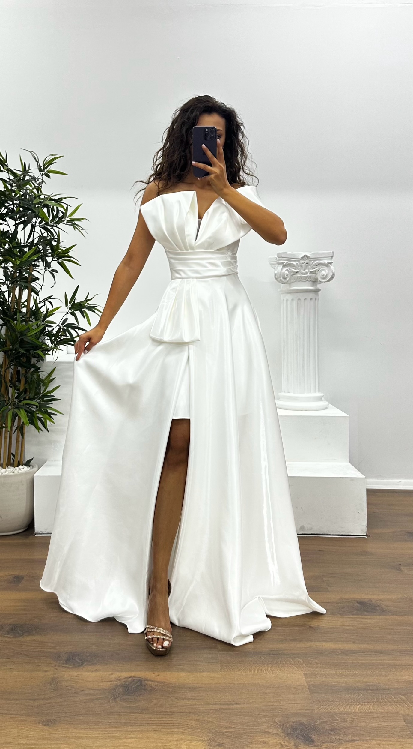 • Beyaz Tek Omuz Kabarık Abiye Elbise