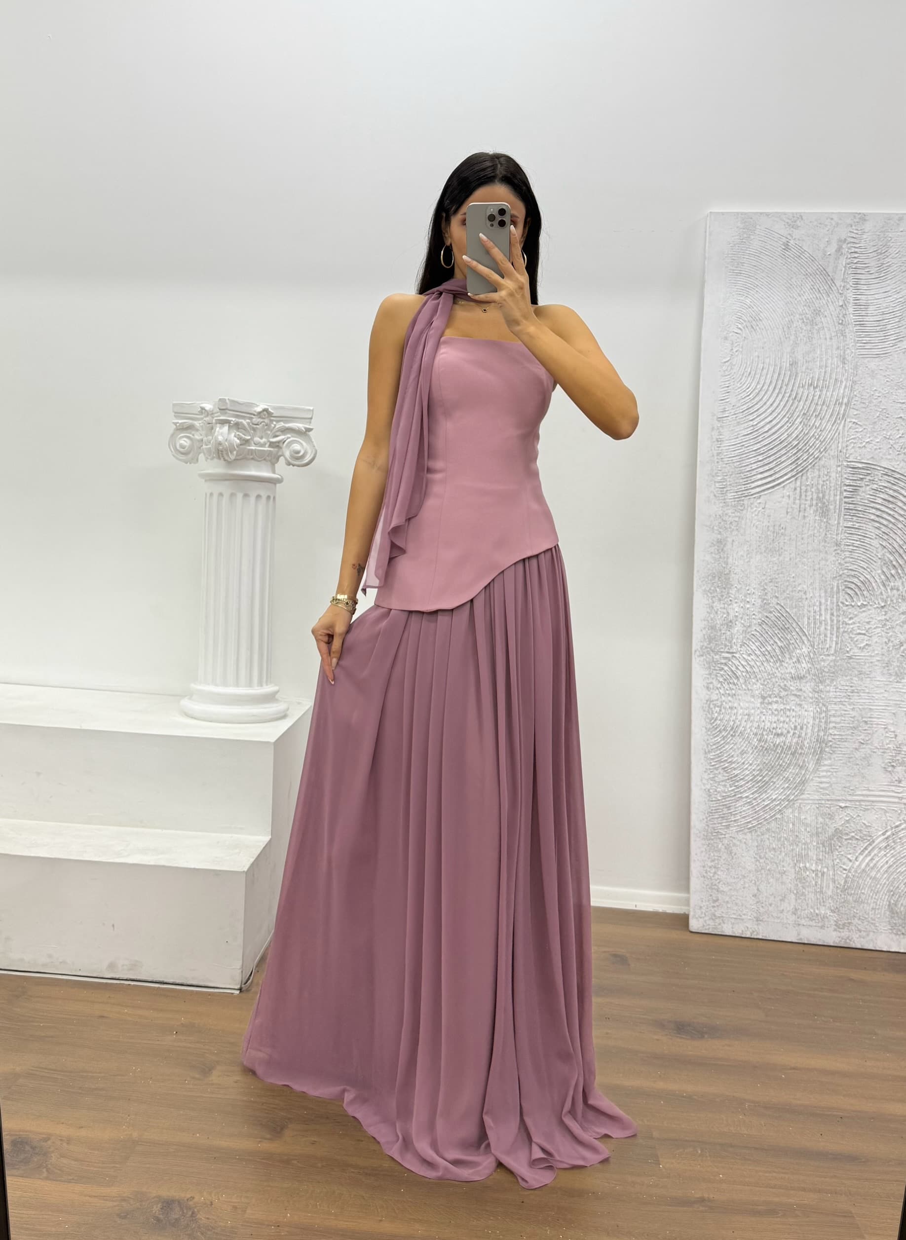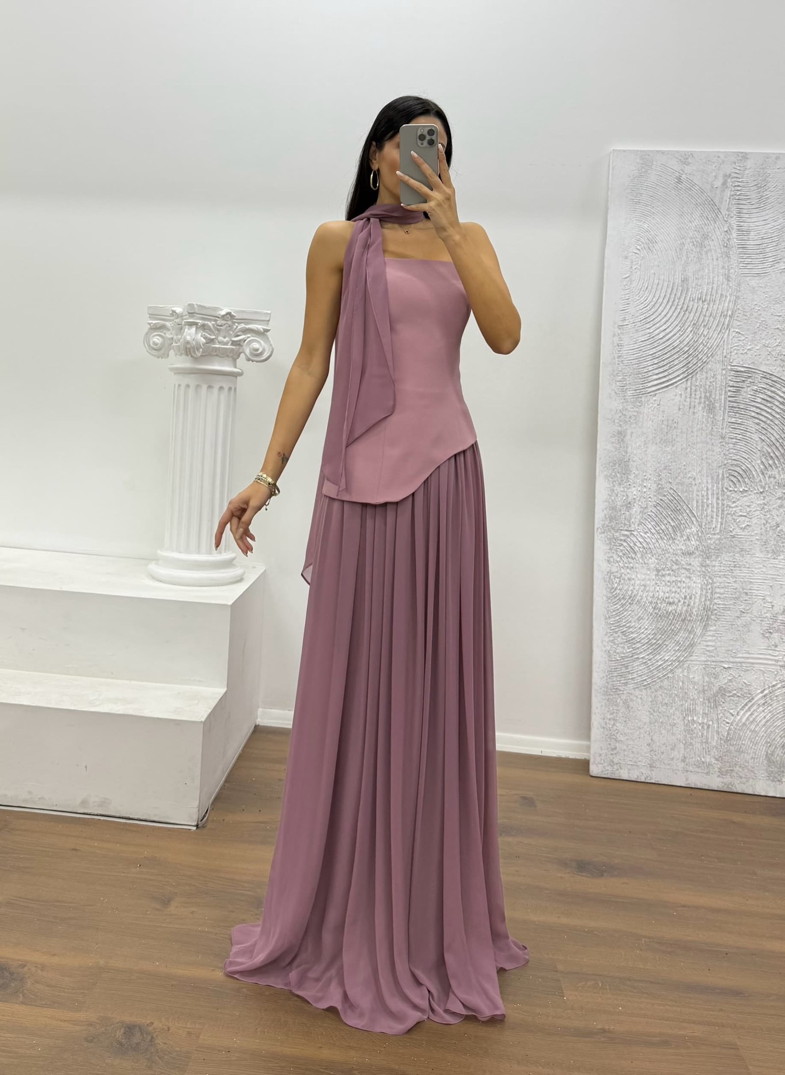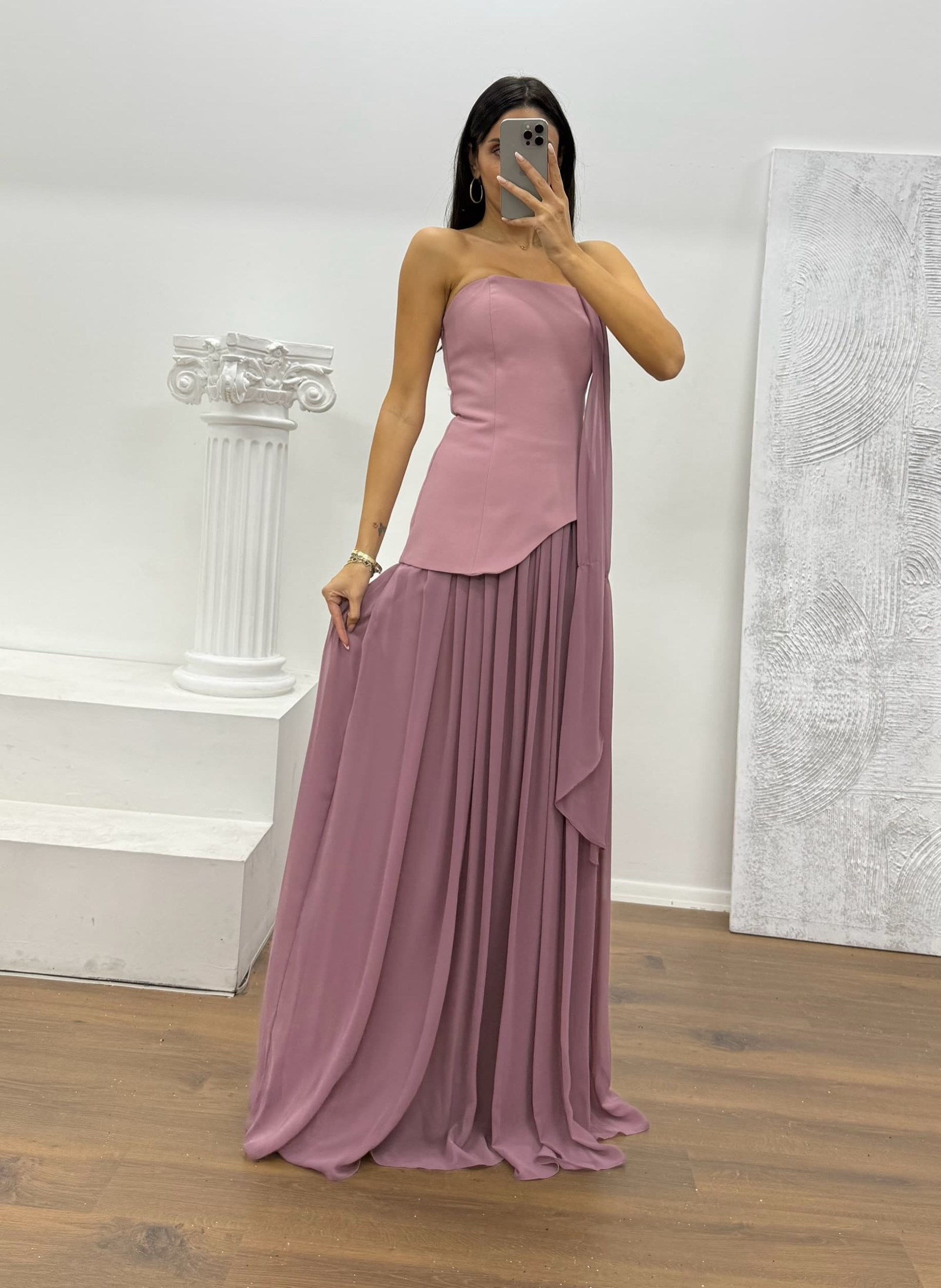 • Pudra Straplez Şifon Detay Abiye Elbise