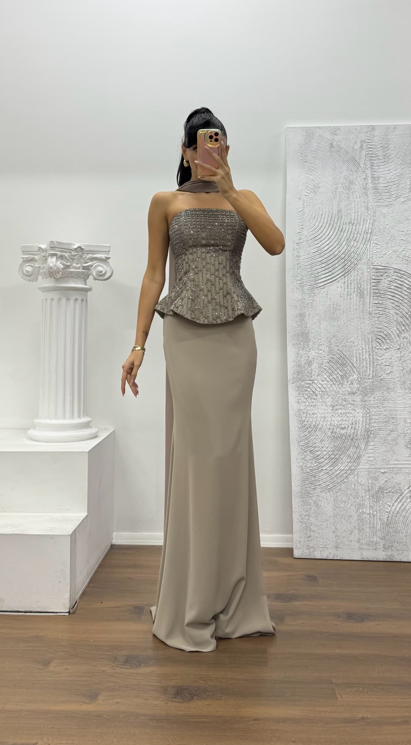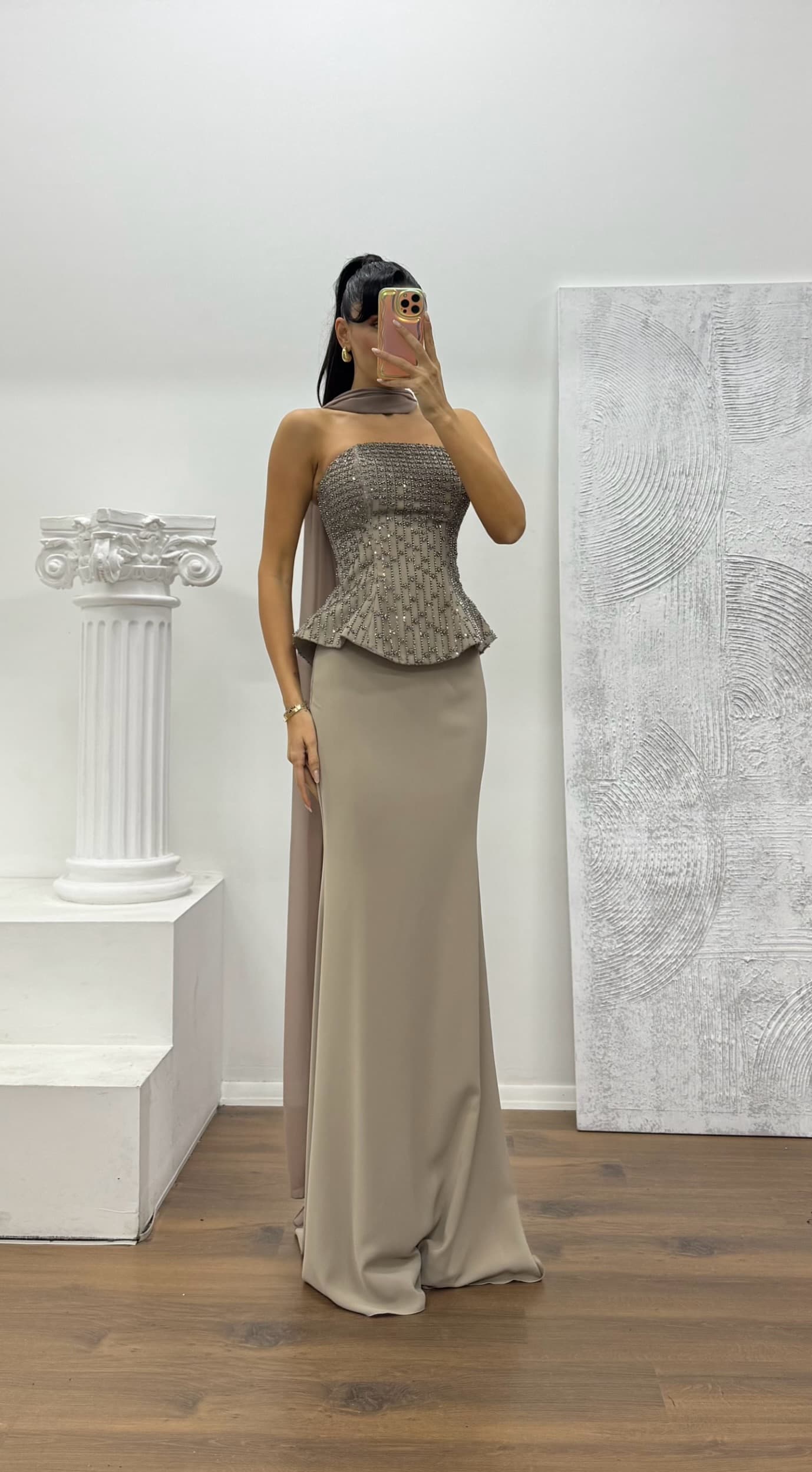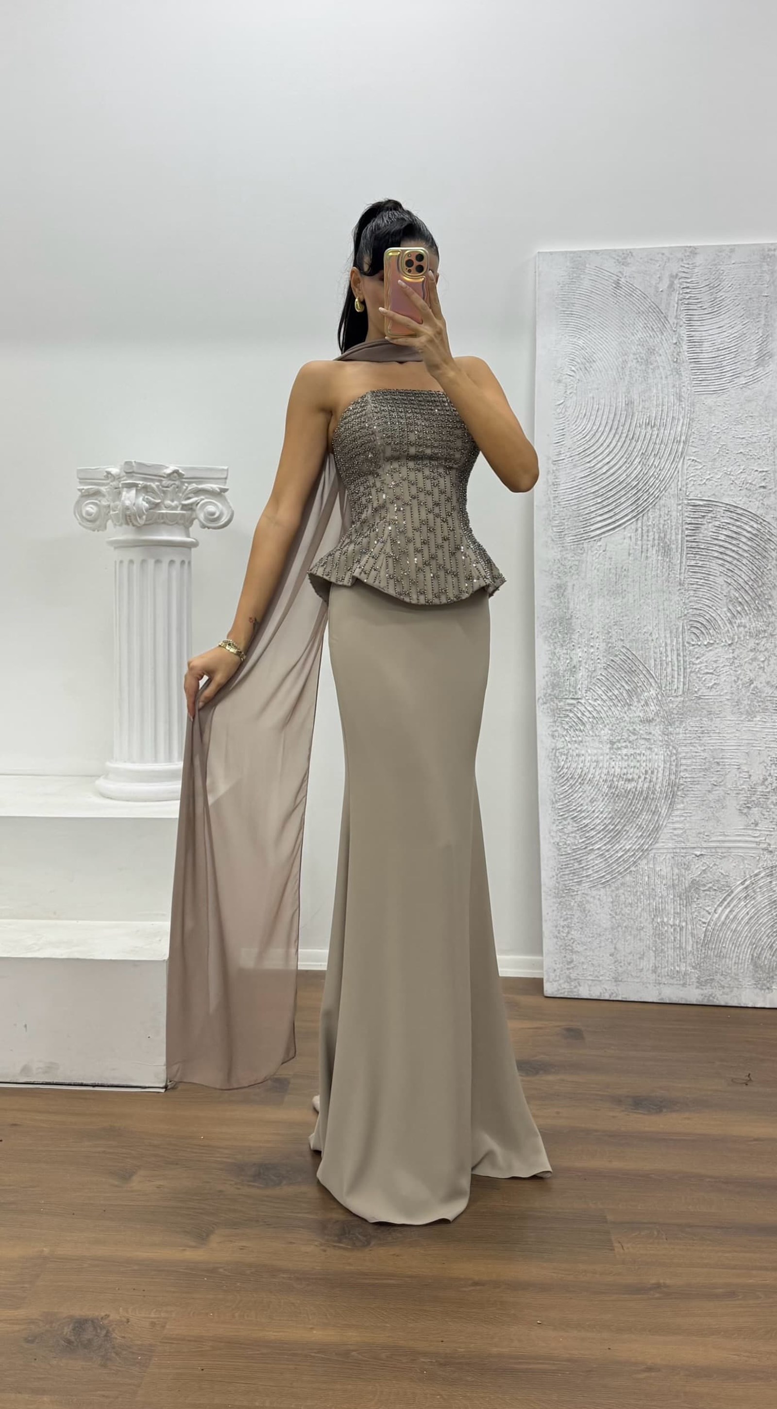 Ürün 36-44 bedene kadar uyumlu, göğüs pedli, astarlı, arka kapama fermuar, şifon şal, işlemeli abiye olarak tasarlanmıştır.