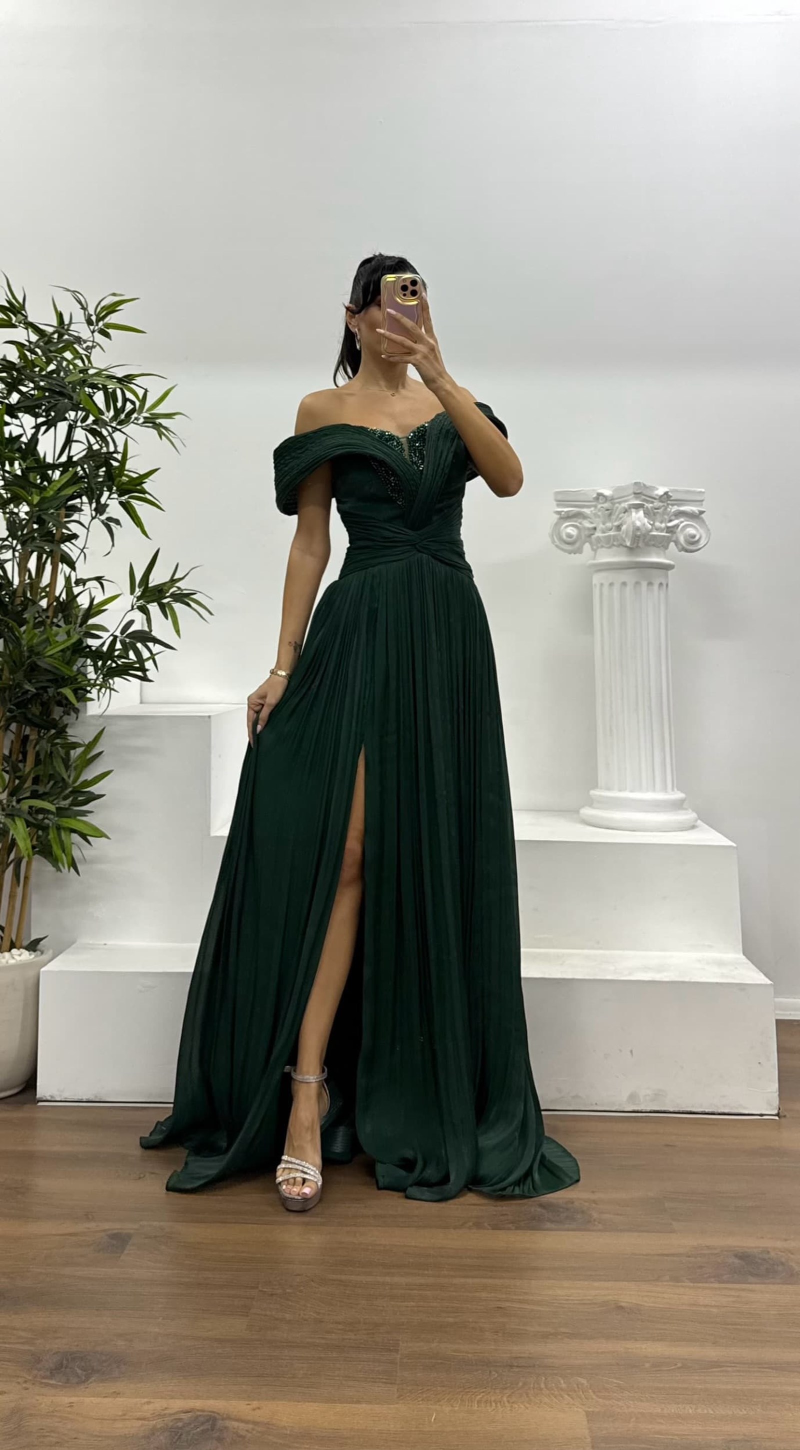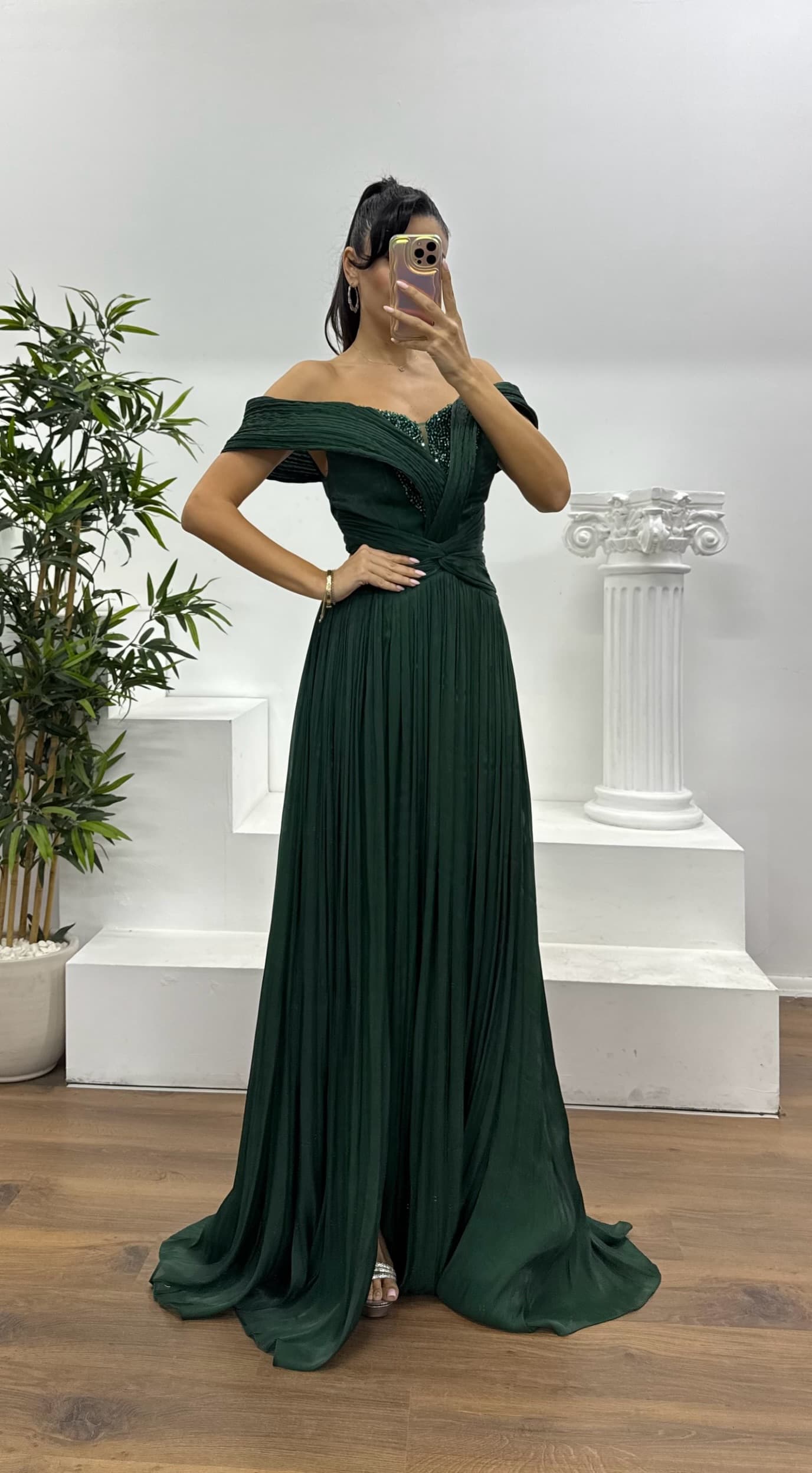 Zümrüt Omzu Açık  Şifon Abiye Elbise