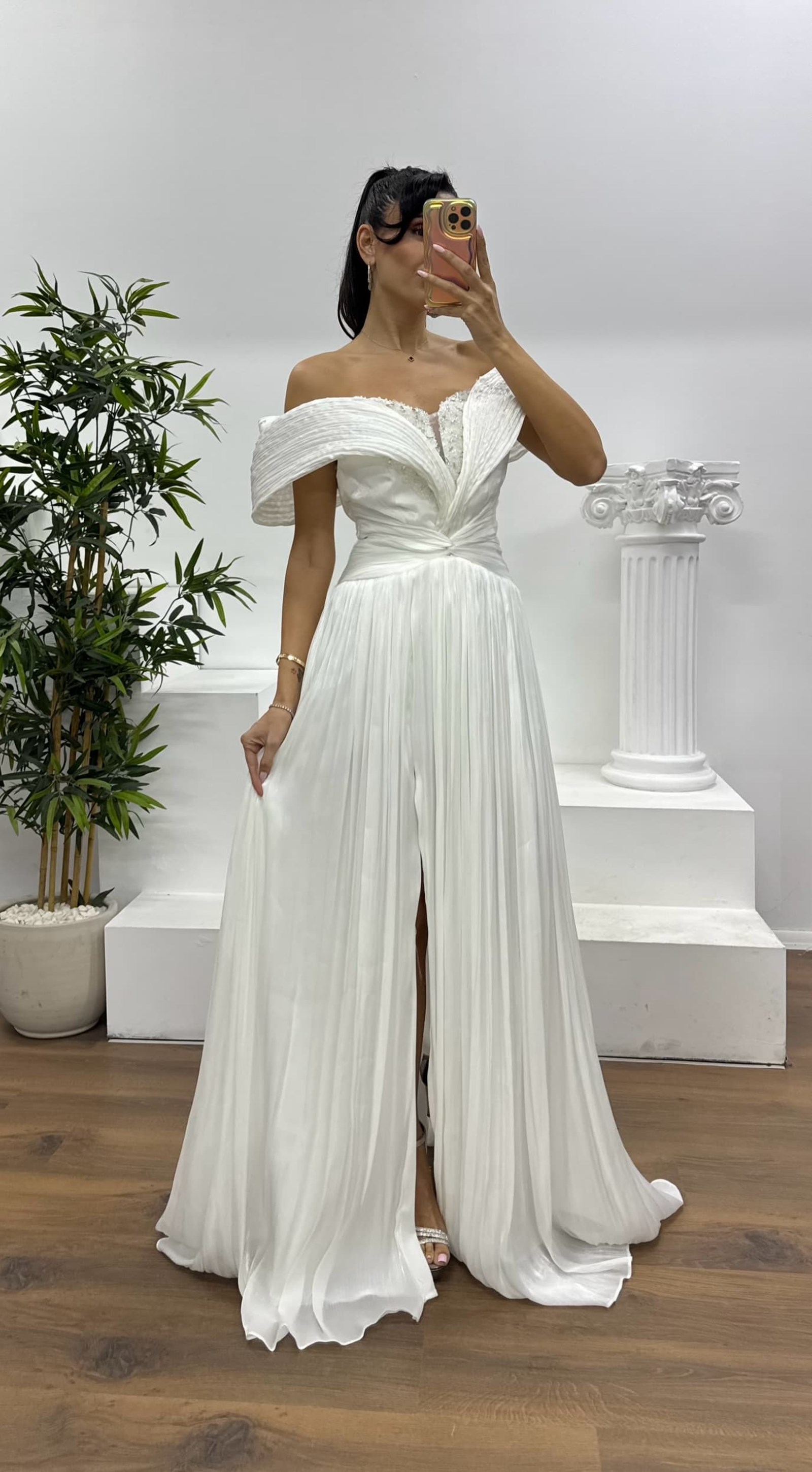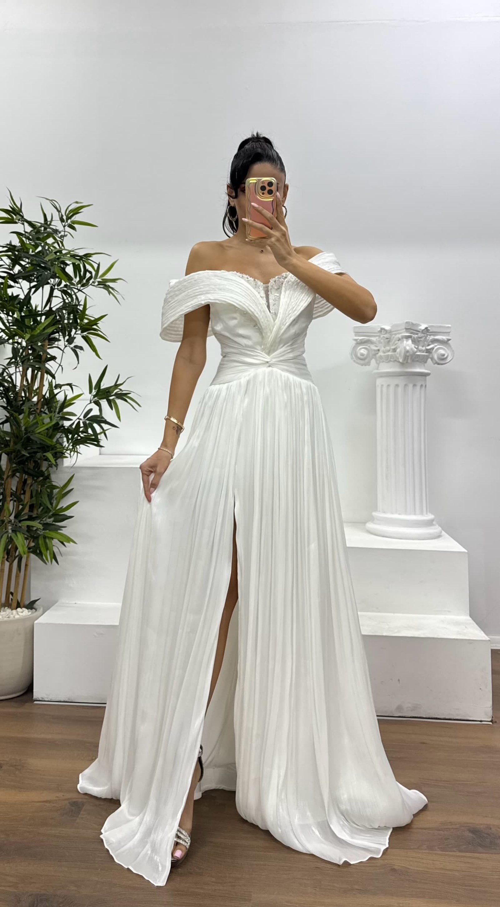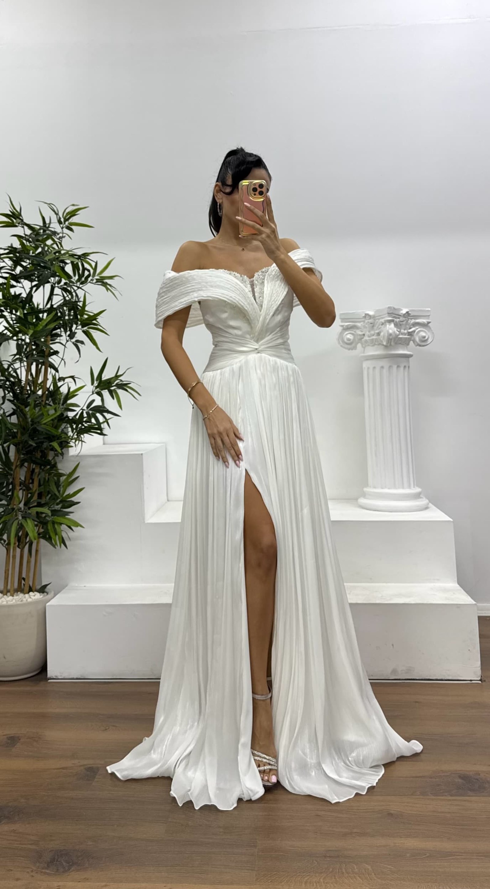 • Beyaz Omzu Açık  Şifon Abiye Elbise