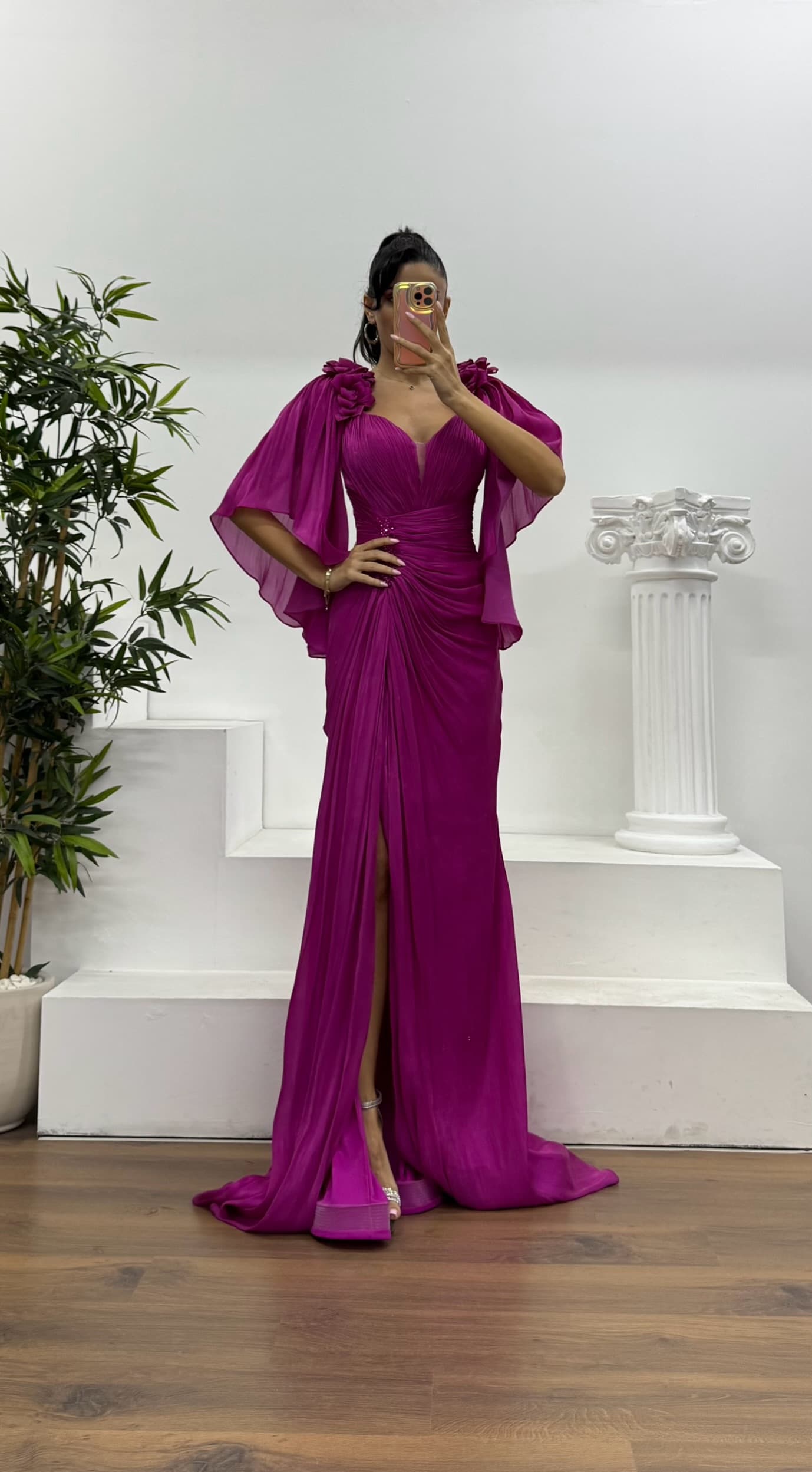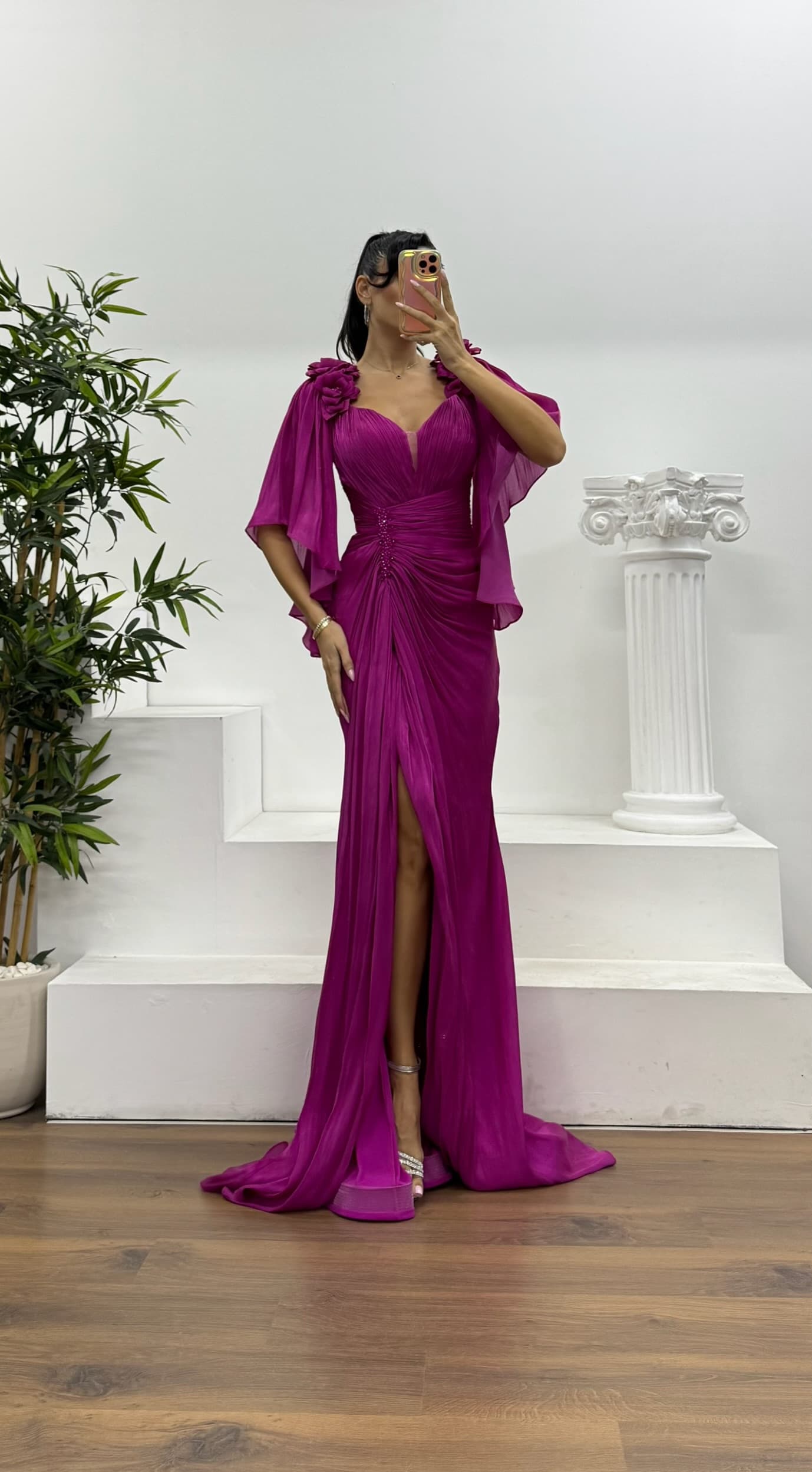 • Gül Kurusu Drapeli Şifon Abiye Elbise