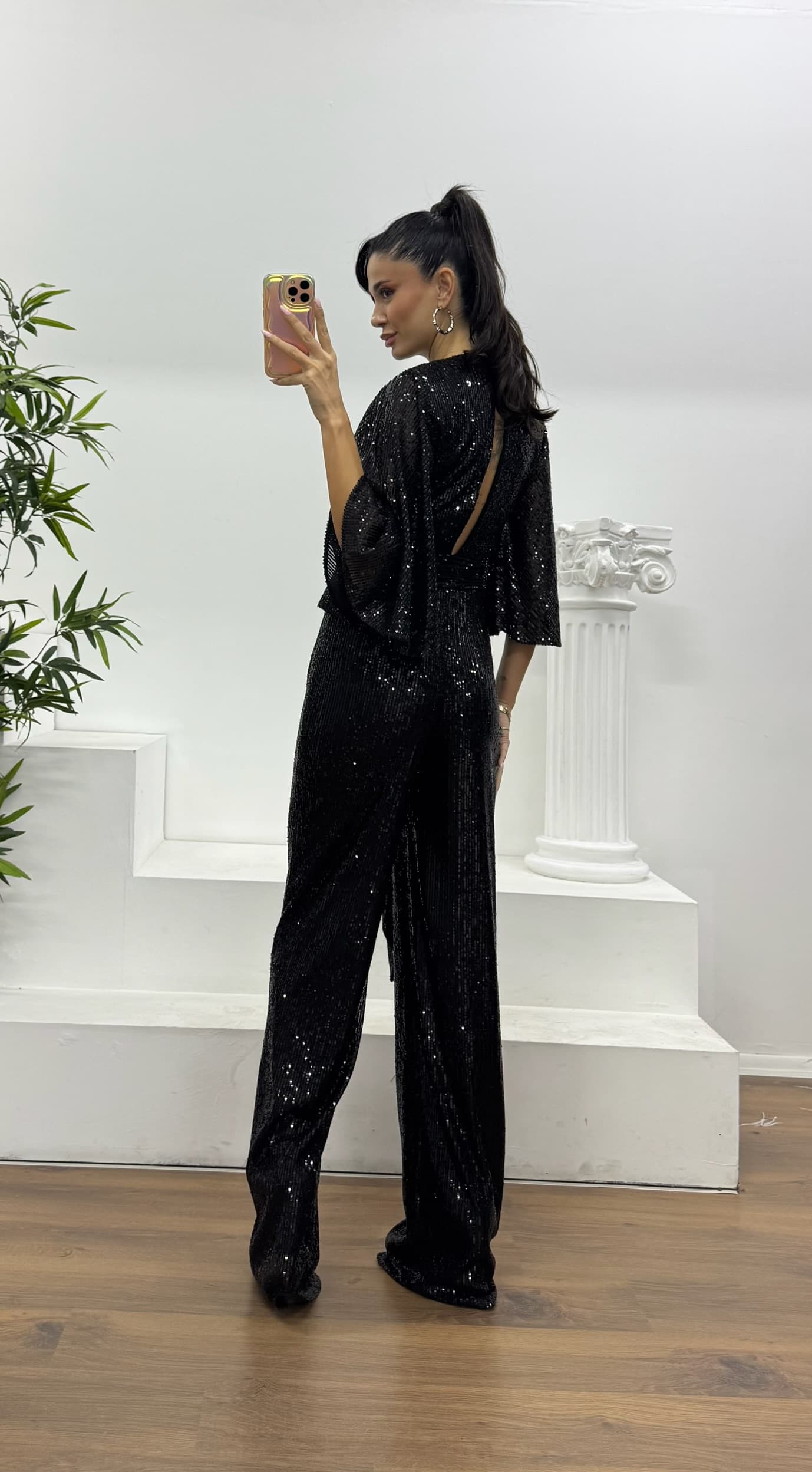 Siyah Pul Payet Pelerin Kol Özel Tasarım Abiye Tulum