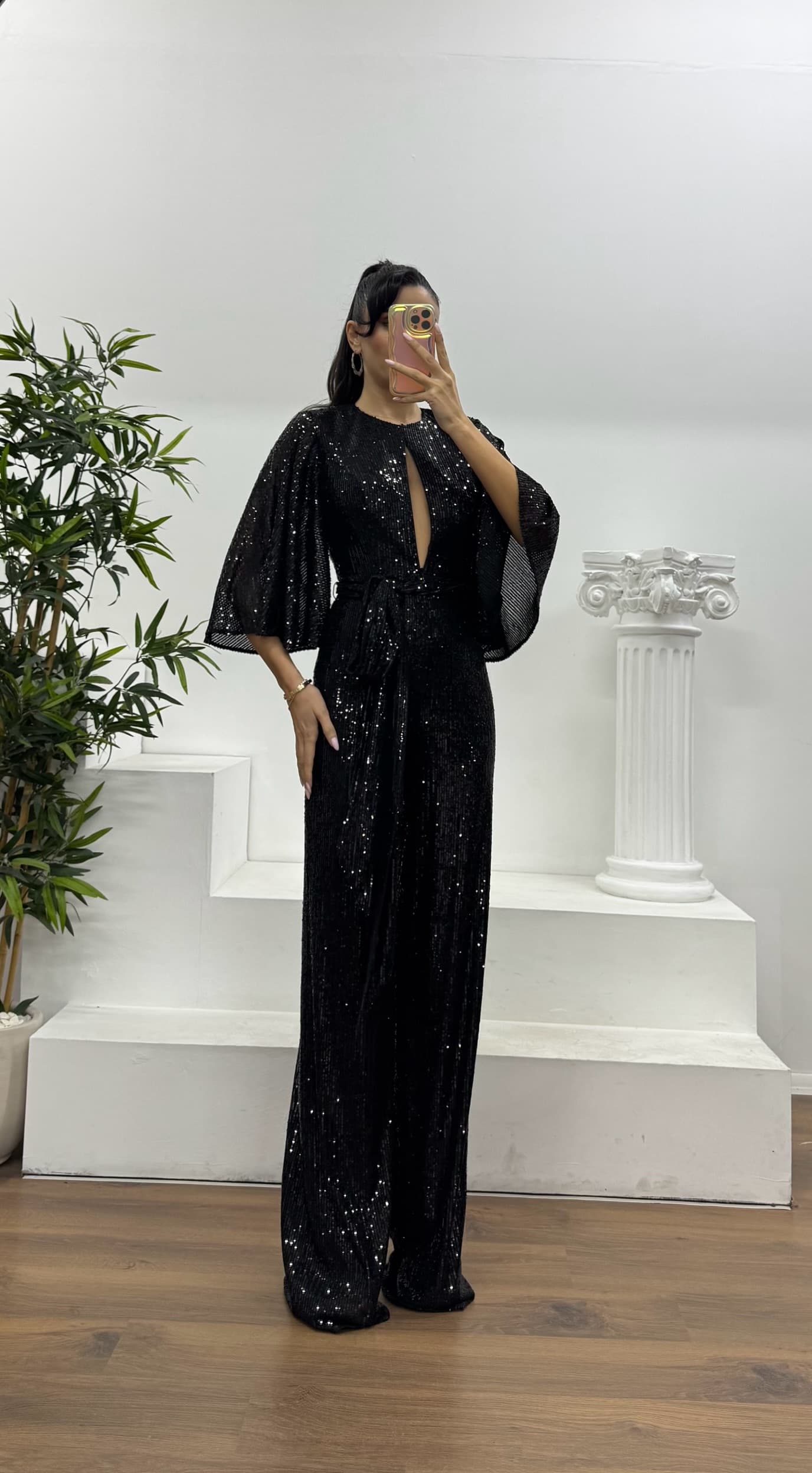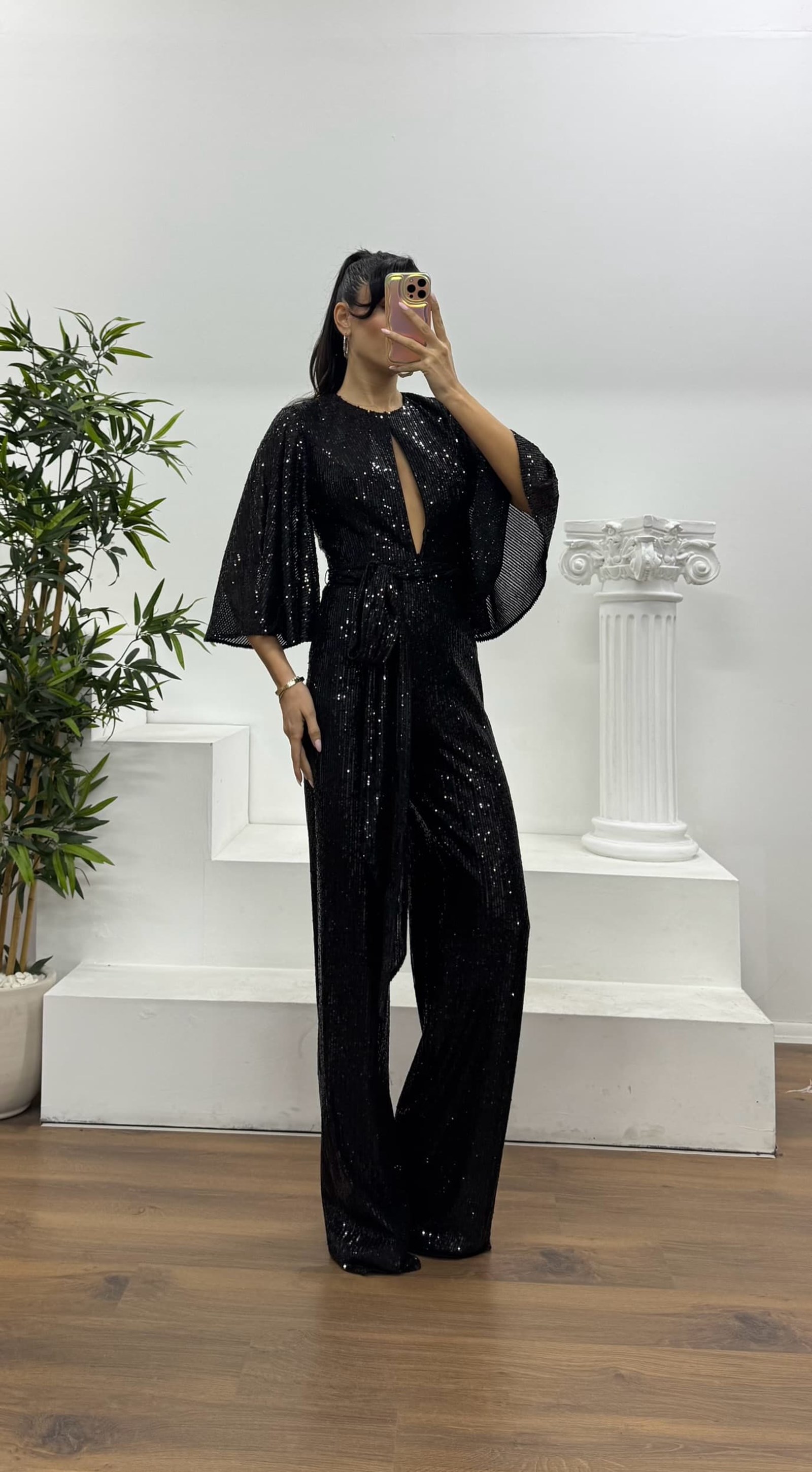 • Siyah Pul Payet Pelerin Kol Özel Tasarım Abiye Tulum