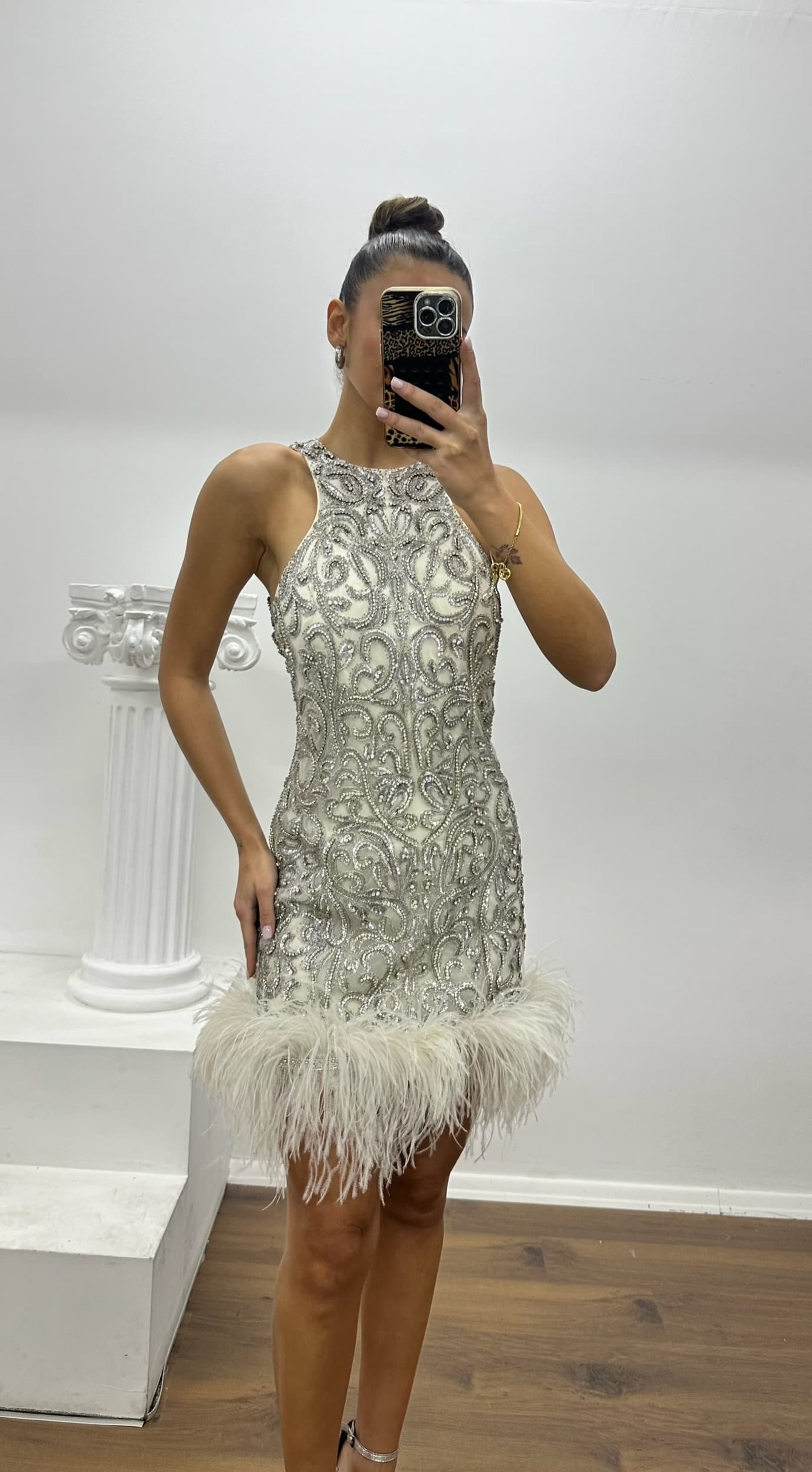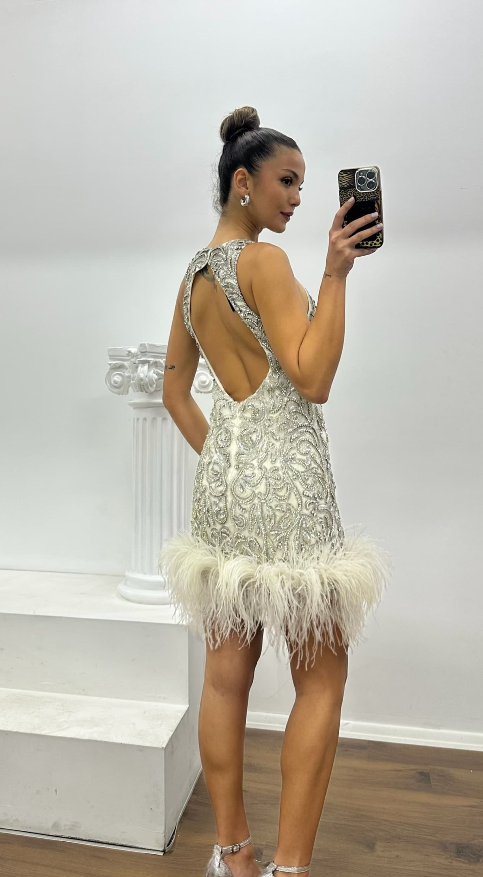 Ürün 36 bedene kadar uyumludur. göğüs pedli, astarlı, arka kapama fermuar, sırt dekolteli, halter yaka, tüy detay abiye olarak tasarlanmıştır.