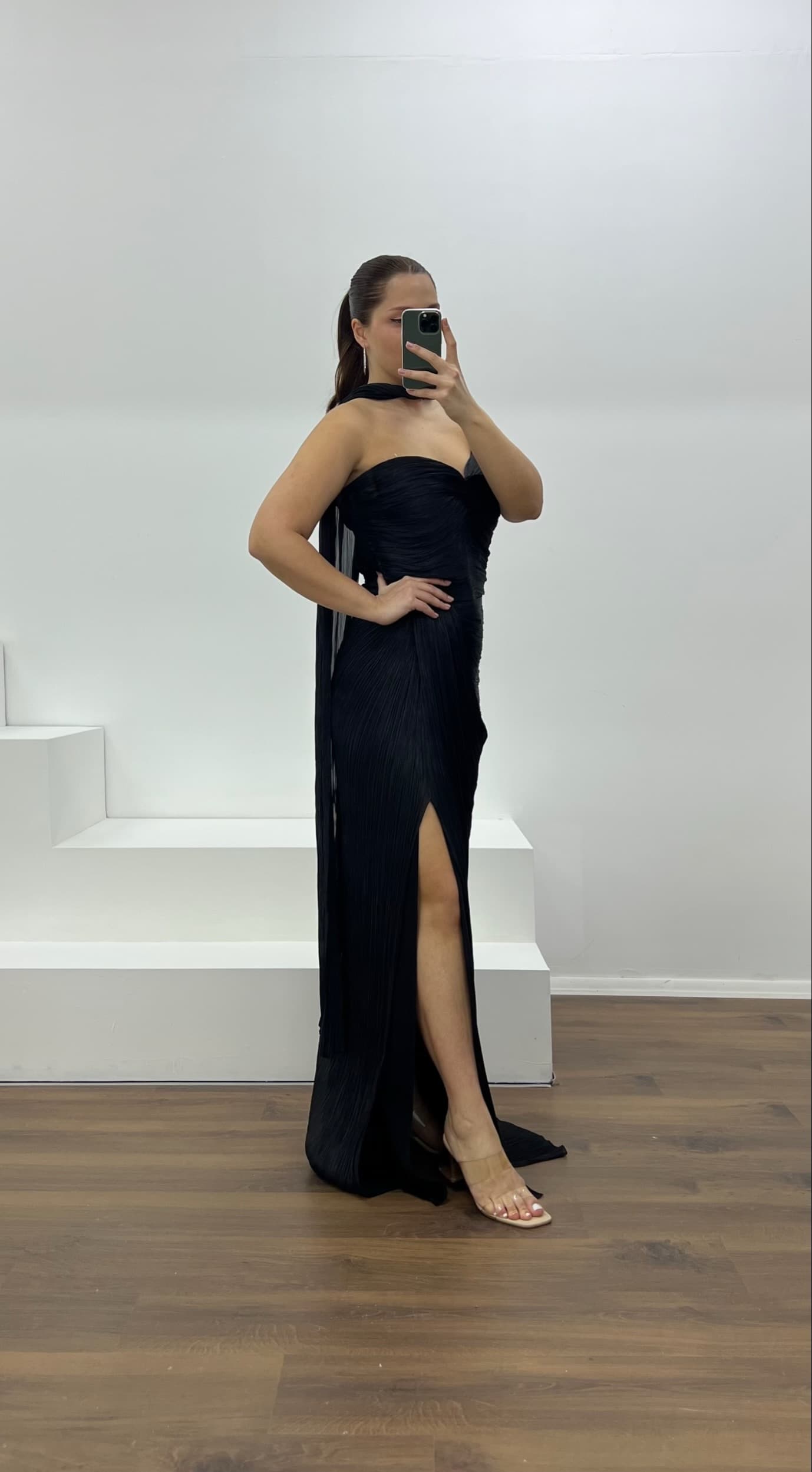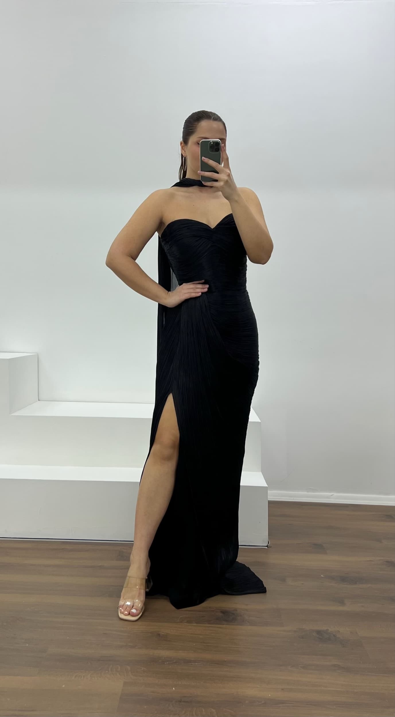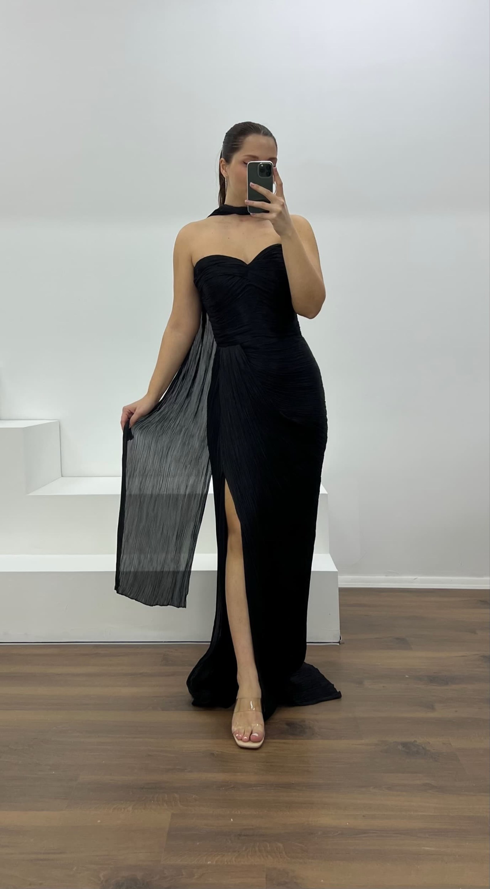Siyah Straplez Piliseli Büyük Beden Abiye Elbise