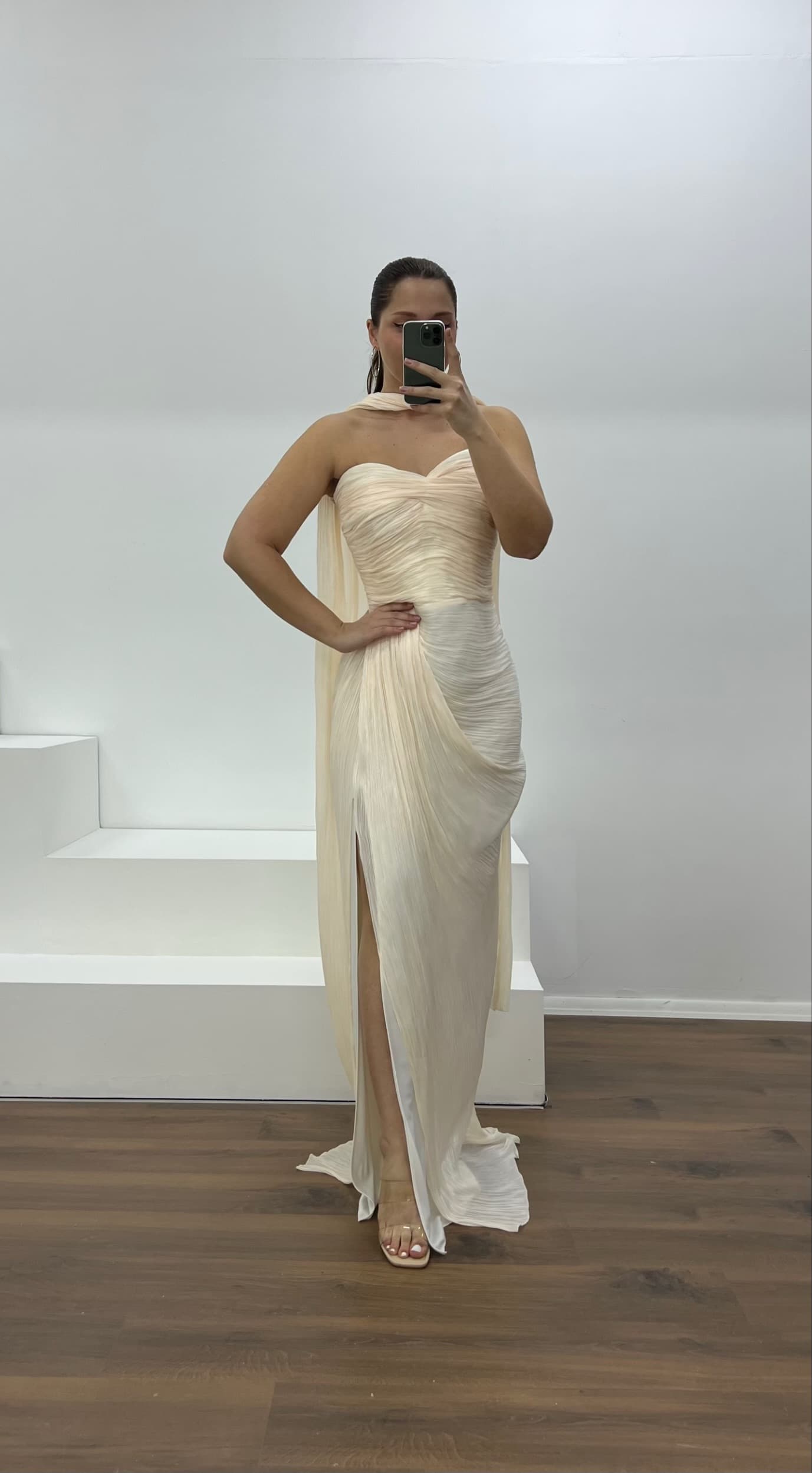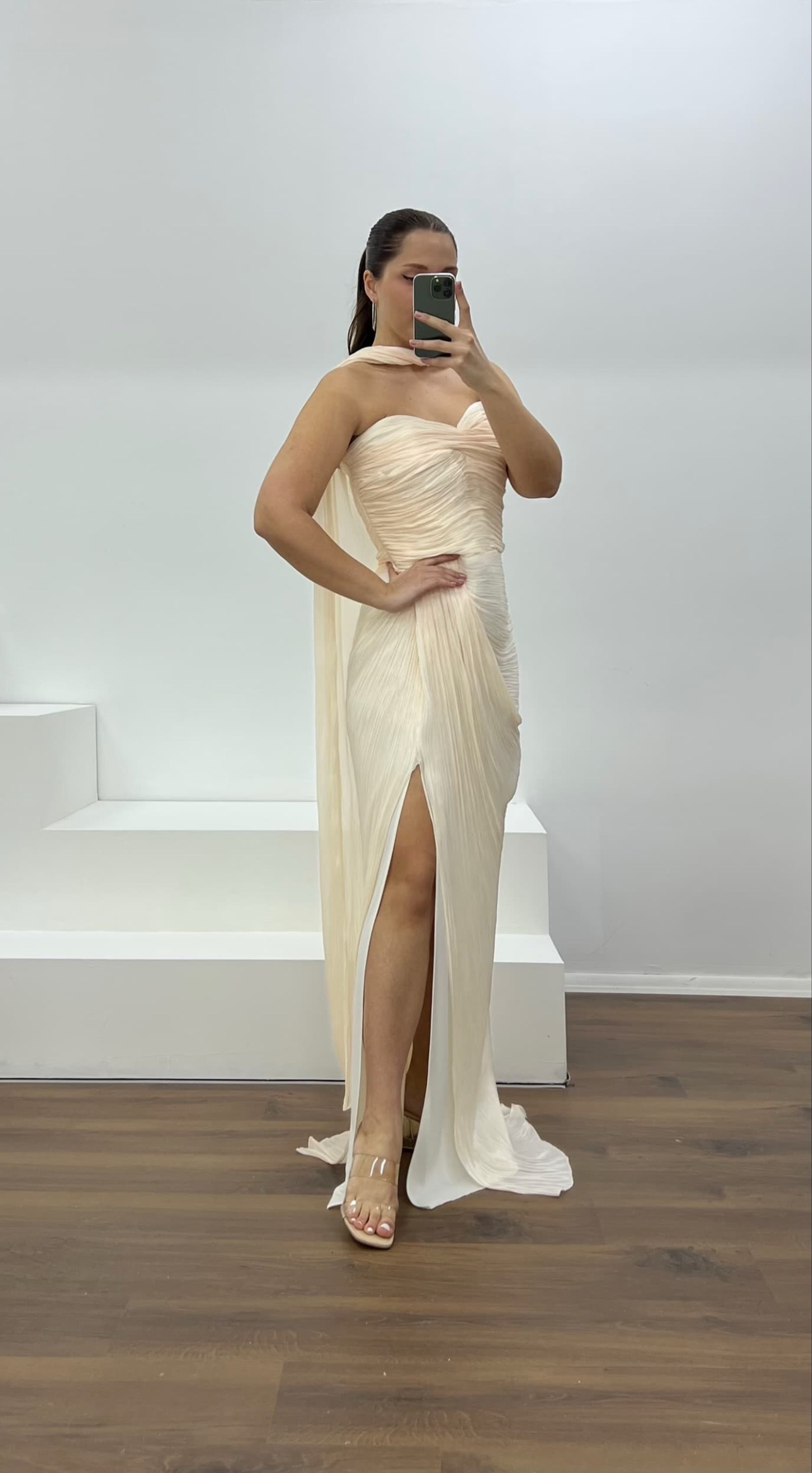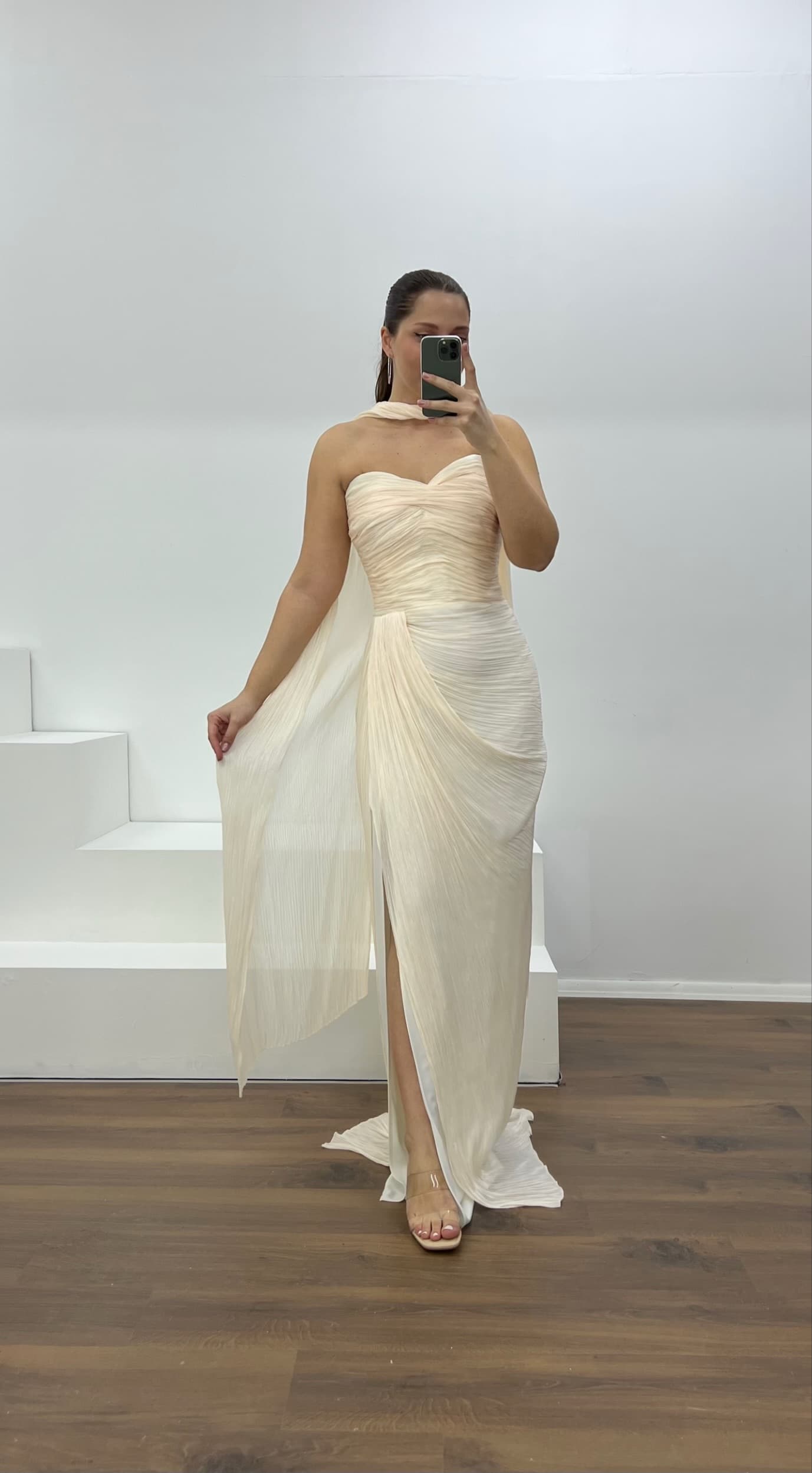 • Ekru Straplez Piliseli Büyük Beden Abiye Elbise
