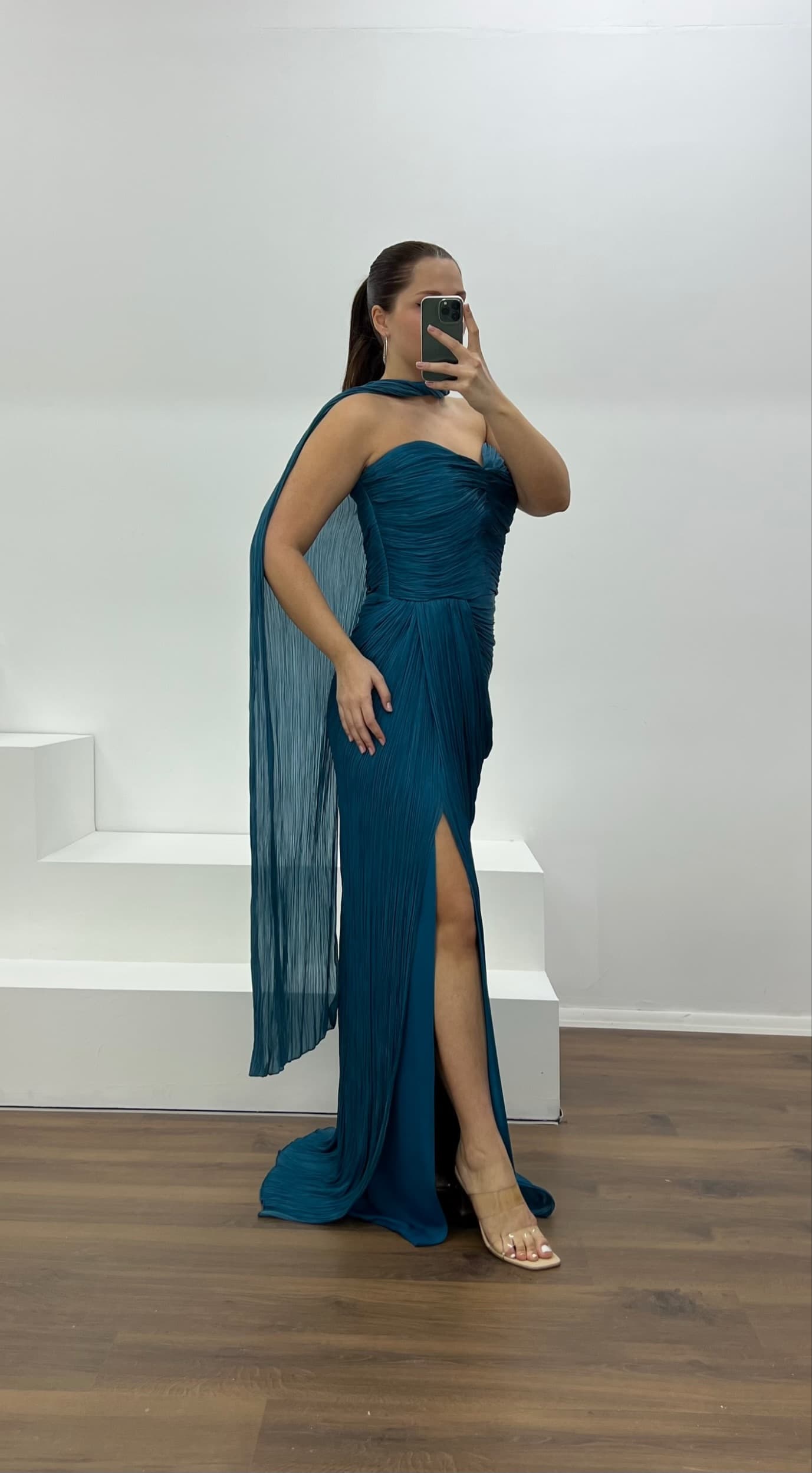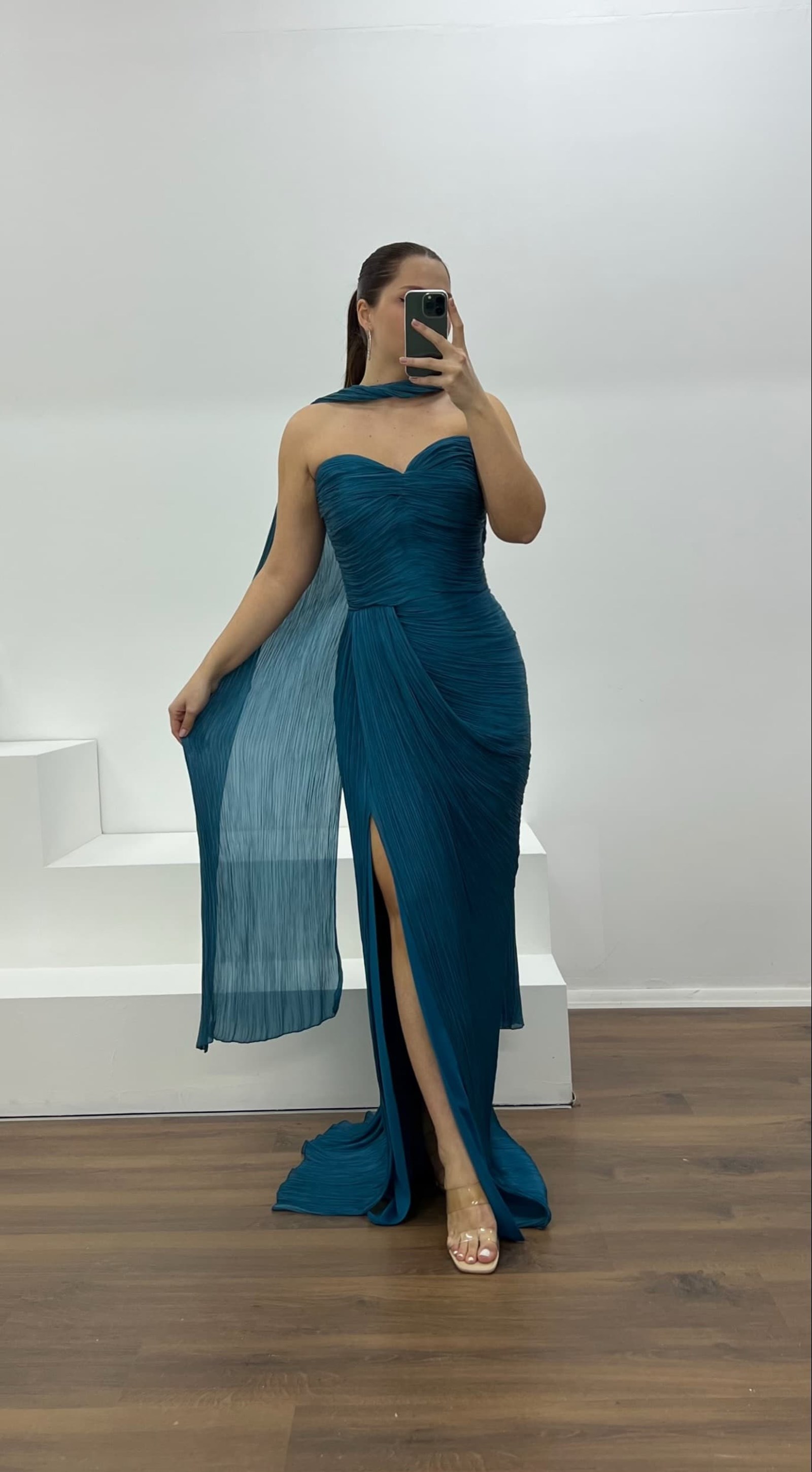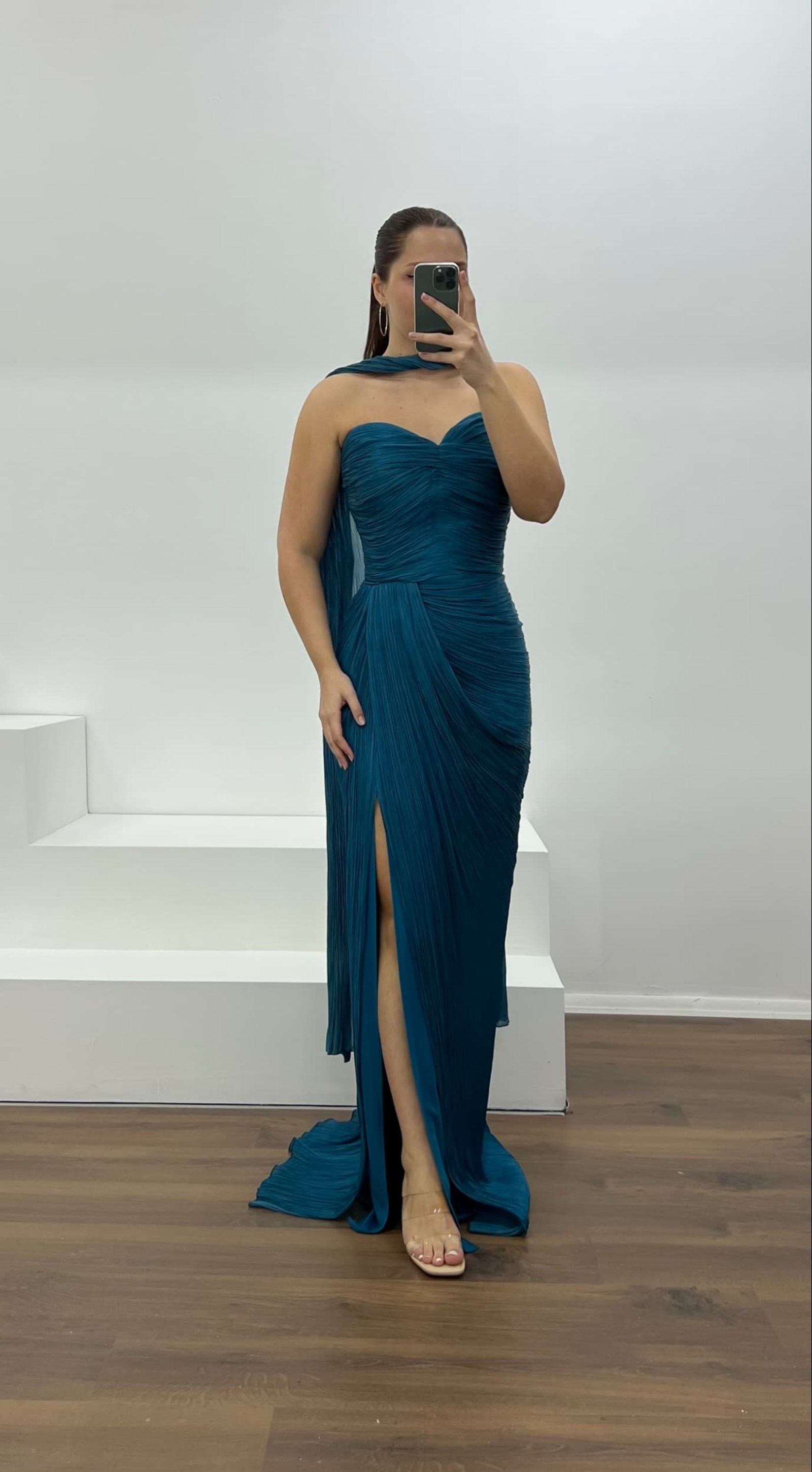 • Petrol Straplez Piliseli Büyük Beden Abiye Elbise