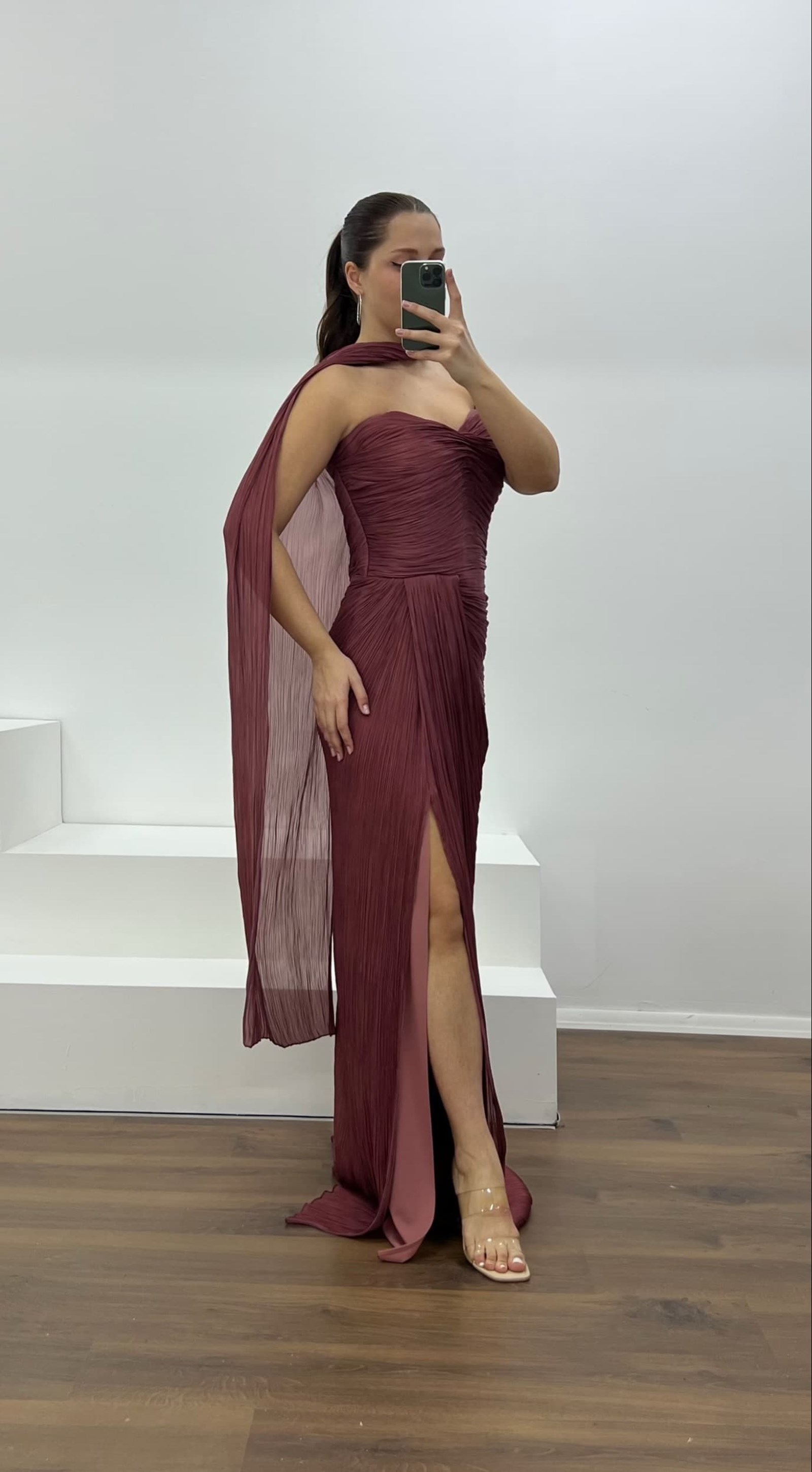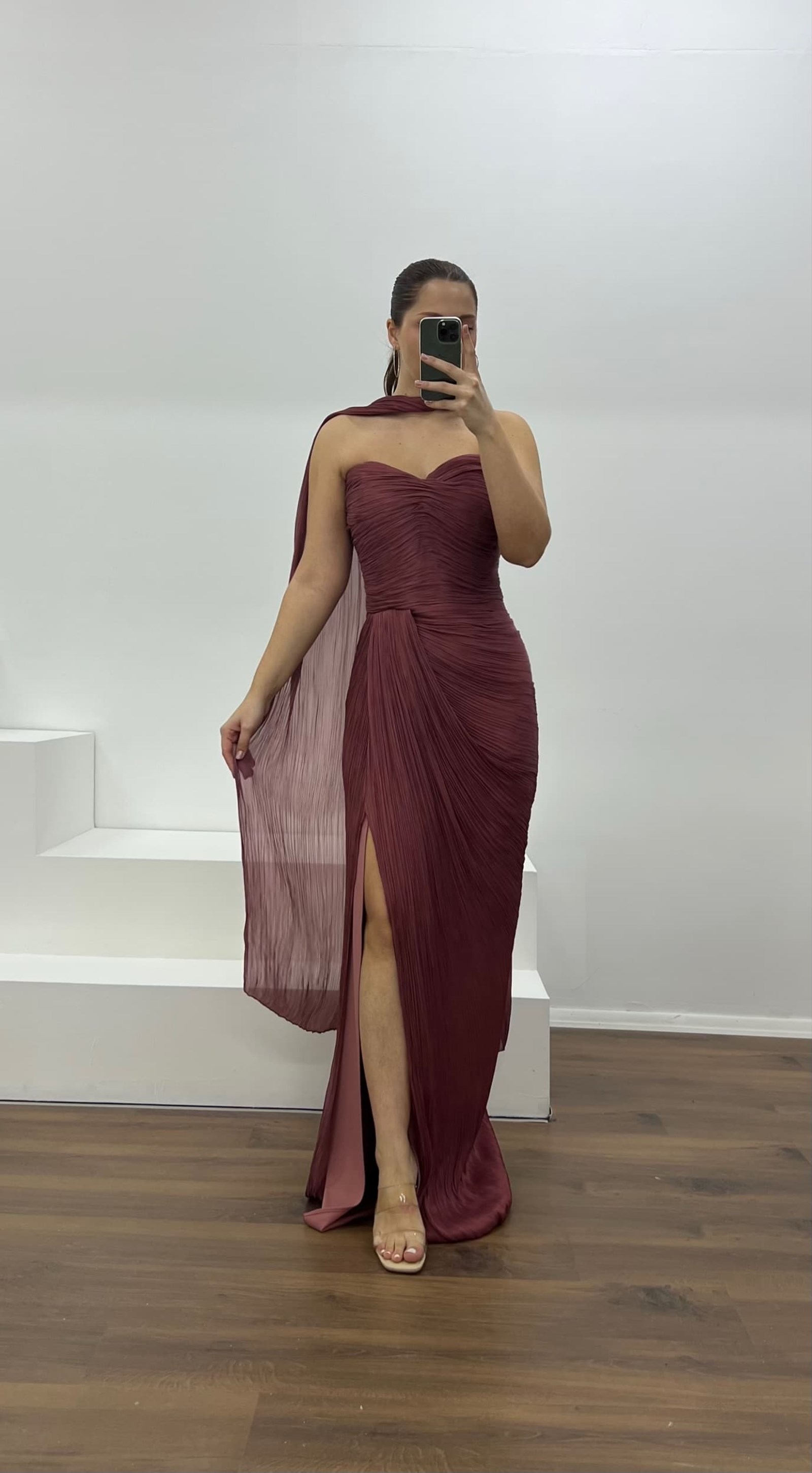 • Gül Kurusu Straplez Piliseli Büyük Beden Abiye Elbise