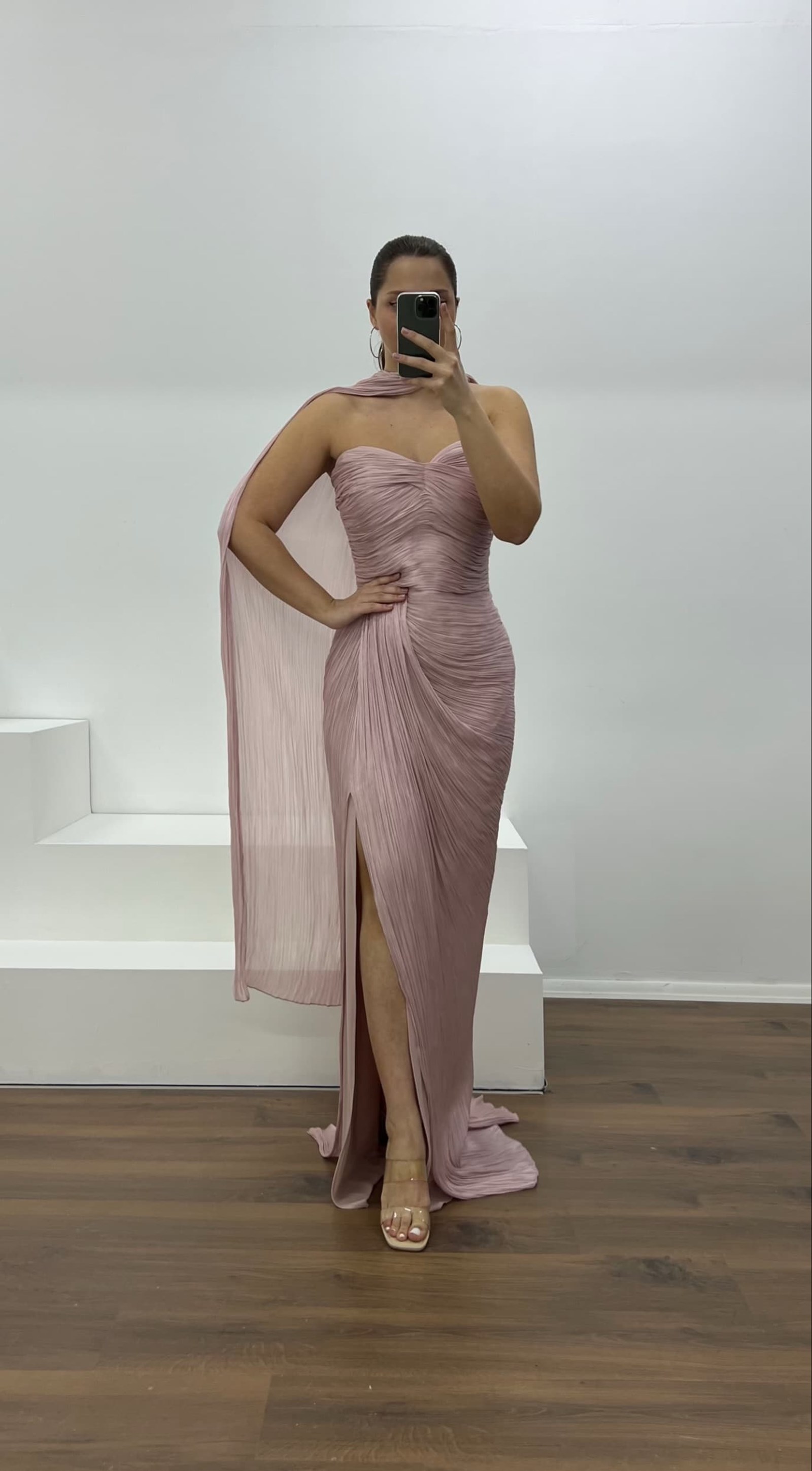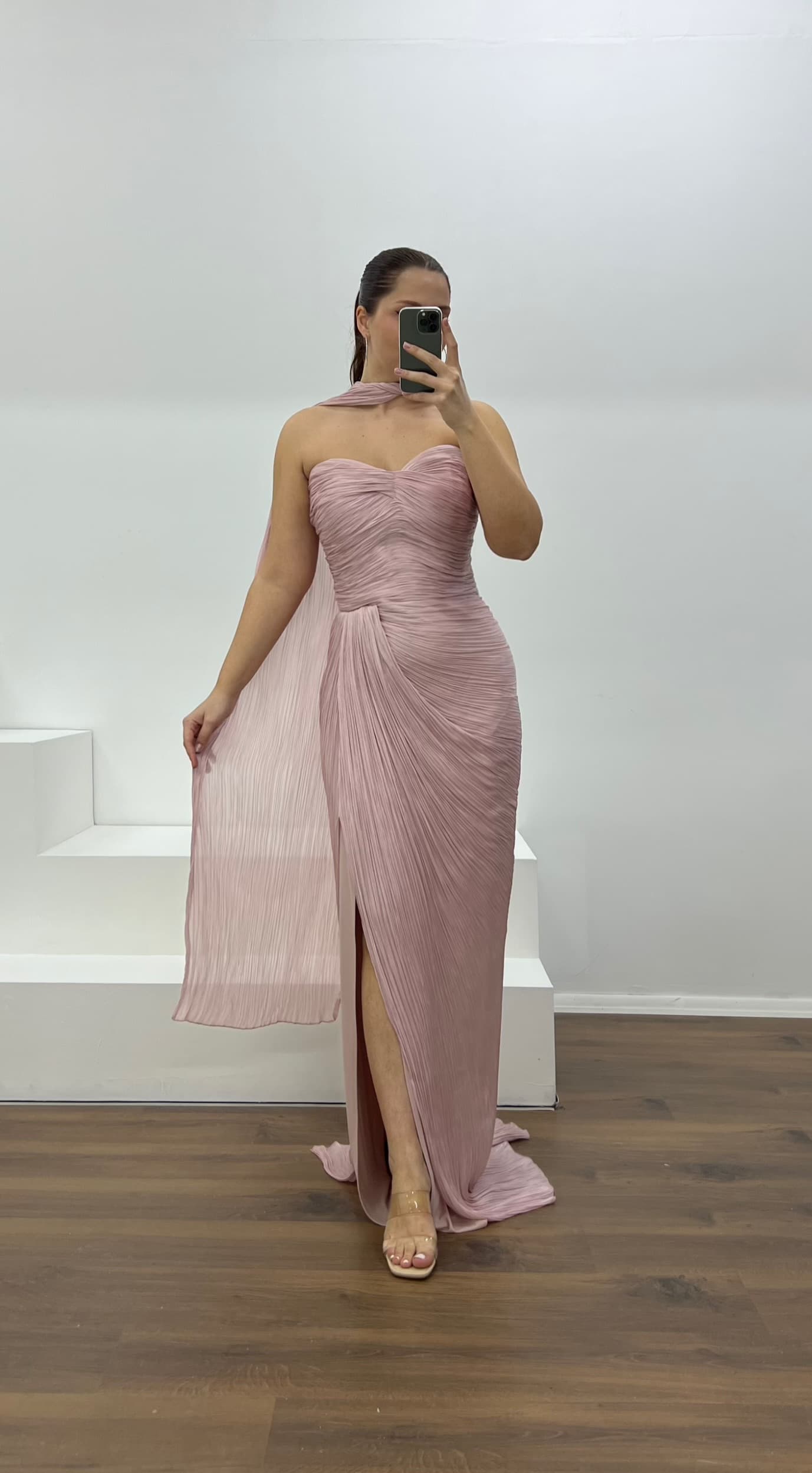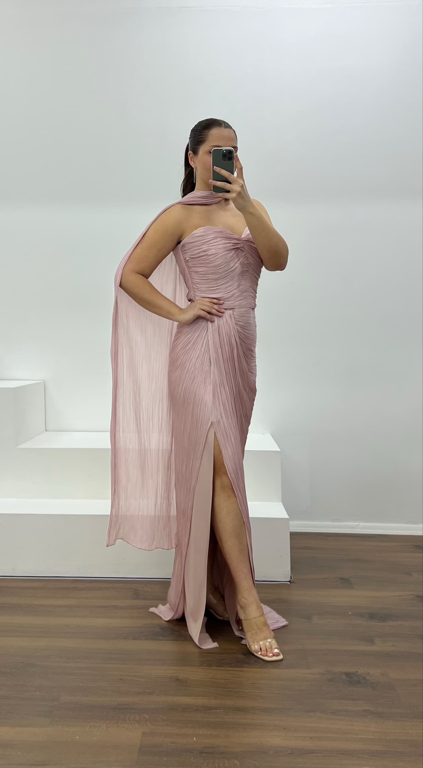 • Pudra Straplez Piliseli Büyük Beden Abiye Elbise