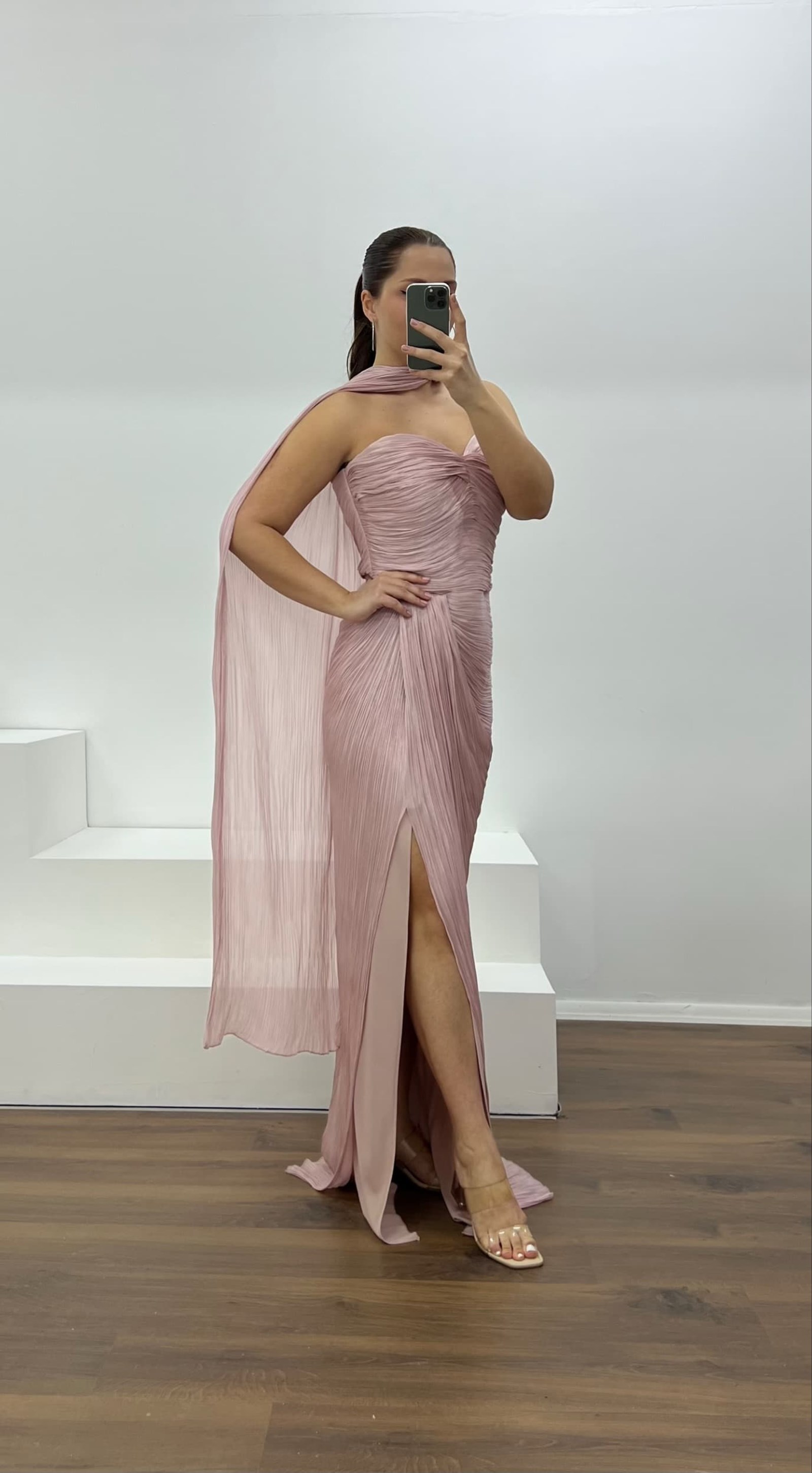 • Gül Kurusu Straplez Piliseli Büyük Beden Abiye Elbise