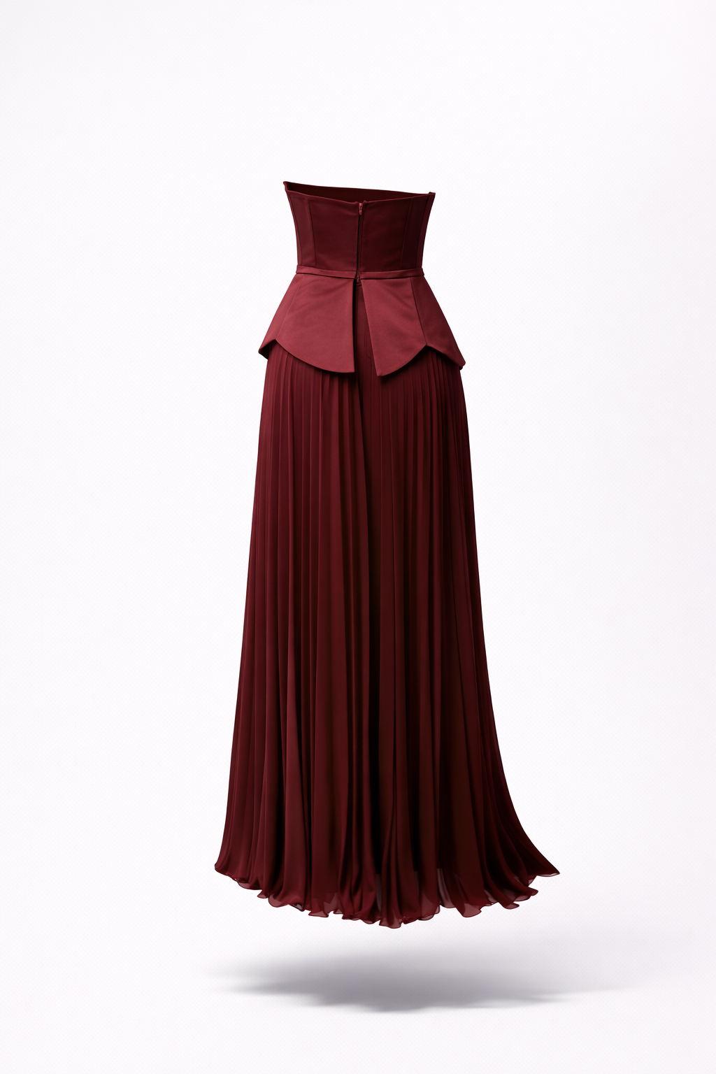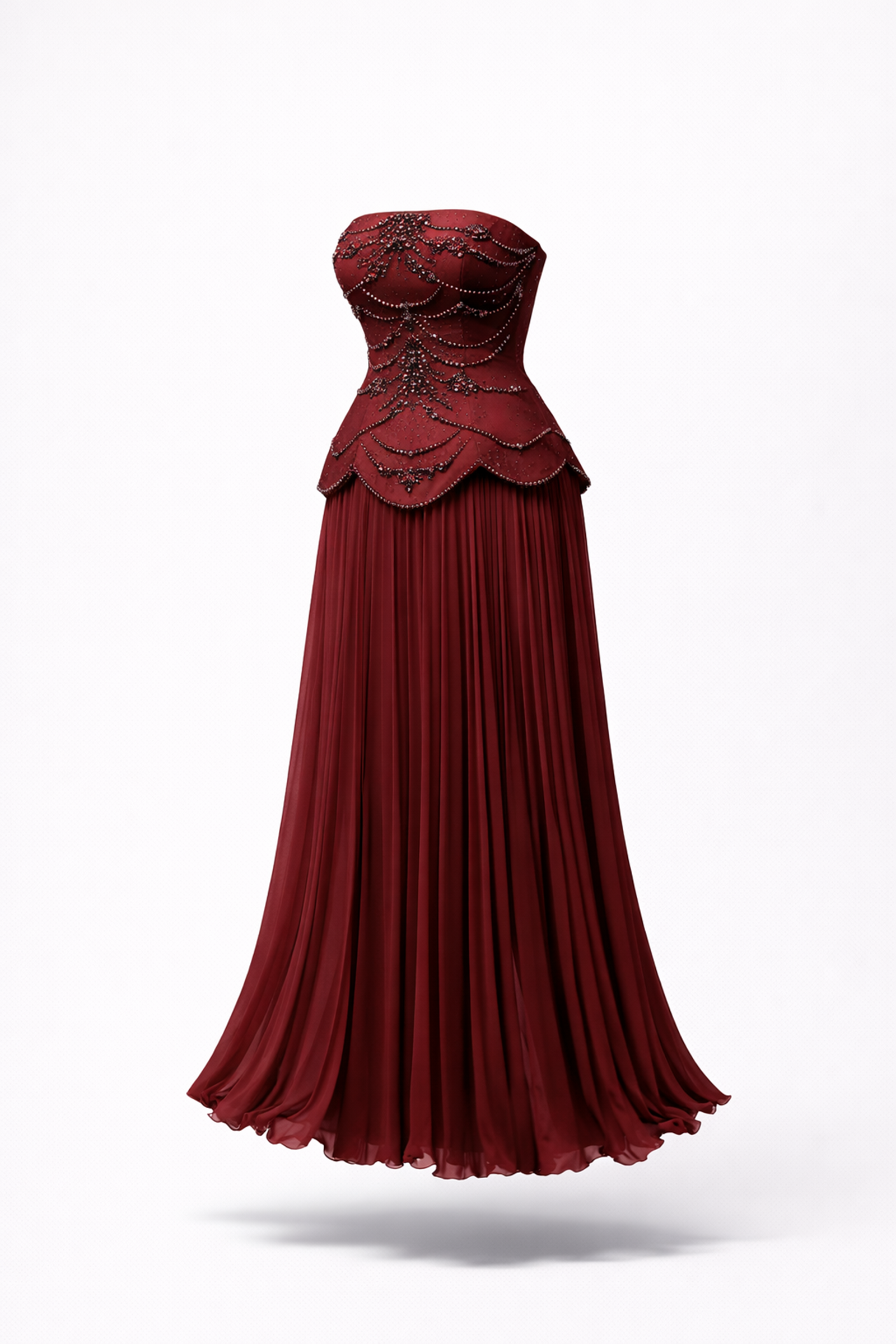 • Bordo Straplez İnci Detaylı Pliseli Abiye Elbise