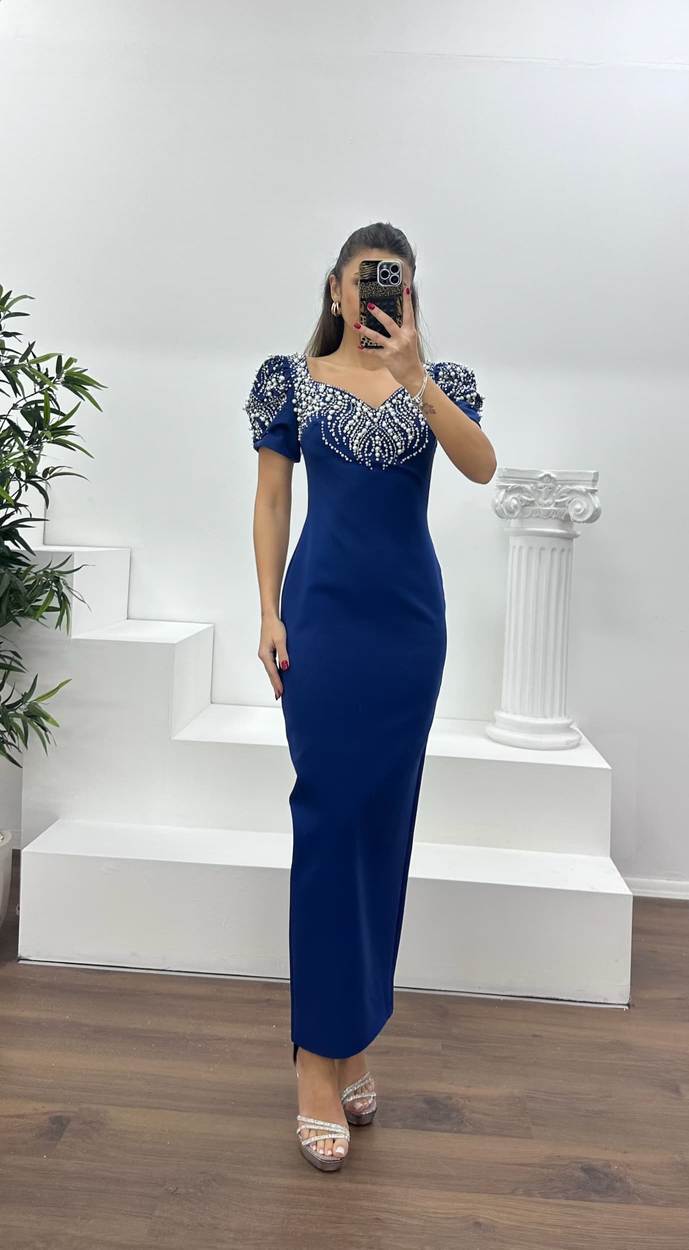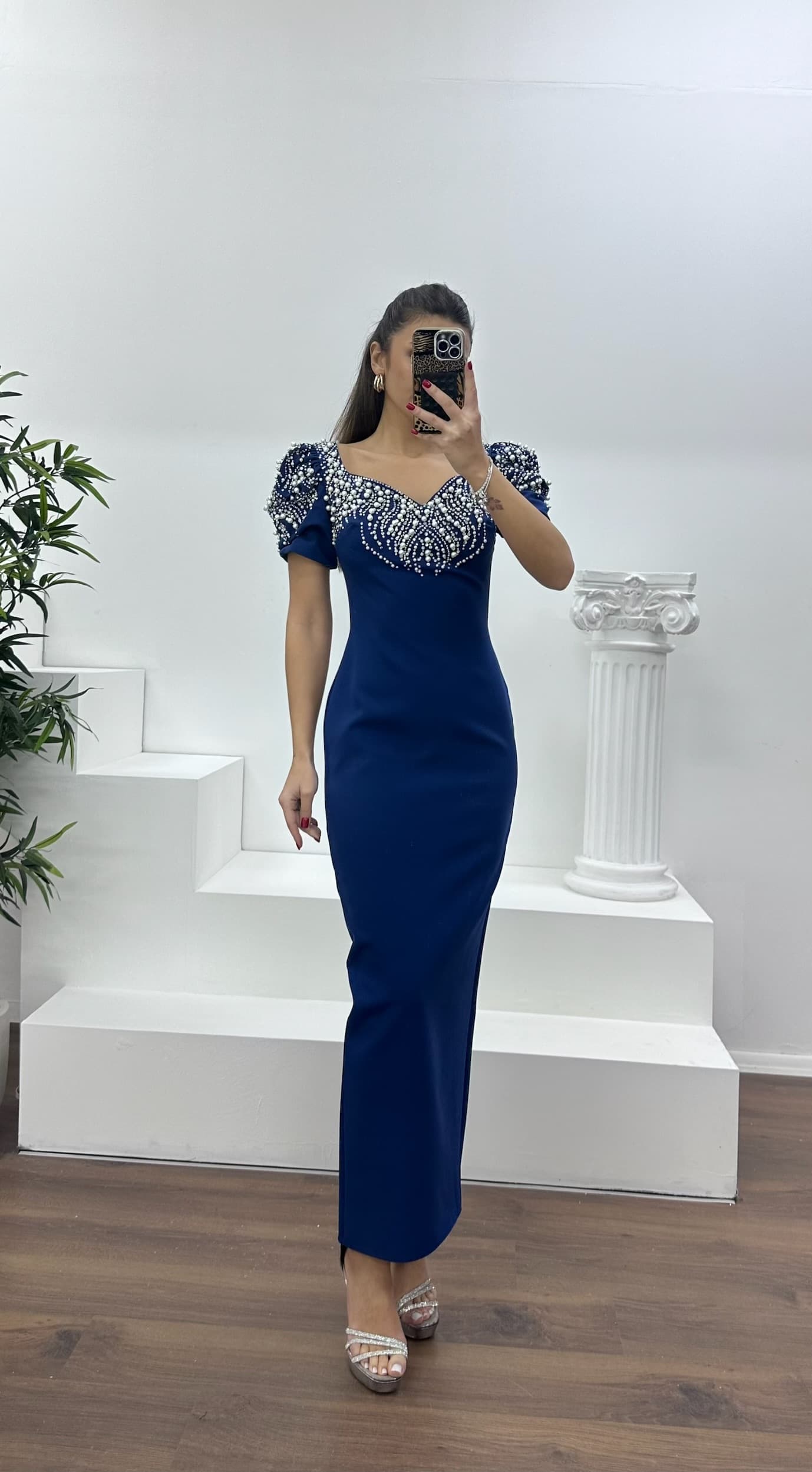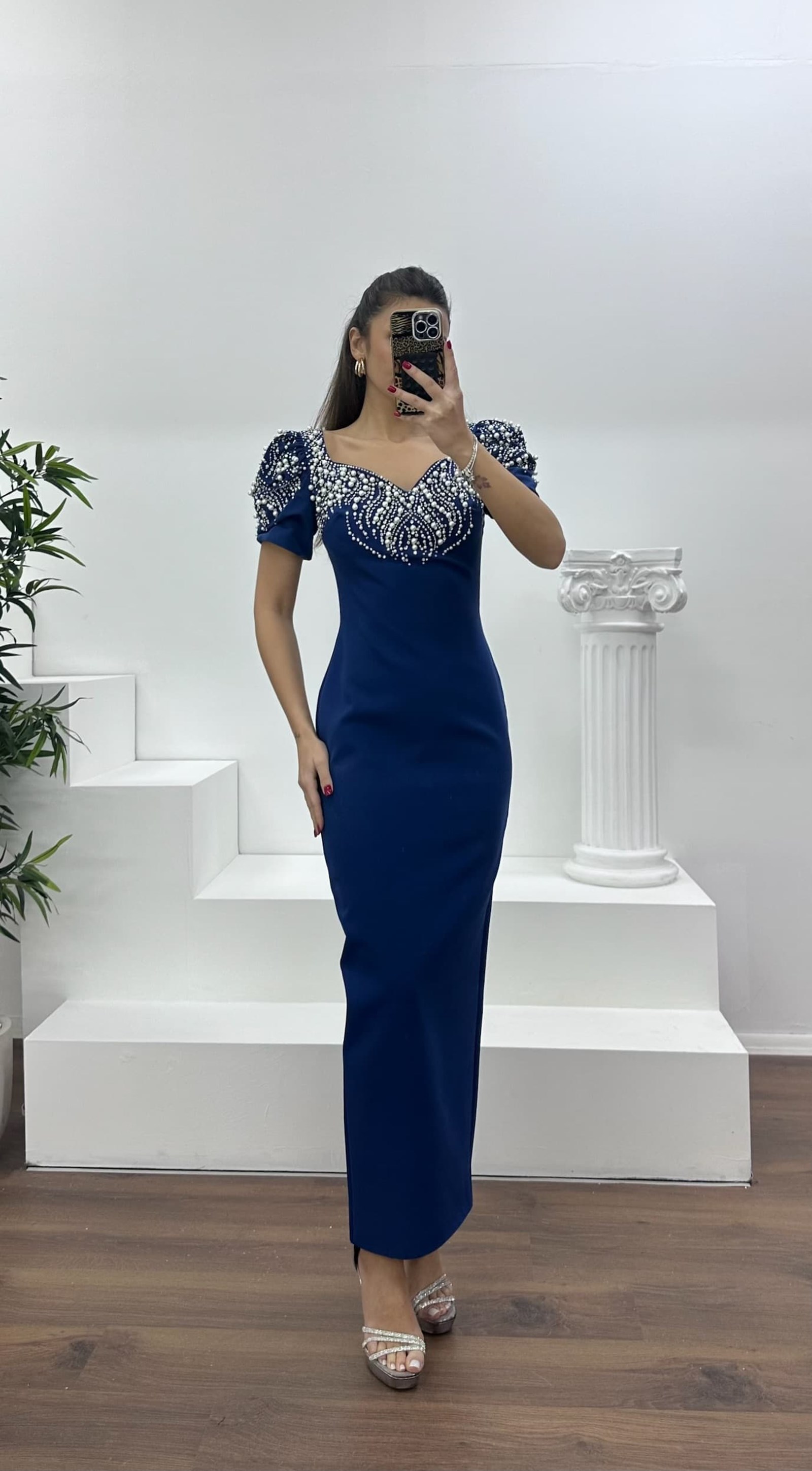 • Lacivert Balon Kol Yakası İşlemeli Abiye Elbise