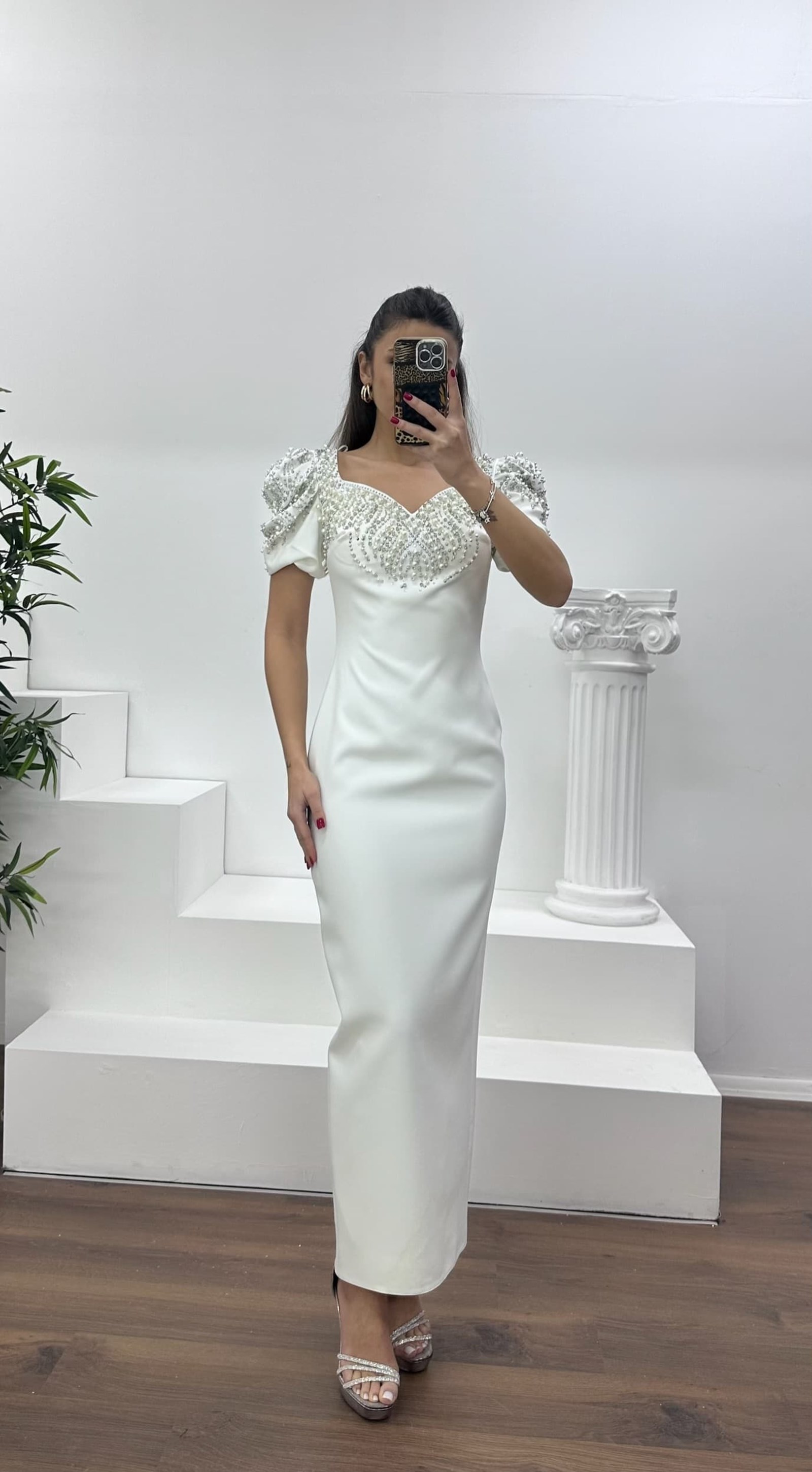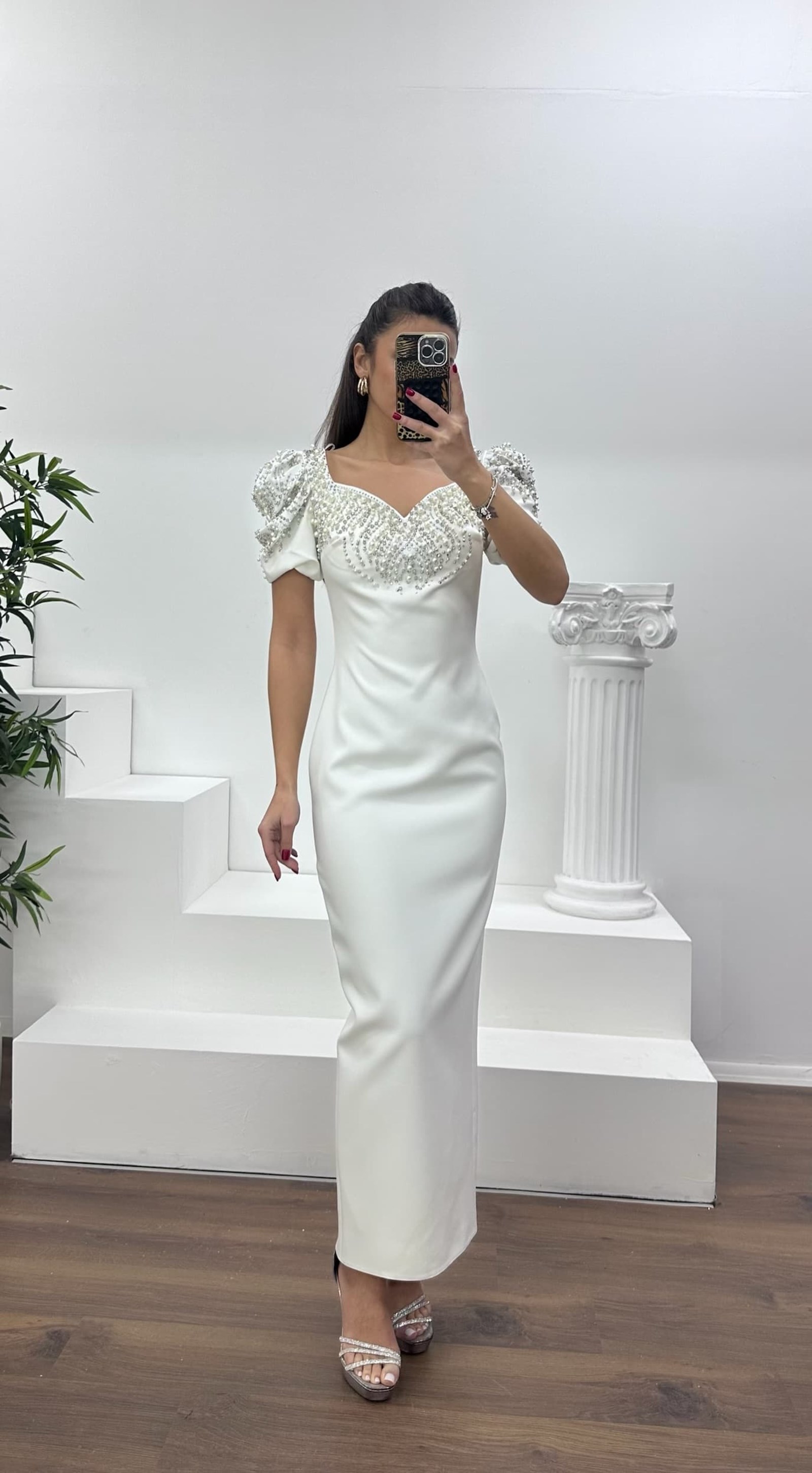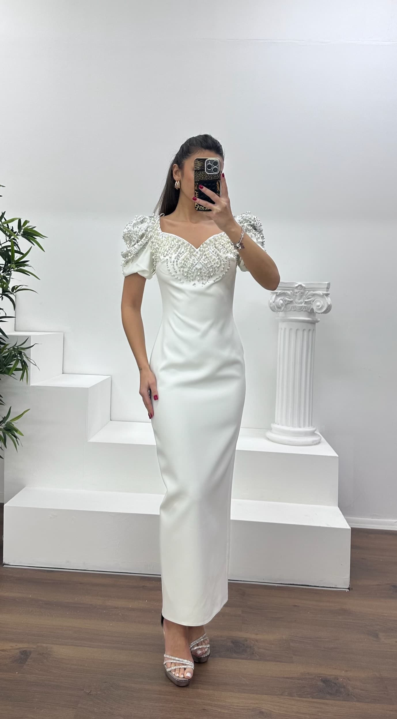 • Kemik Balon Kol Yakası İşlemeli Abiye Elbise