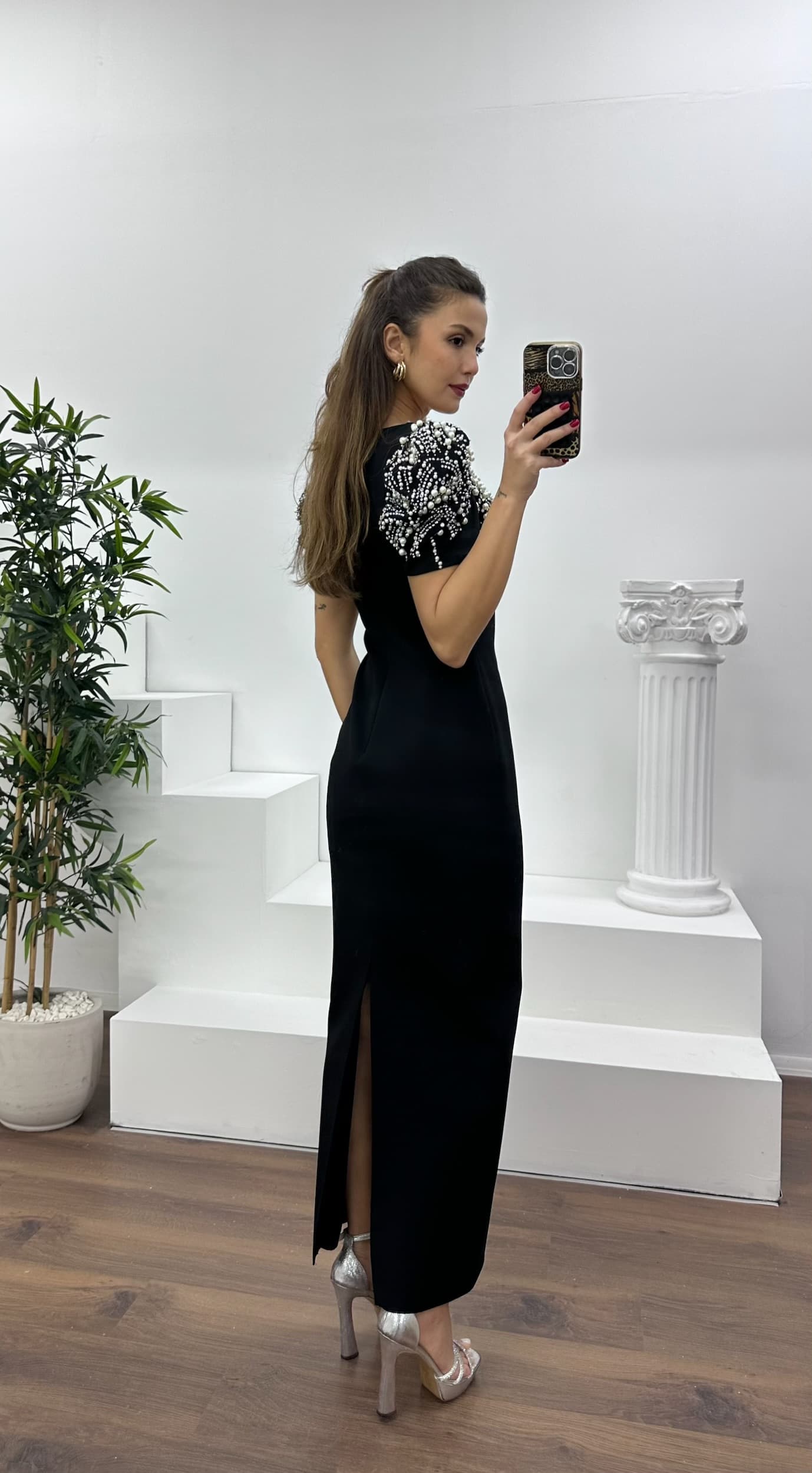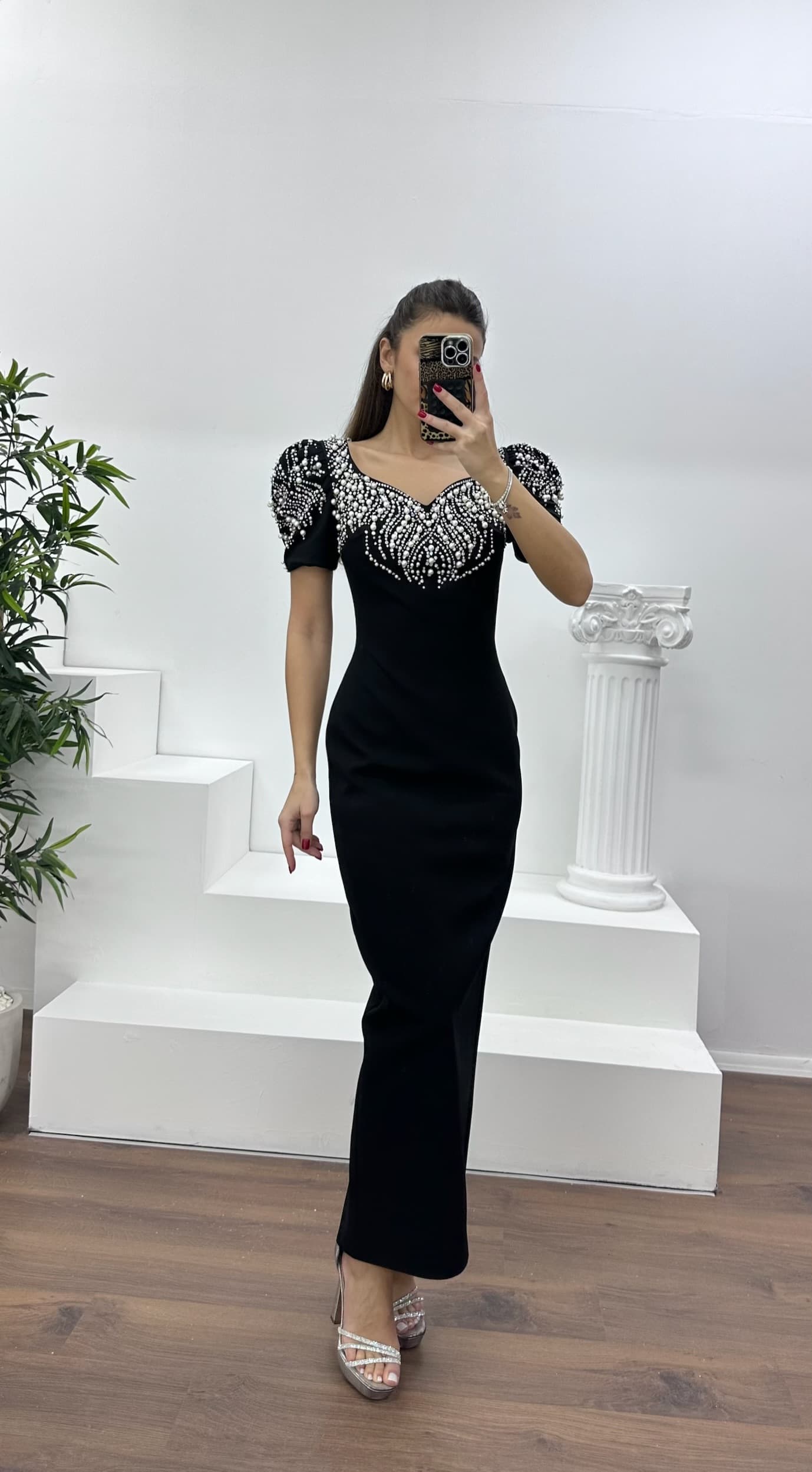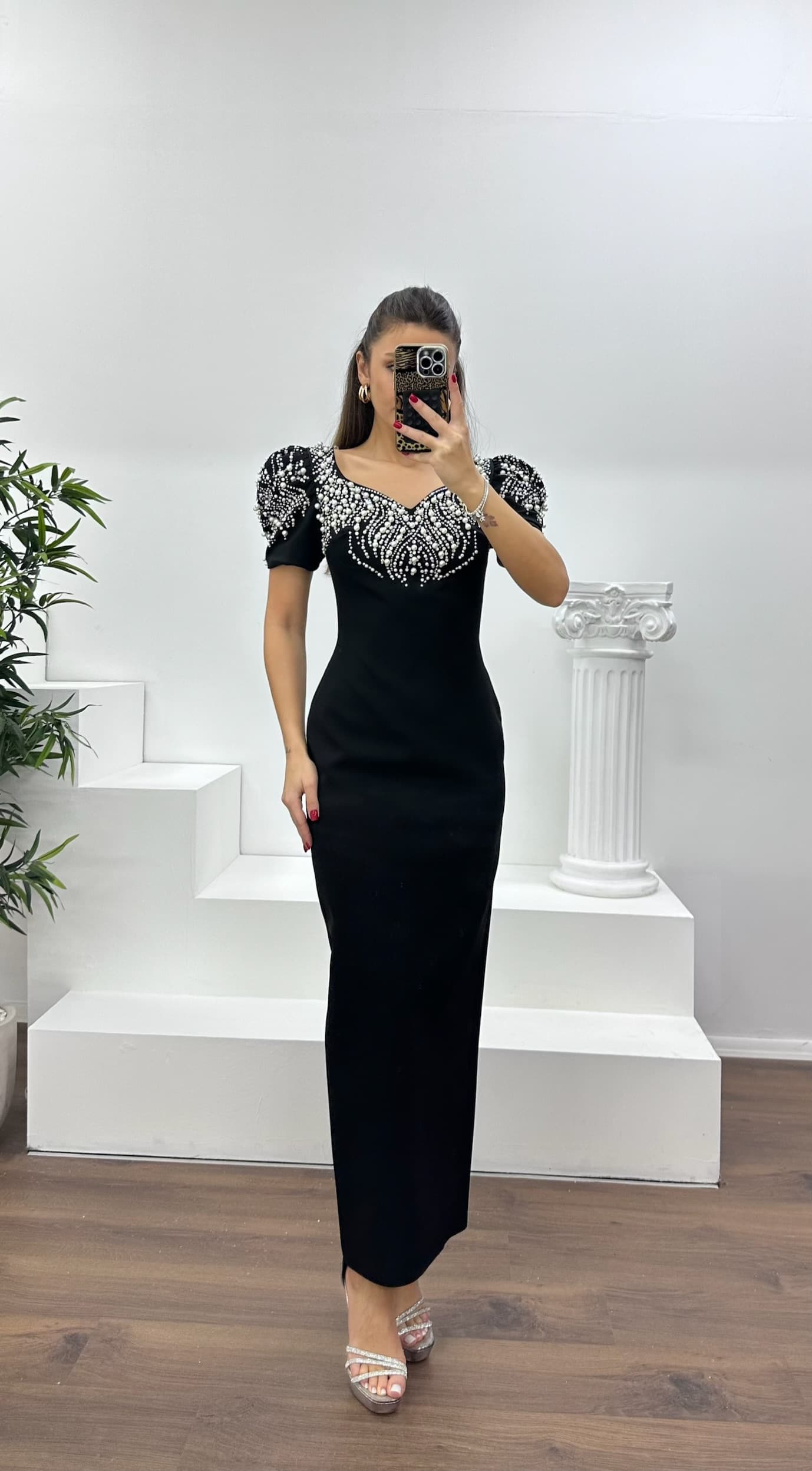 • Siyah Balon Kol Yakası İşlemeli Abiye Elbise