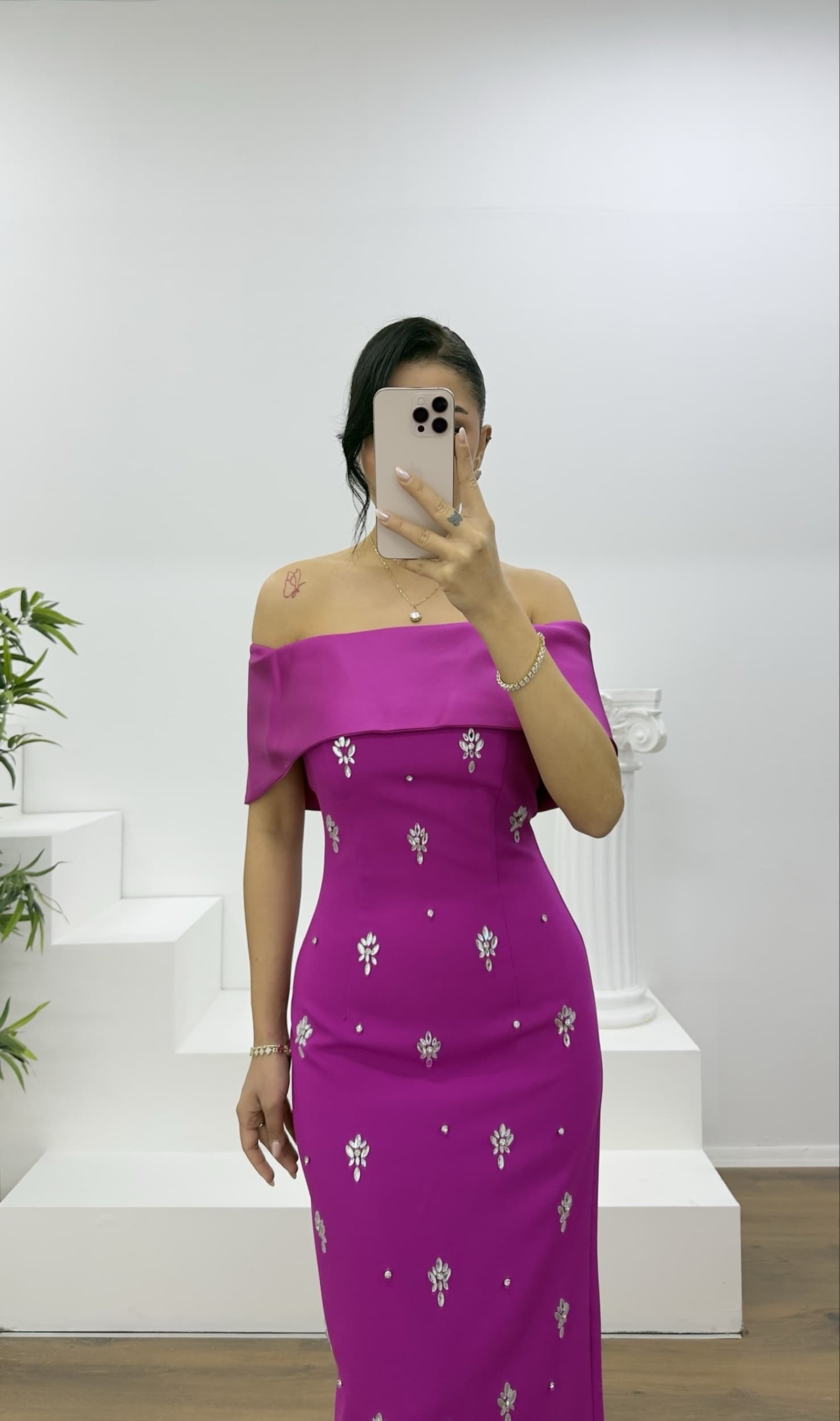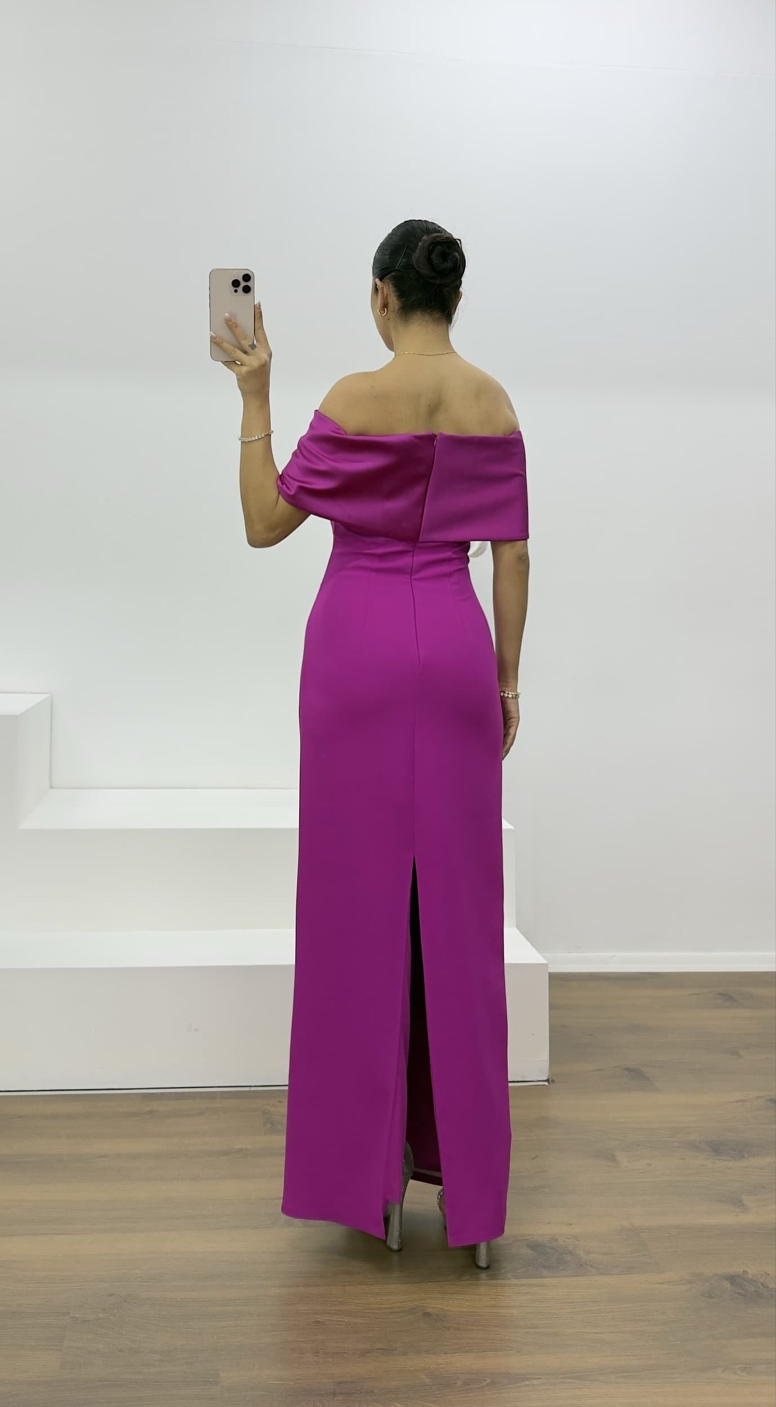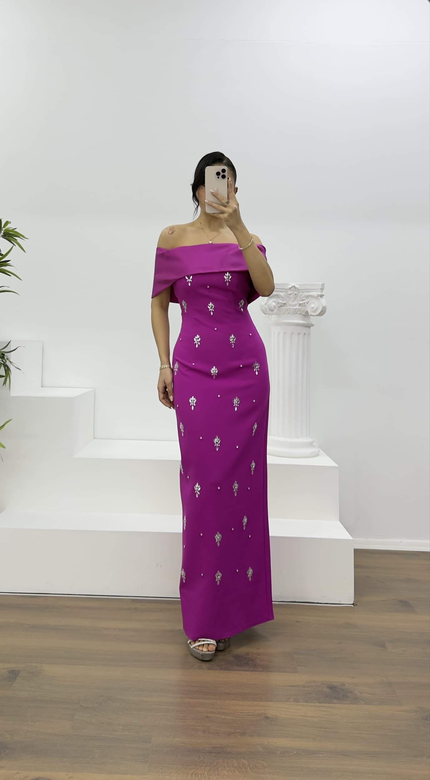 • Fuşya Kayık Yaka Taşlı Uzun Abiye Elbise
