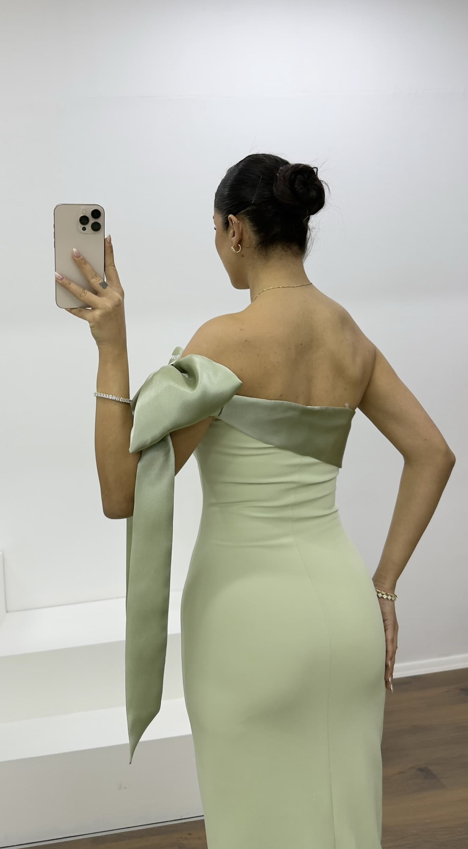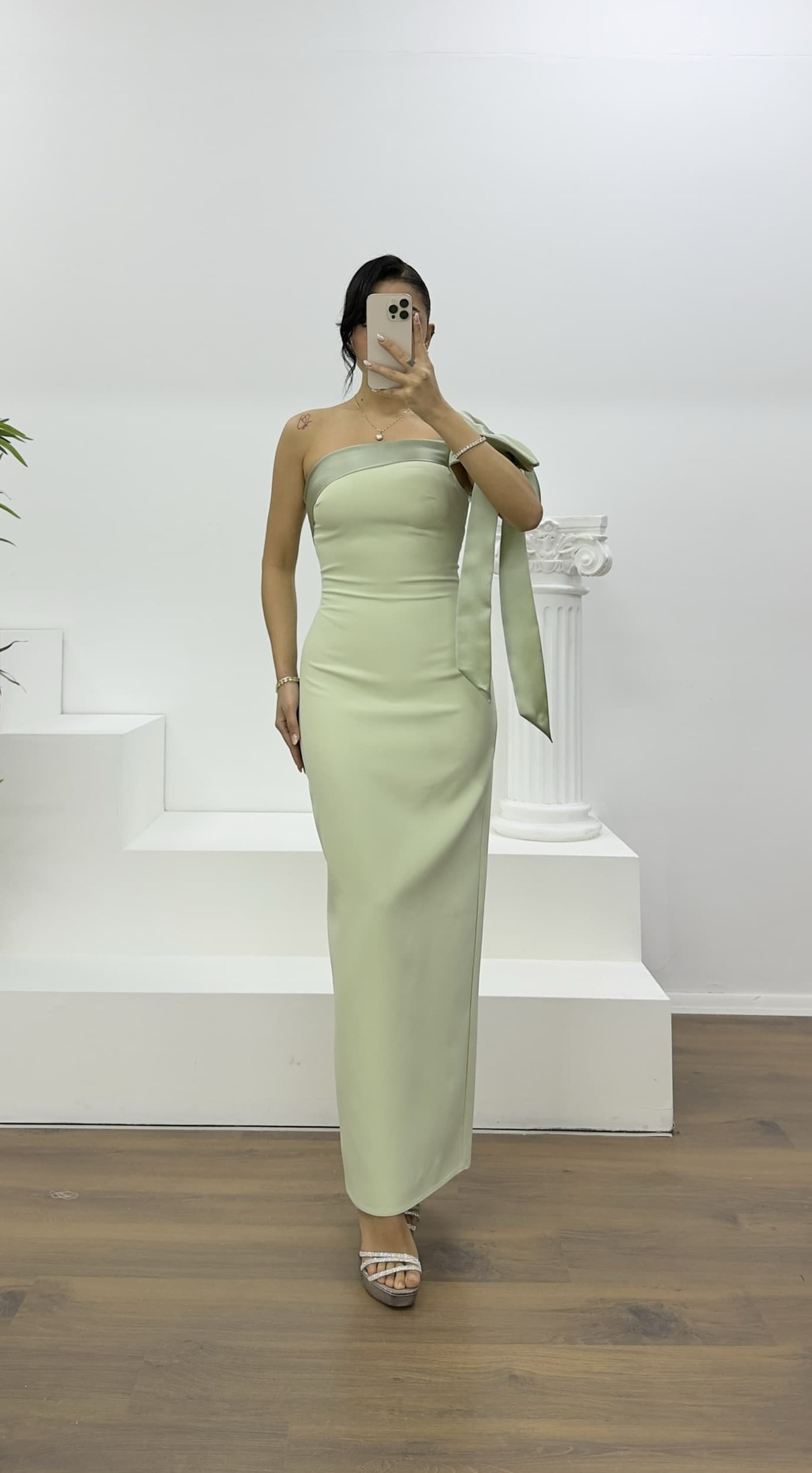• Mint Omzu Fiyonk Detaylı Kalem Abiye Elbise