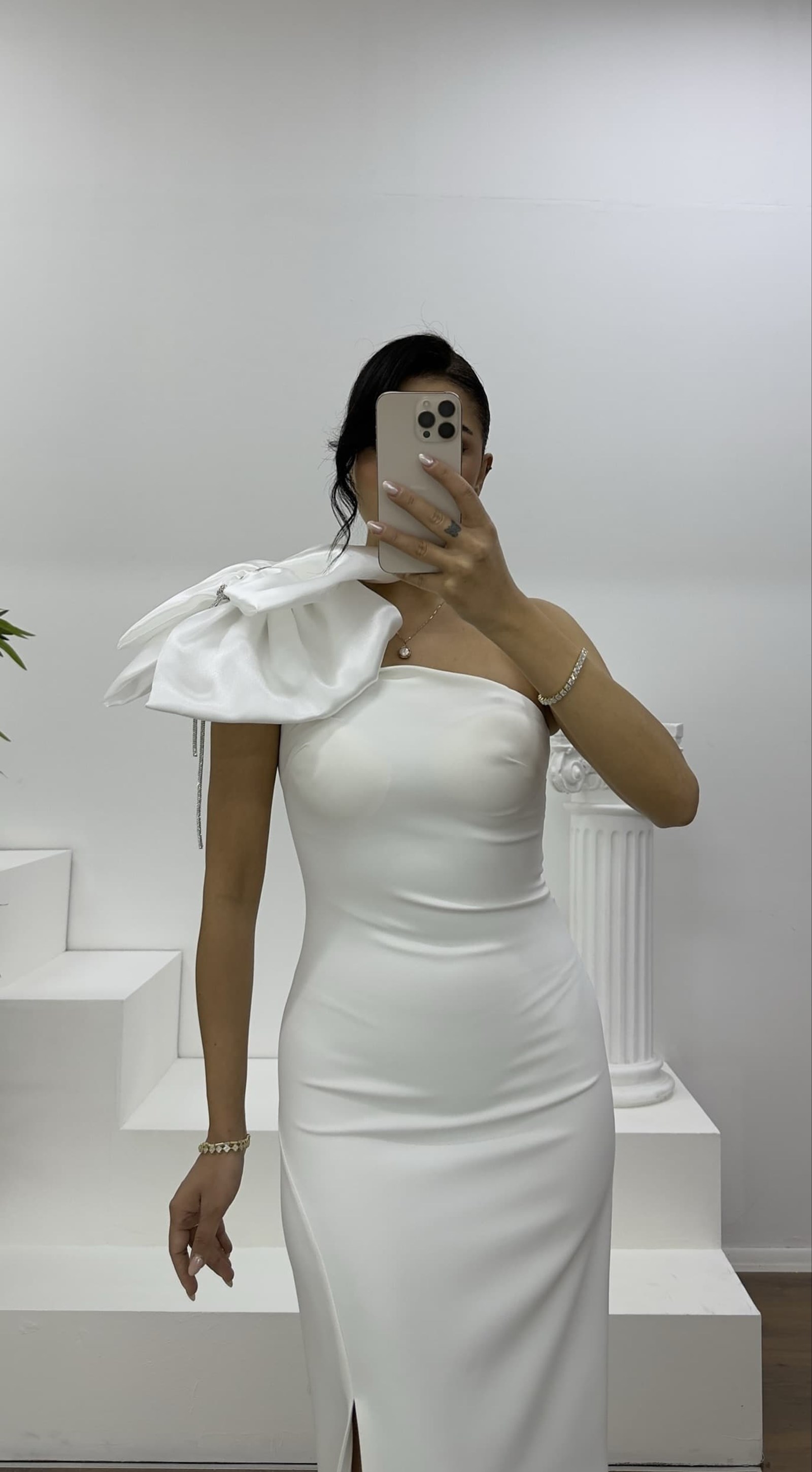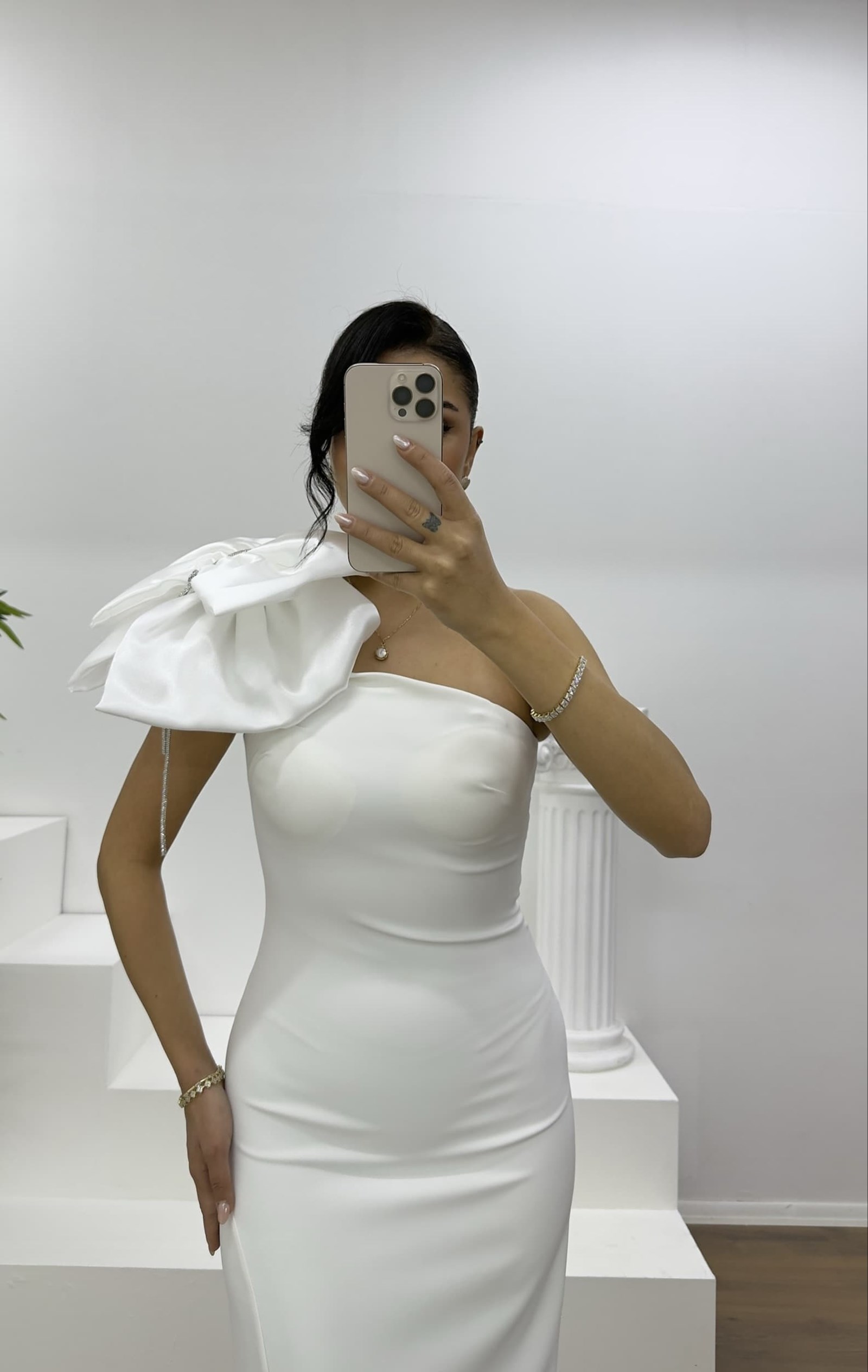 • Kemik Tek Omuz Fiyonk Detaylı Straplez Kalem Abiye Elbise