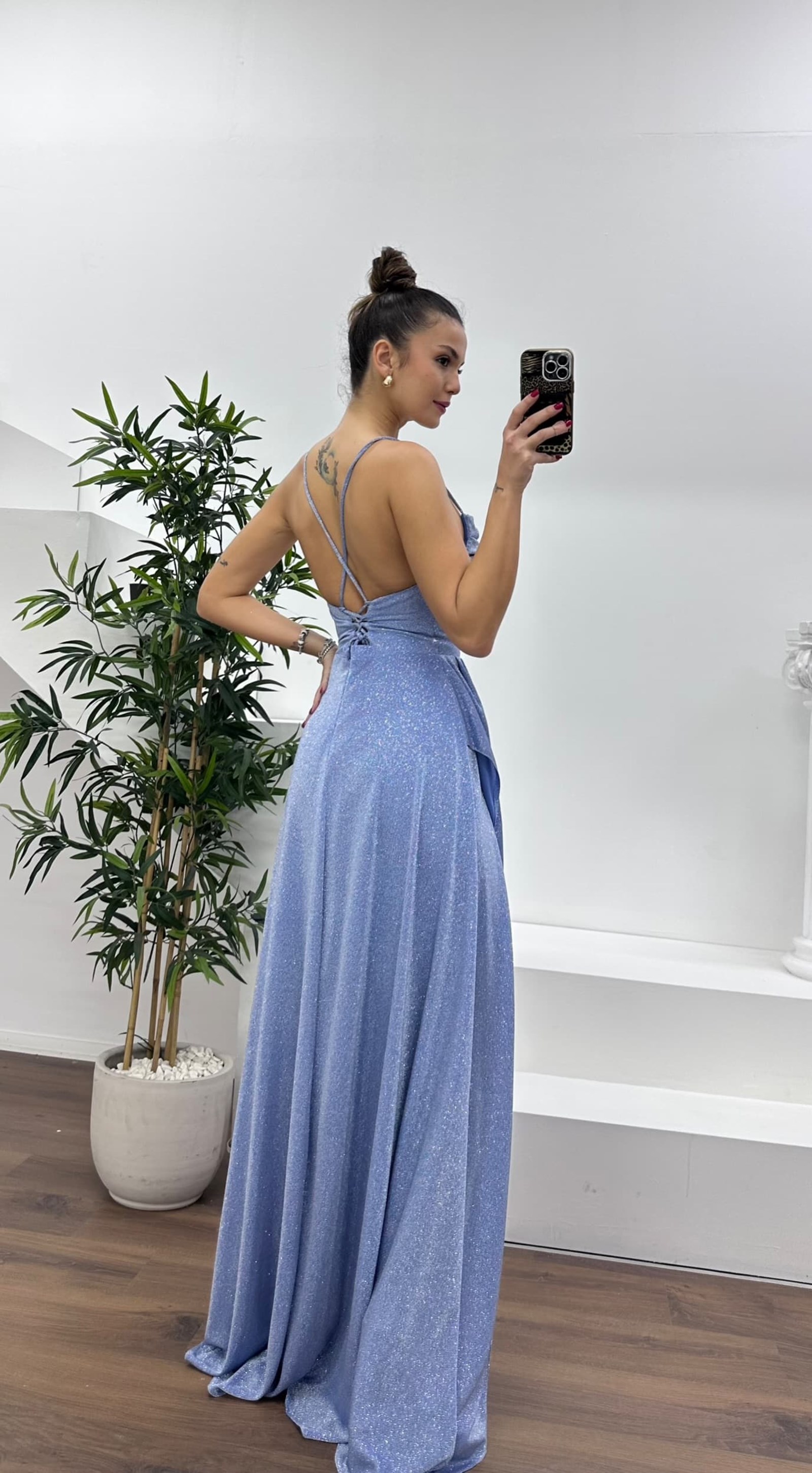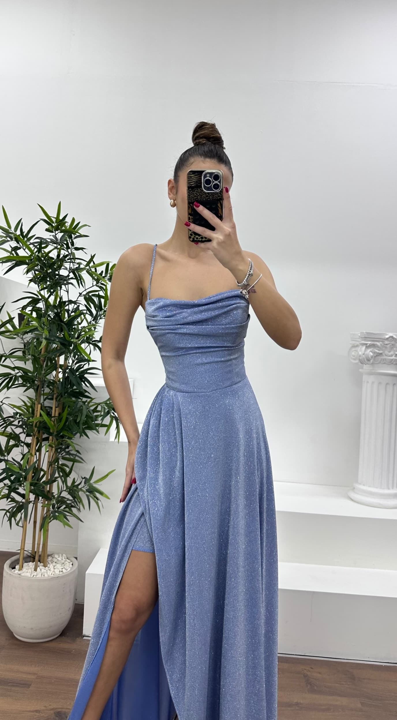 • İndigo Simli Degaje Yaka Abiye Elbise