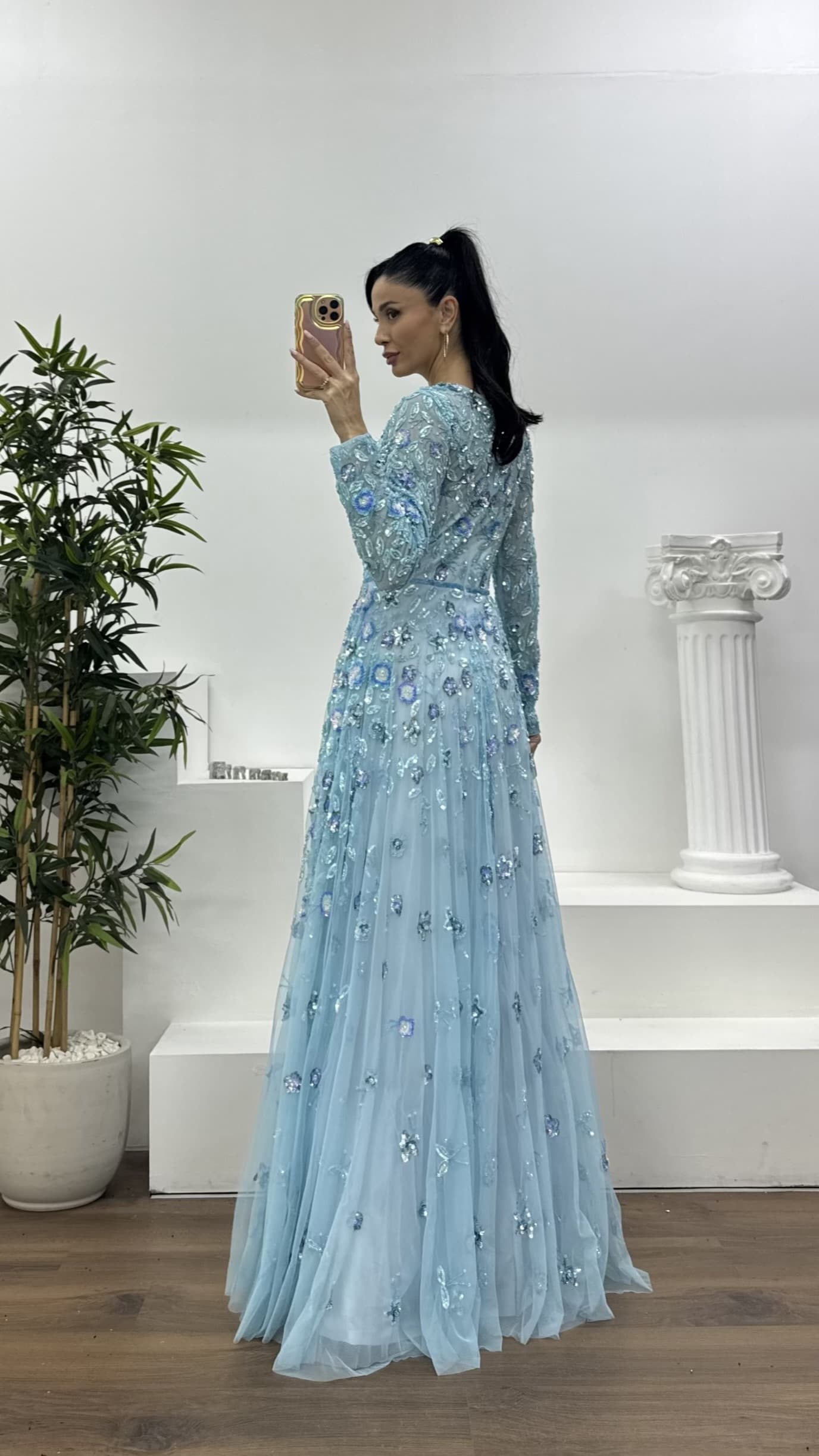 • Mavi Çiçek Desenli ve Payet İşlemeli Bisiklet Yaka Tül Abiye Elbise