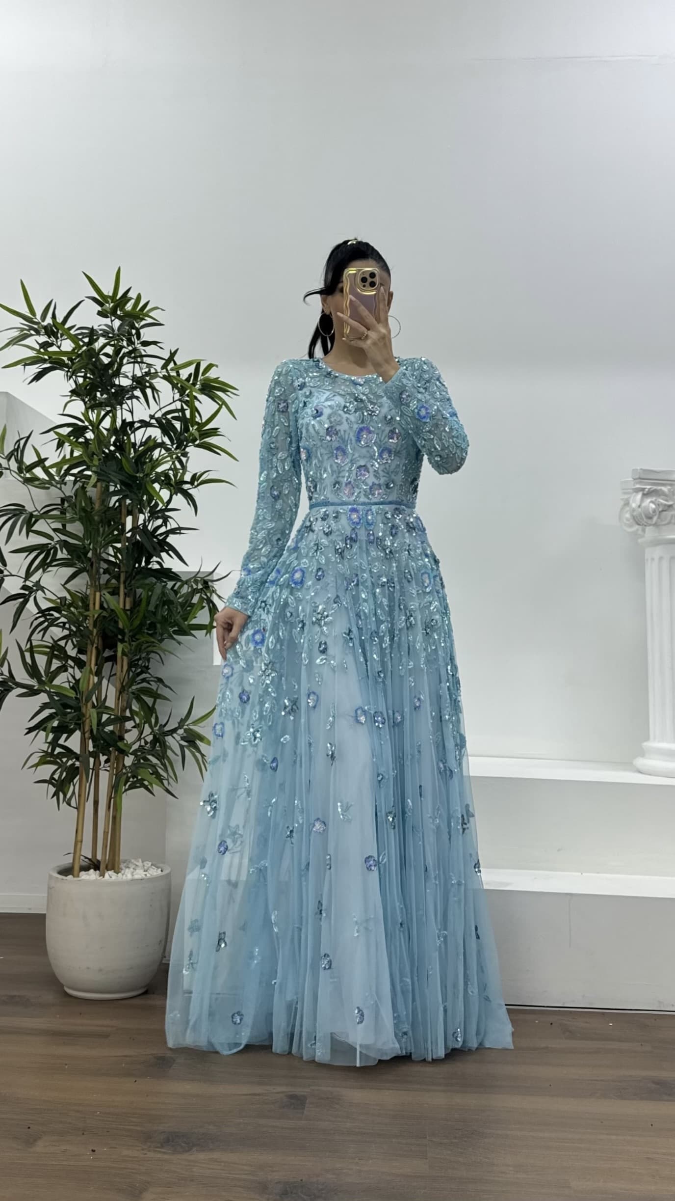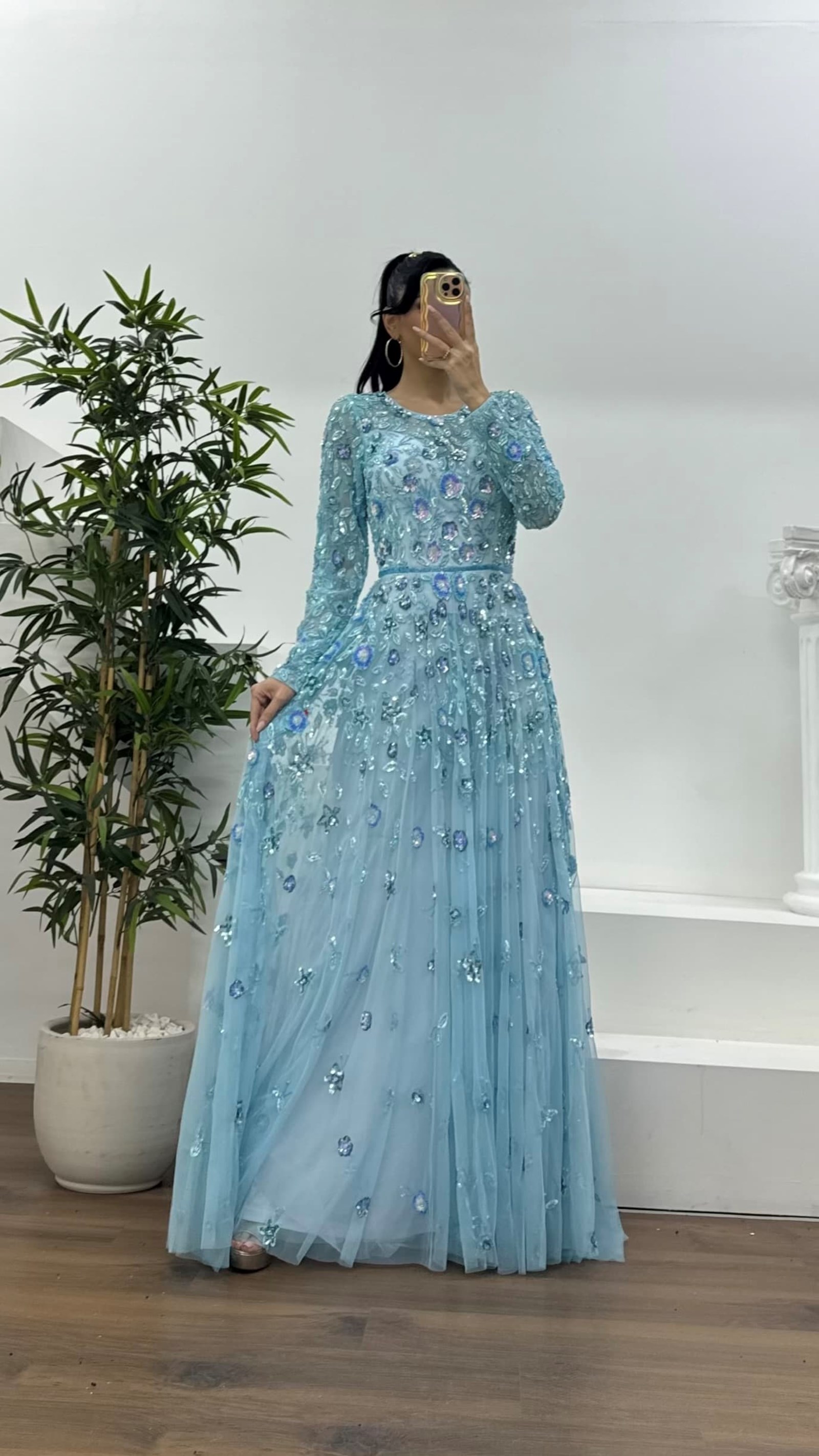 Ürün 36-46 bedene kadar uyumludur. göğüs pedli, astarlı, arka kapama fermuar, bisiklet yaka, uzun kollu, payet işlemeli abiye olarak tasarlanmıştır.