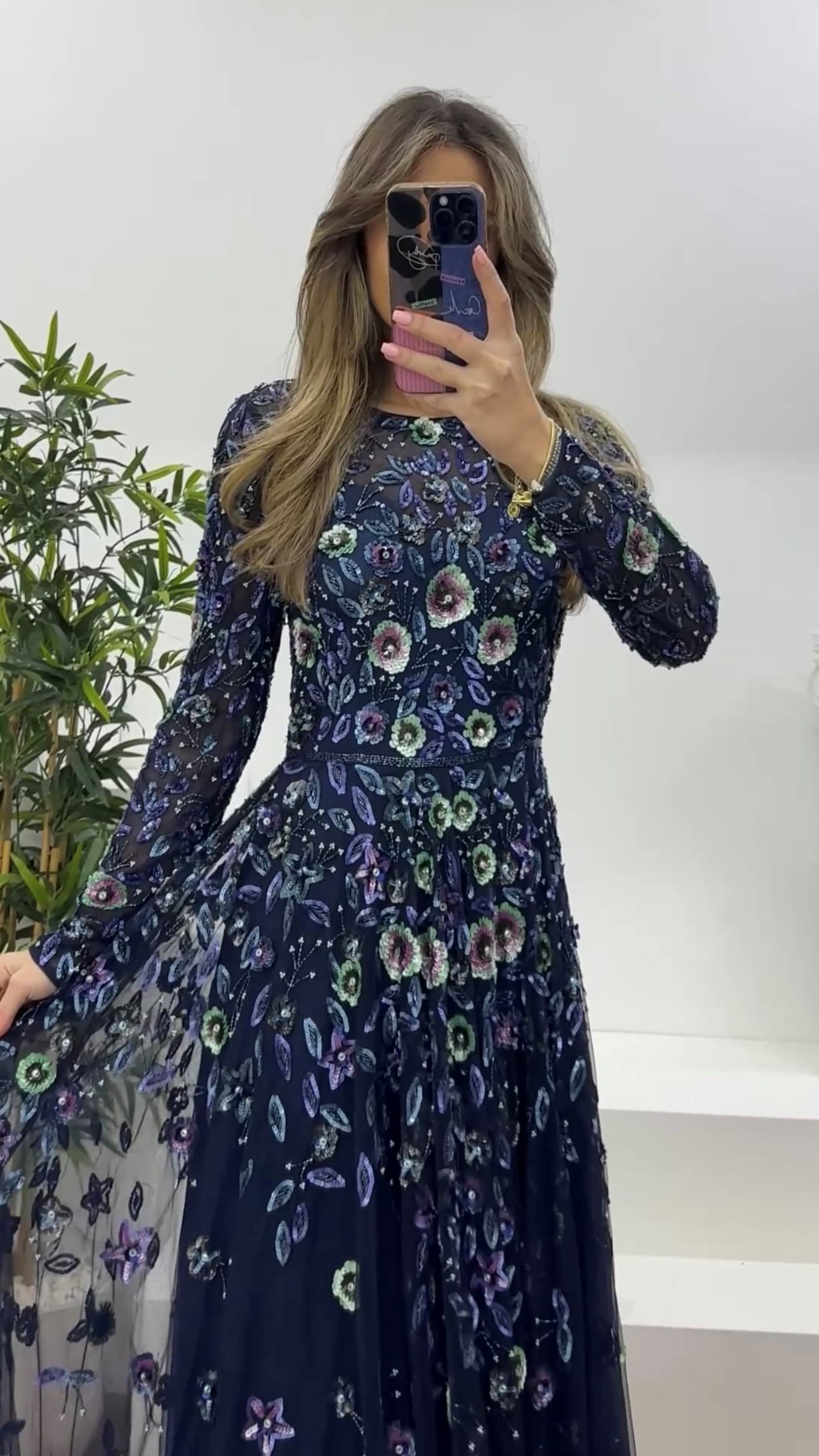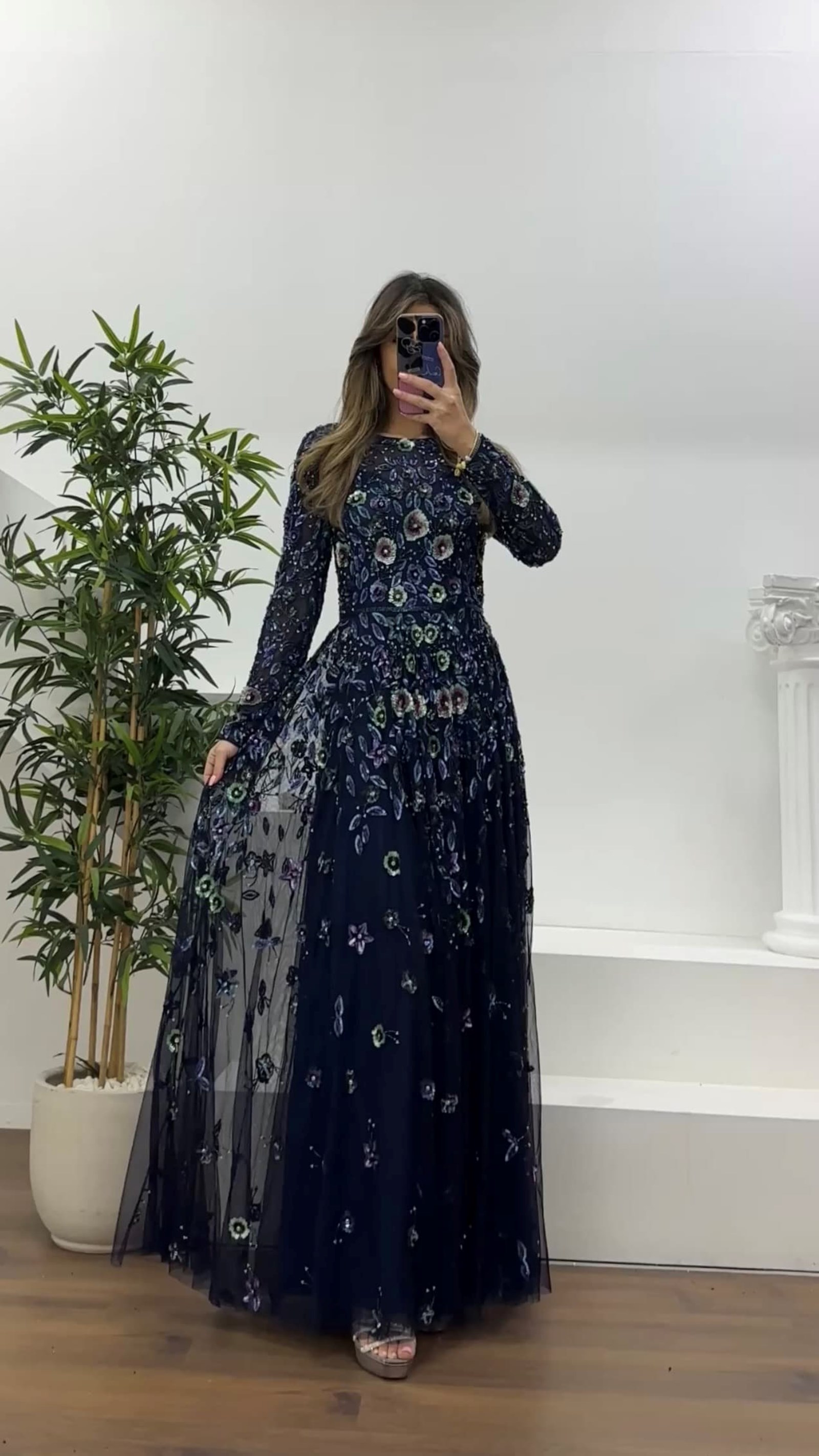 • Lacivert Çiçek Desenli ve Payet İşlemeli Bisiklet Yaka Tül Abiye Elbise