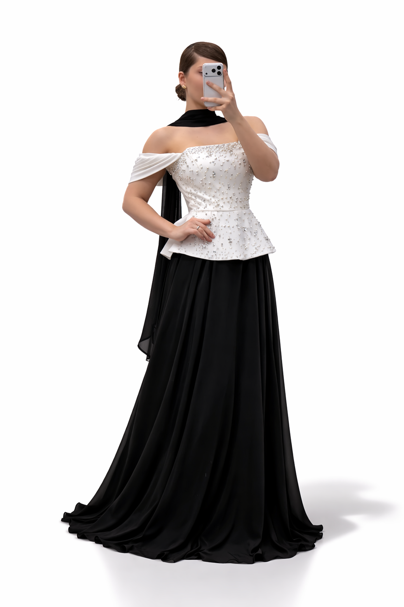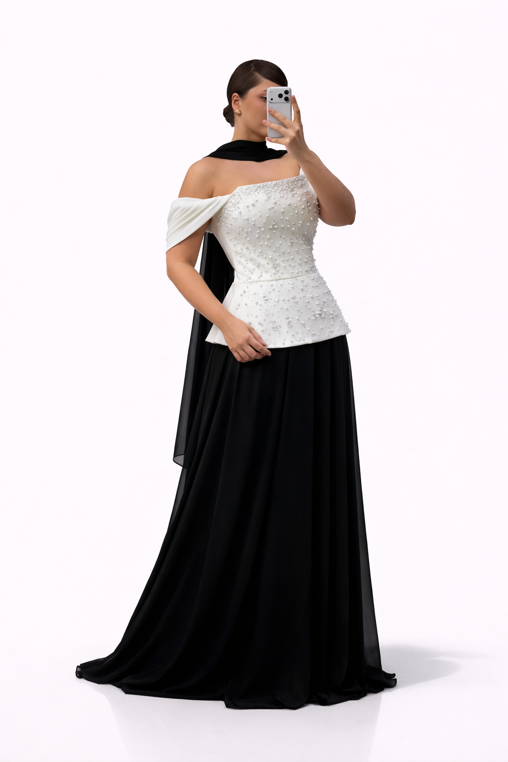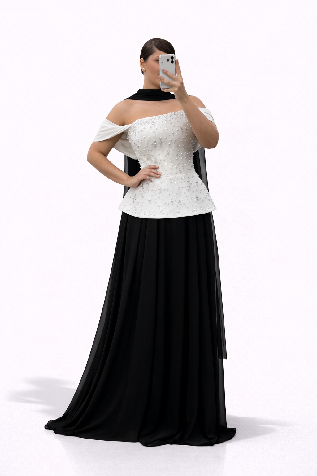 • Siyah Kemik İnci İşlemeli Peplum Üstlü Uzun Şifon Büyük Beden Abiye Elbise