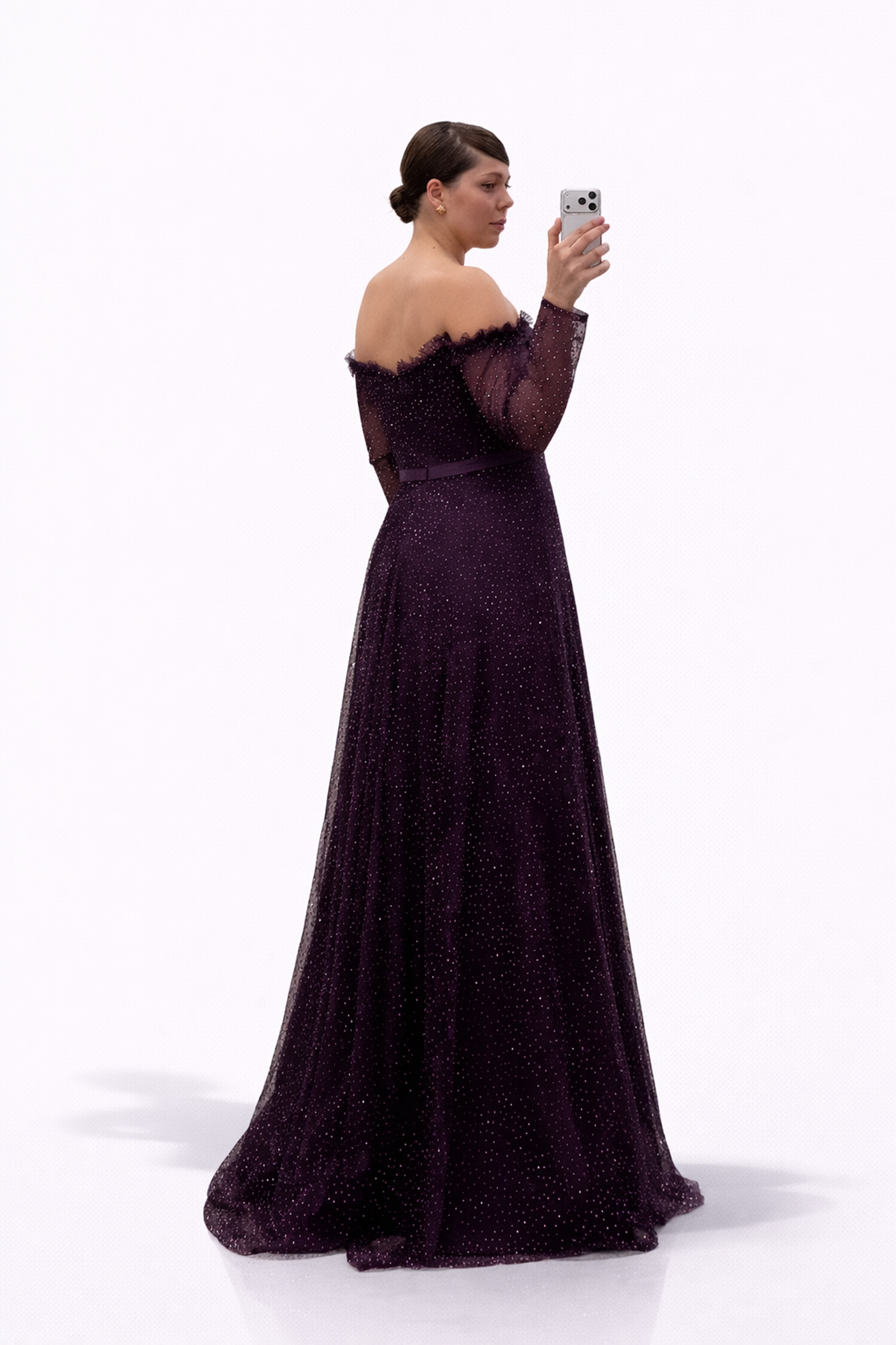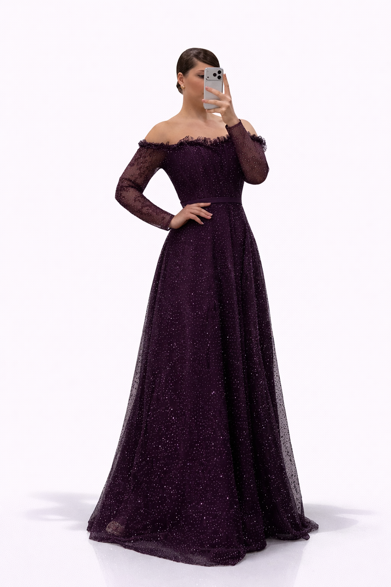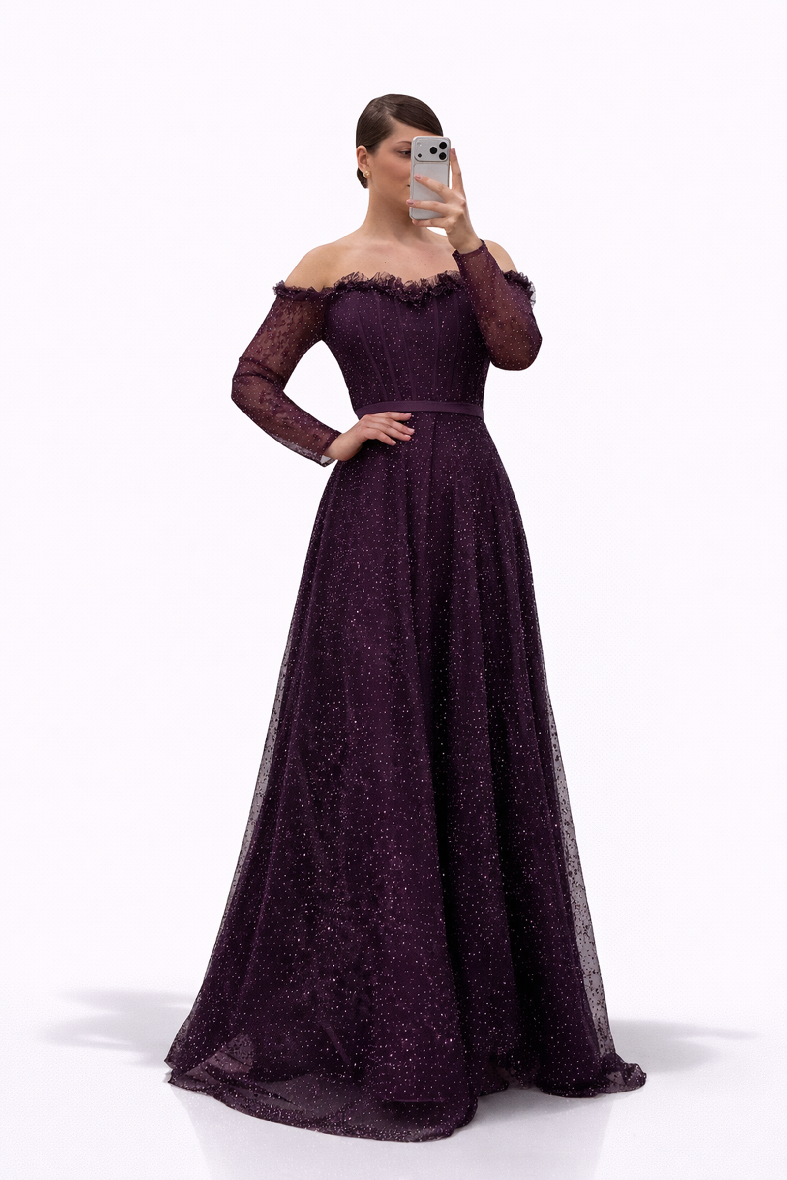 • Mürdüm Işıltılı Puantiye Detaylı Kalp Yaka Görünümlü Büyük Beden Abiye Elbise