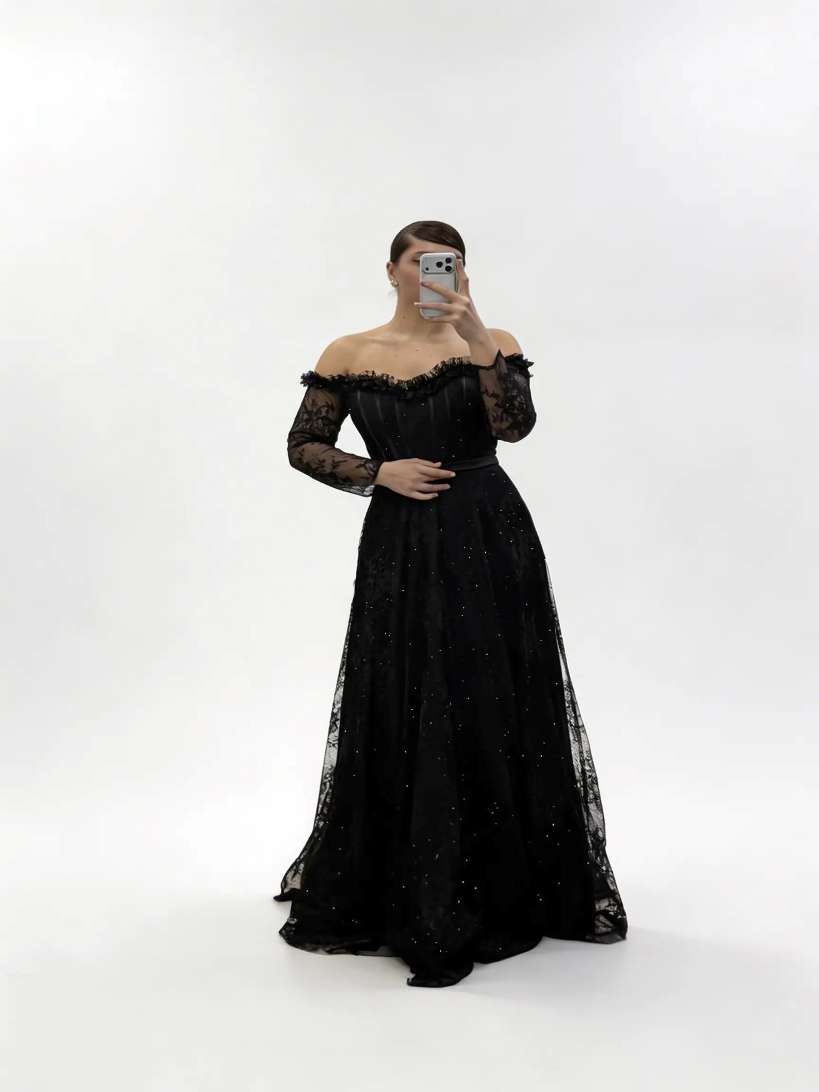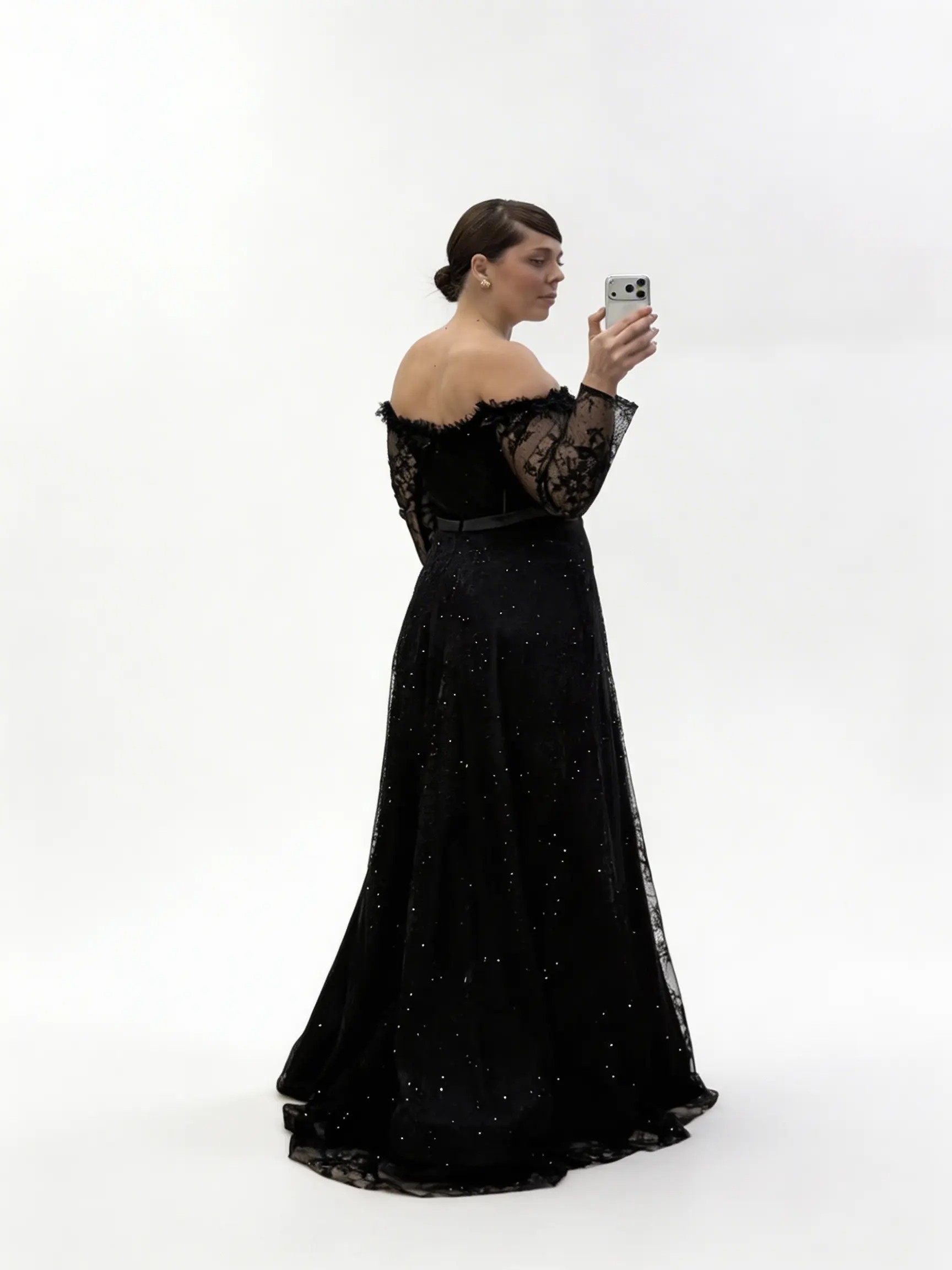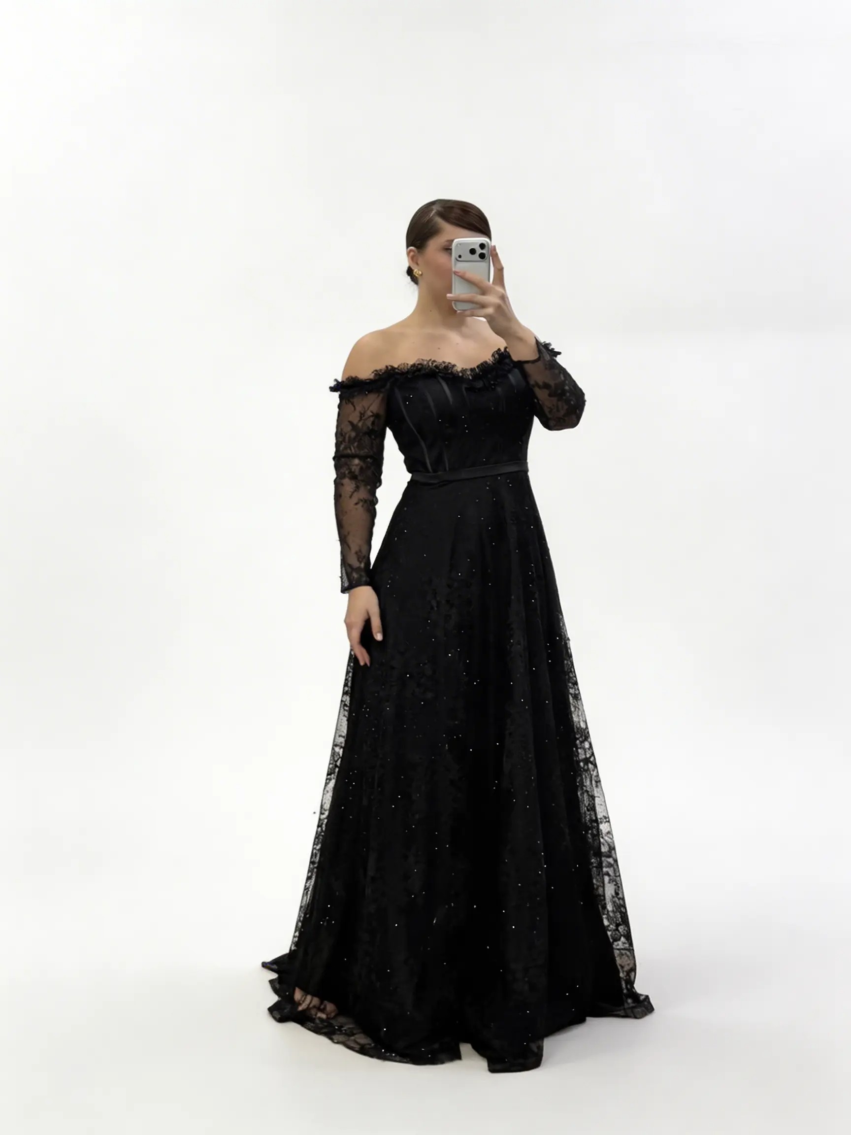 • Siyah Işıltılı Puantiye Detaylı Kalp Yaka Görünümlü Büyük Beden Abiye Elbise