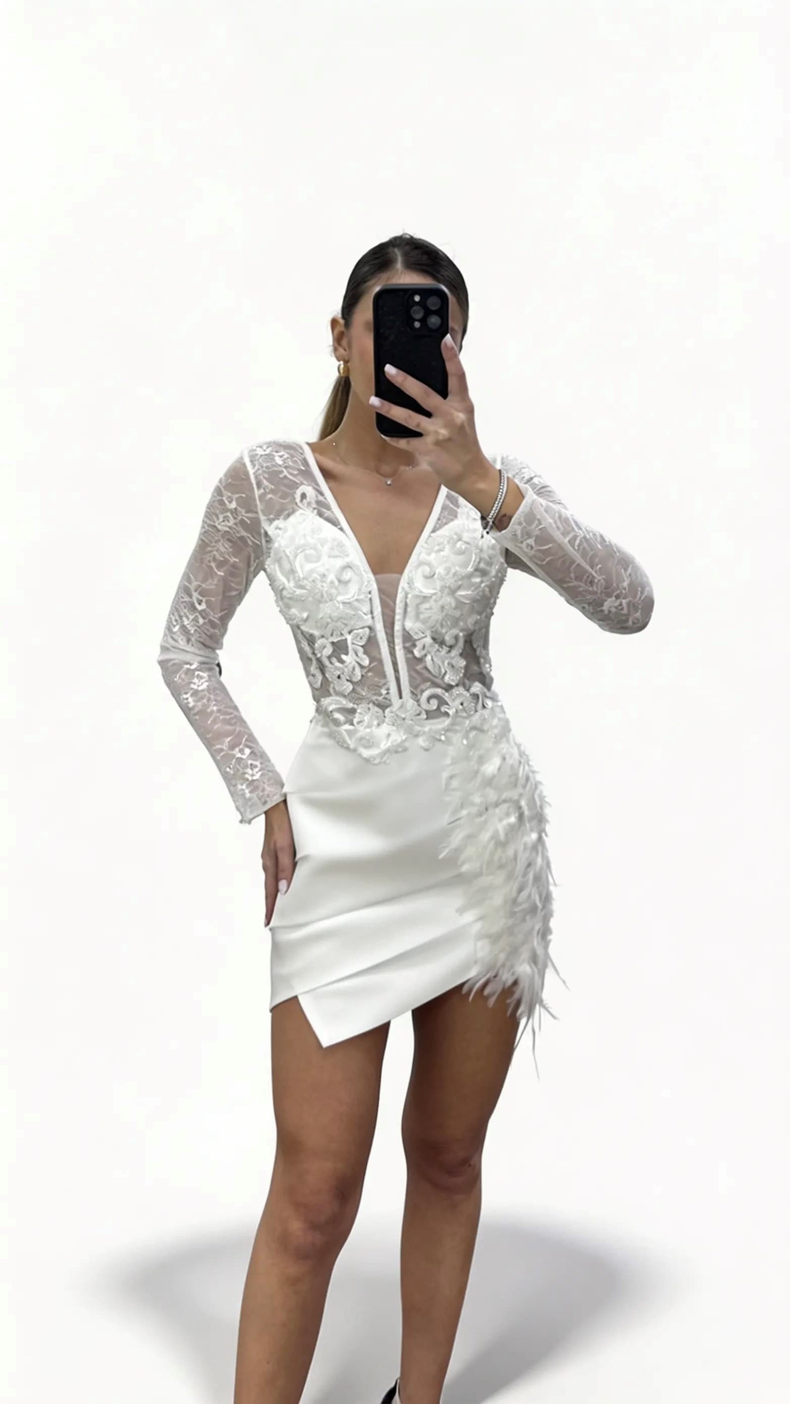 • Kemik Dantel Ve Tüy Detaylı Mini Abiye Elbise