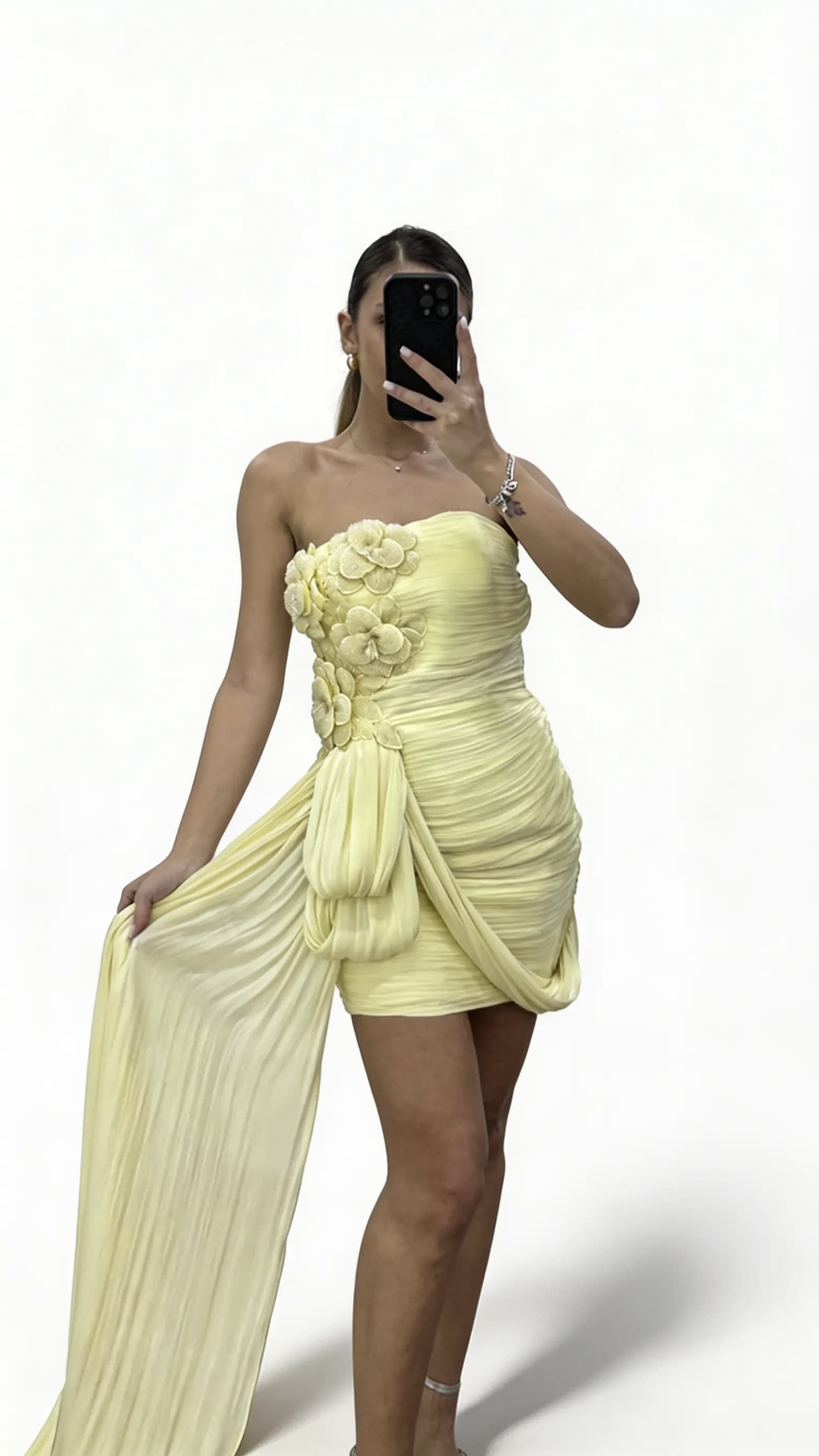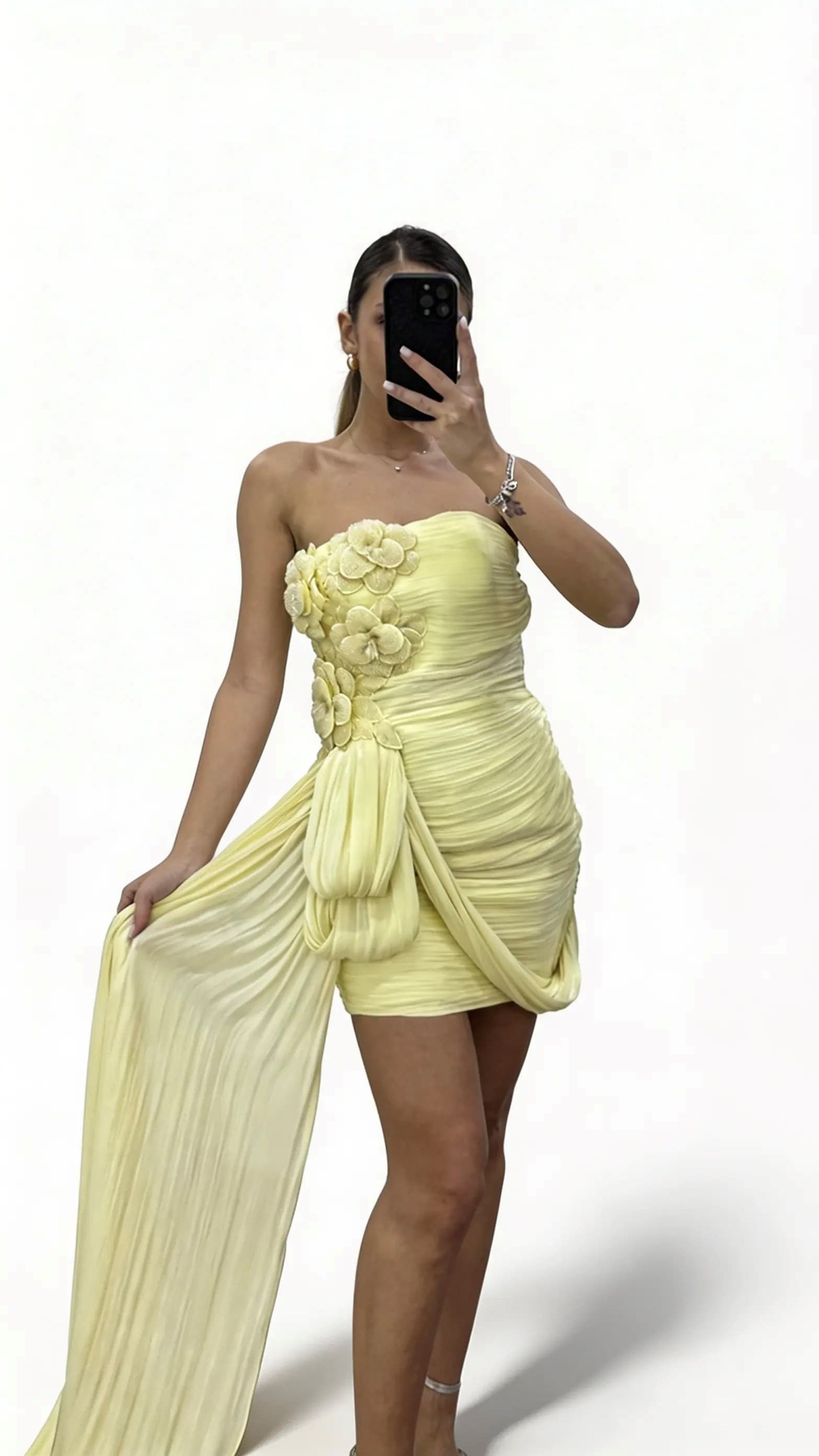 Sarı Straplez Çiçek İşlemeli Şal Detaylı Abiye Elbise