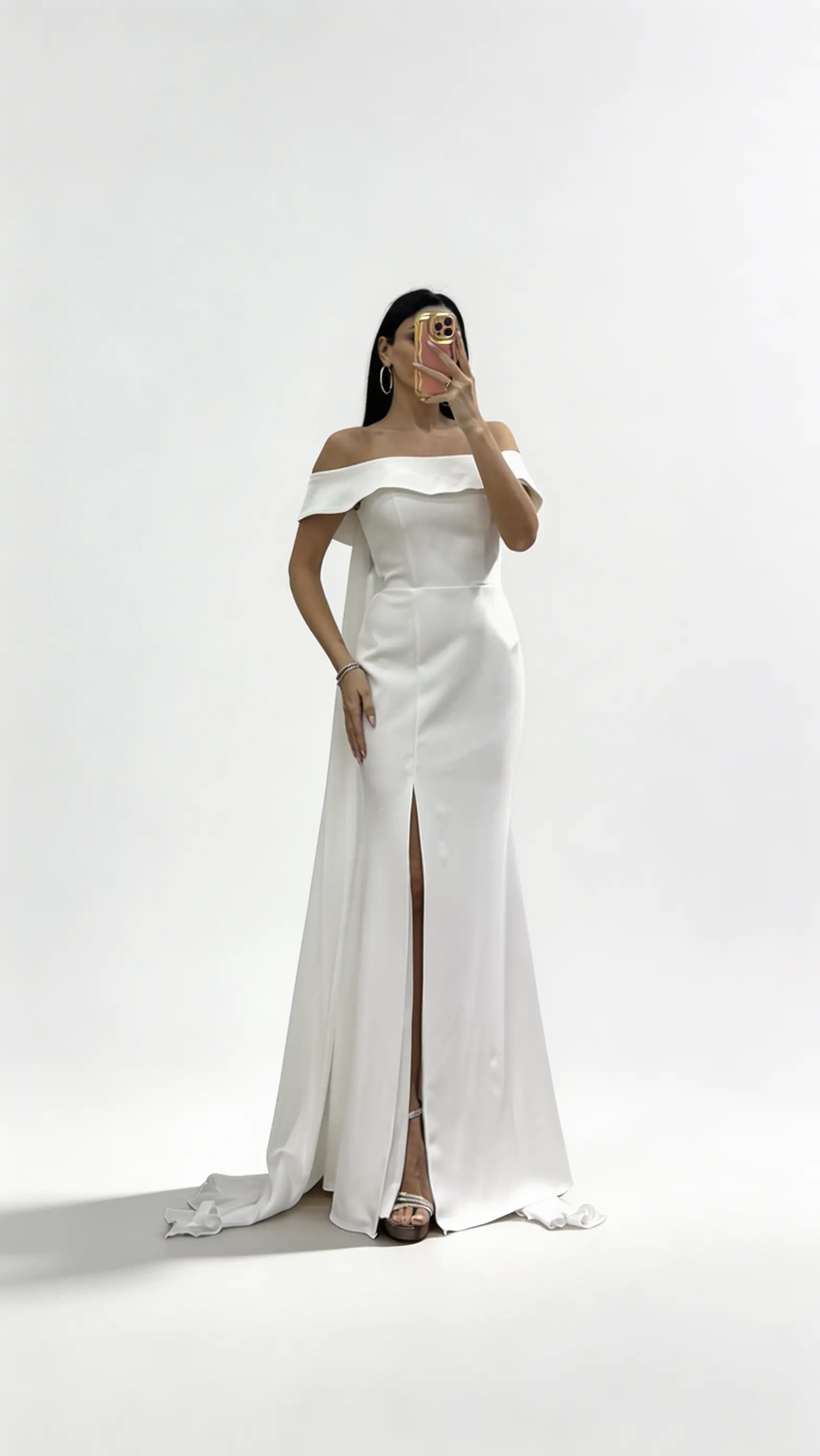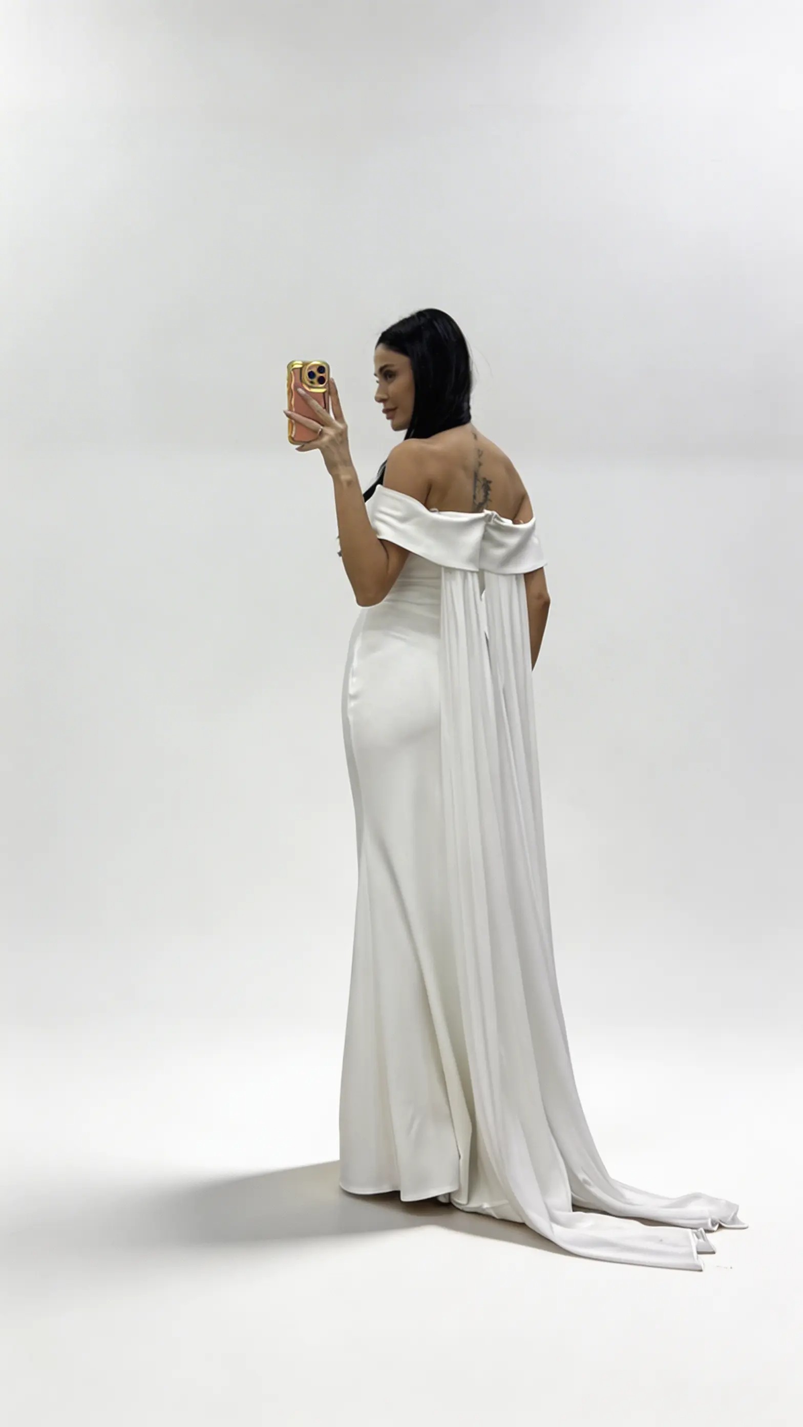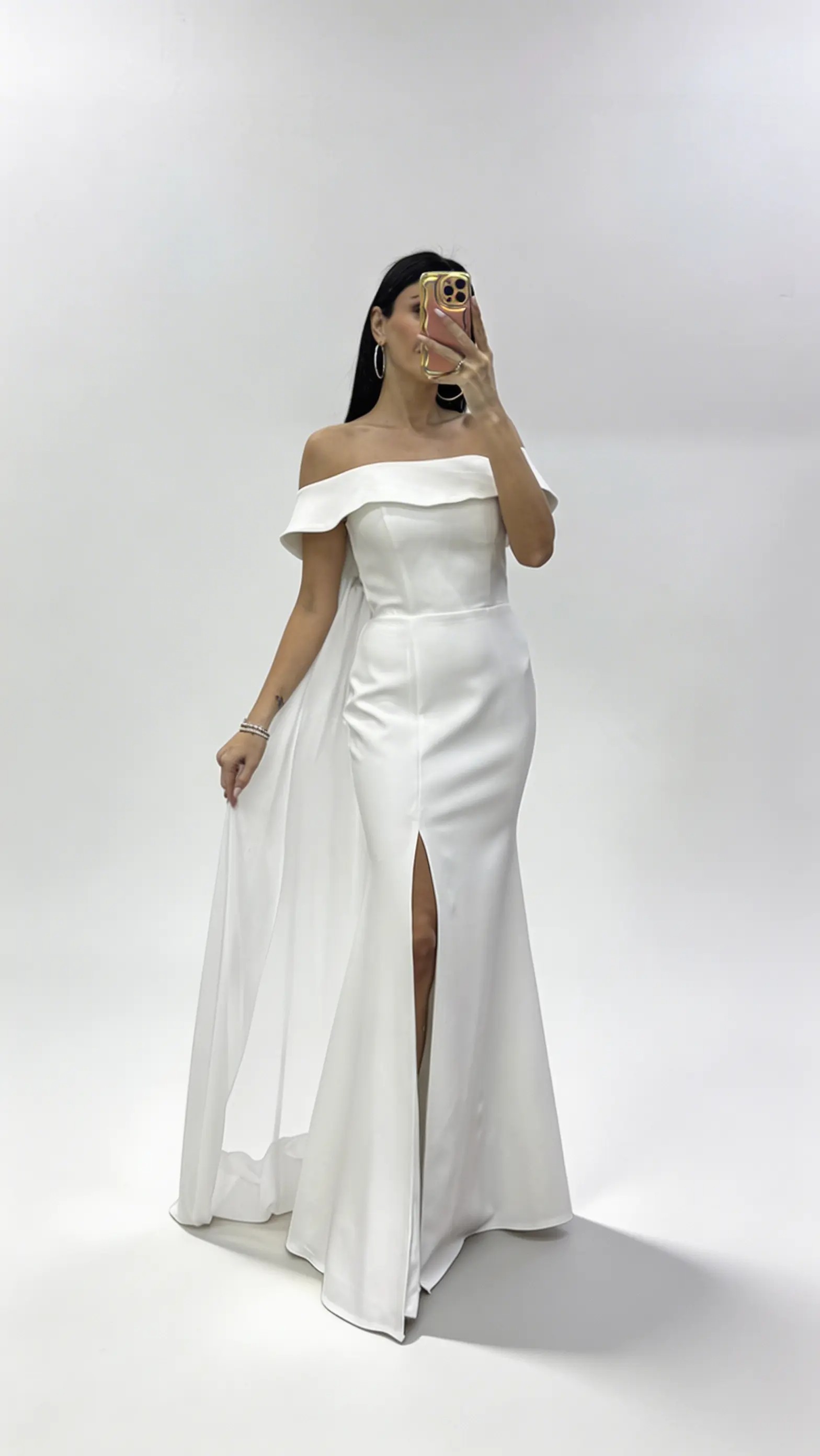 • Beyaz Pelerinli Düşük Omuz  Volanlı Abiye Elbise
