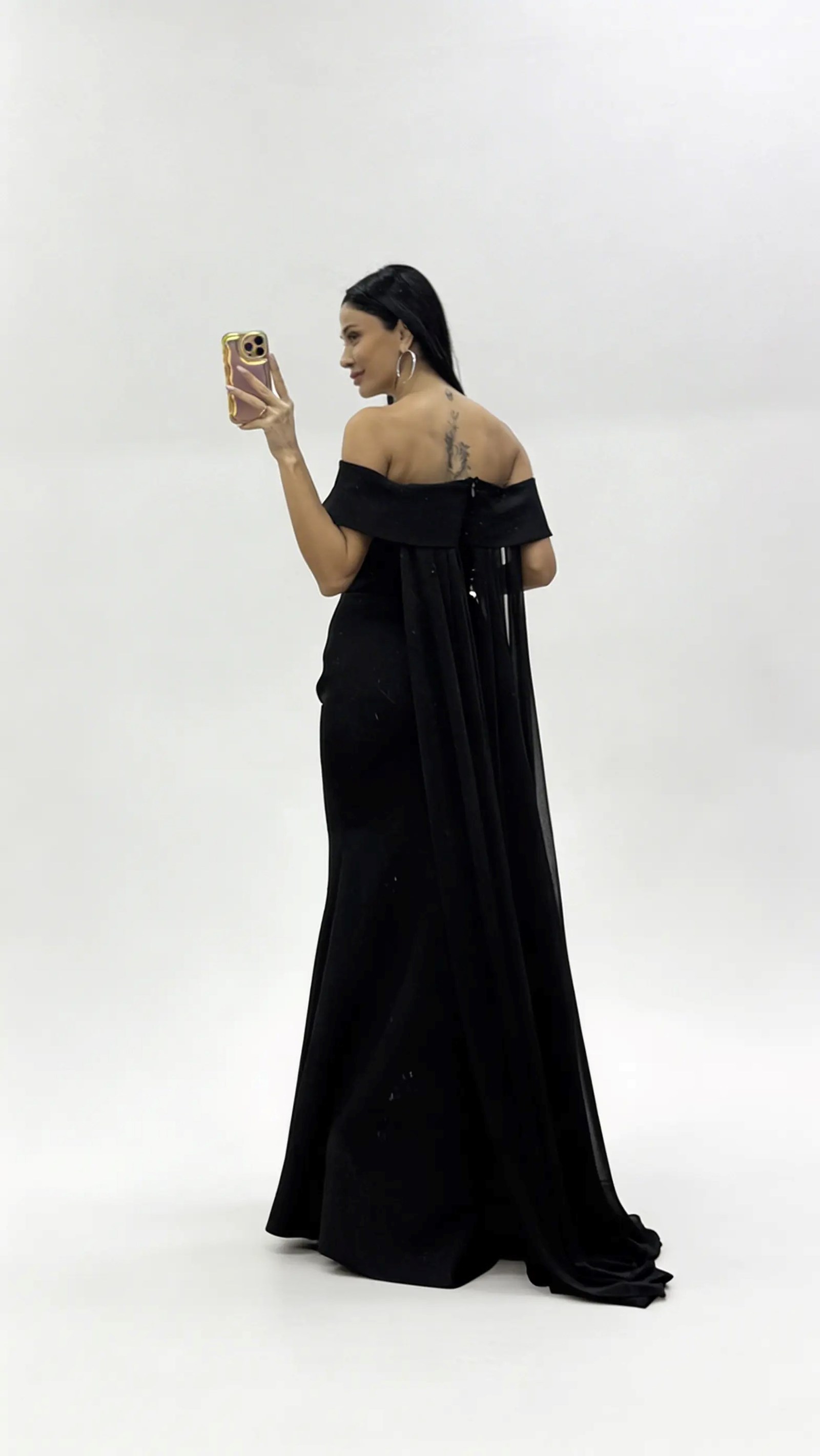 Siyah Pelerinli Düşük Omuz Volanlı Abiye Elbise
